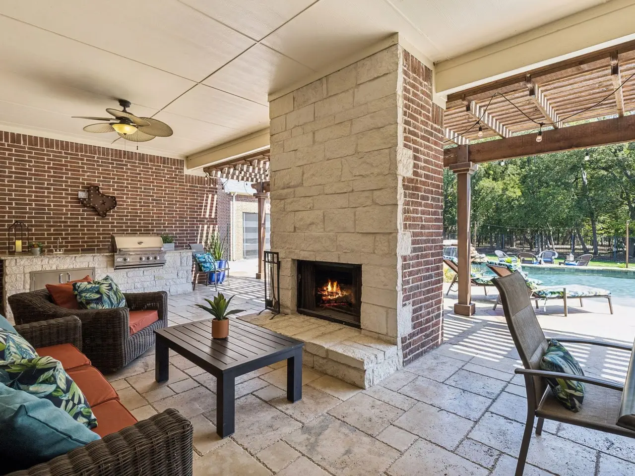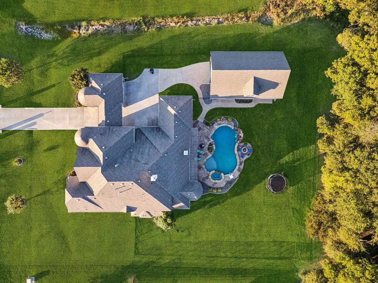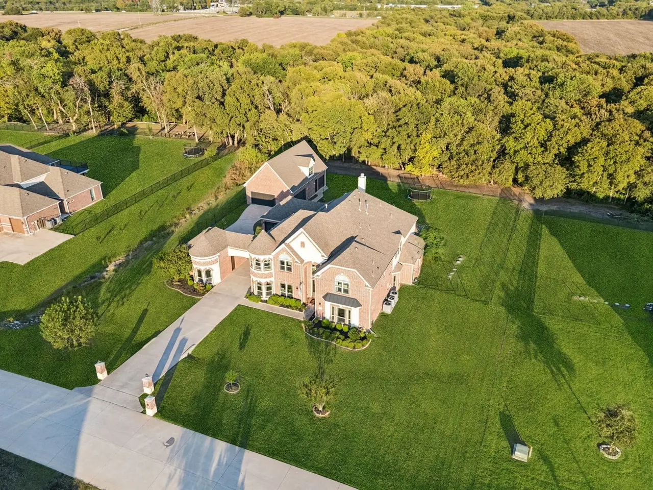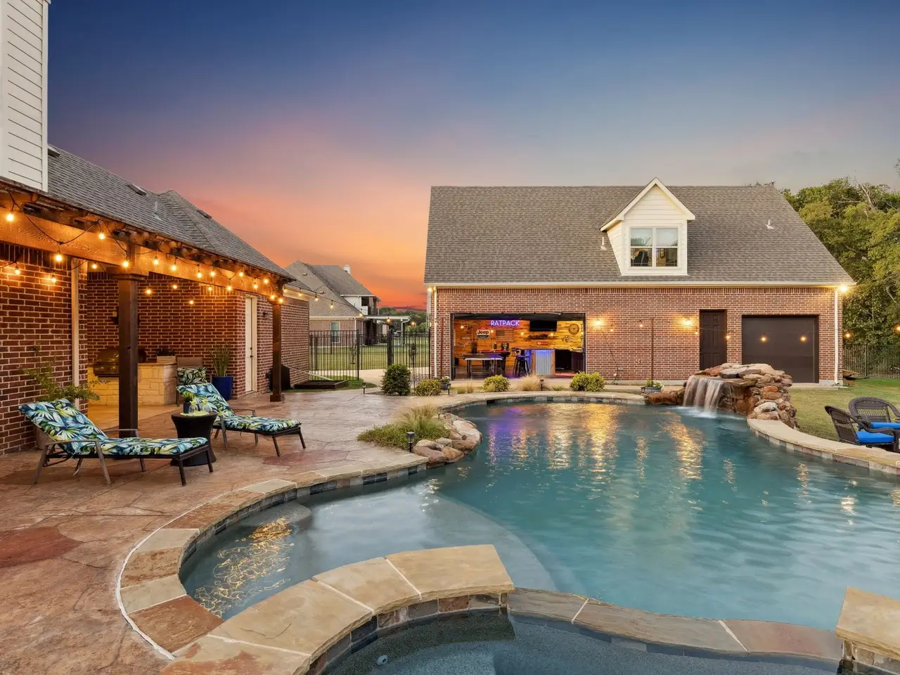 Welcome to your private retreat - an EXTRAORDINARY FAMILY ESTATE OFFERING NEARLY 8000sqft OF COMBINED LIVING SPACE which incl the primary residence plus GUEST HOUSE & ULTIMATE MAN CAVE all nestled on 2.65 acres backing to a serene wooded creek. From the moment you arrive, the striking brick and stone architecture, turret detail, and expansive landscaping set the tone for something truly special. Step inside to soaring vaulted ceilings with wood beams, warm wood floors and brick wall accents. The chef's kitchen is a dream with Electrolux appliances, dbl ovens, granite counters, prep sink, RO water system and abundant cabinetry. Entertain with ease in the oversized living areas, game room & media room with Sony projector, speakers, wet bar and wine fridge. Every detail has been carefully planned from the whole-home water softener and filtration system to the thoughtful layout. Downstairs, the luxurious primary suite awaitsfeaturing a sitting area, spa-inspired bath with stone walls, earthy textures and a multi-head rain shower. The private downstairs in-law suite with full bath is perfect for guests. Upstairs the secondary bedrooms are generously sized. Don't miss the closets that can double as study or hang out spaces! Outdoor resort-style living can be enjoyed year-round amidst twinkling Edison lights. The covered patio and pergola feature a built-in kitchen and FP with plenty of room for dining and lounging. The sparkling pool incl a spa and waterfalls with firepit nearby for cool evenings. The separate guest house not only features a fitness and sports enthusiasts ideal man cave complete with industrial finishes, but also a home office and private guest suite. Amenities include a bar, island, home gym, hardwiring for media and CAT7 for hi-speed network. Parking is abundant with two 2-car garages and porte cochere. This property blends comfort, sophistication, and functionality in a way that's rare to find. Don't miss the chance to experience all it has to offer.