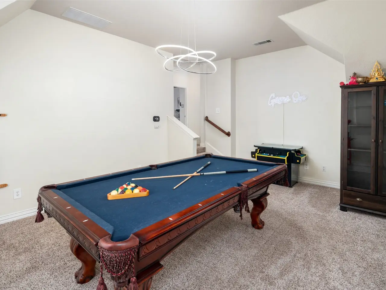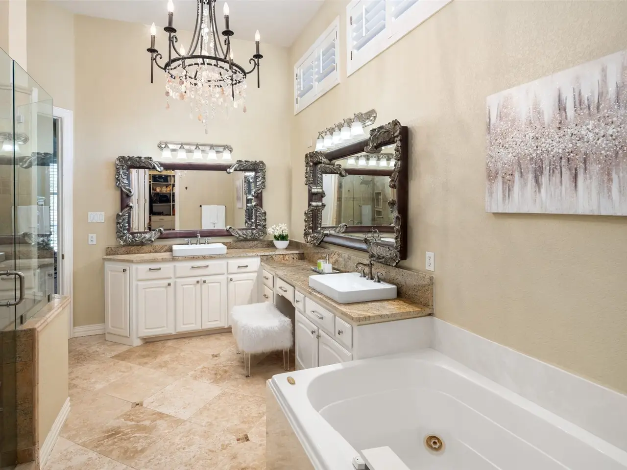 Fabulous Stonebridge Ranch home in highly desirable luxury enclave Wellington Point! Perfectly nestled in this beautiful subdivision on almost half an acre providing a resort level experience w-multiple poolside seating areas, firepit, outdoor kitchen + grill + large covered patio & huge grassy yard perfect for sports, play, pets, daydreaming &fun! Primary Bedroom & Guest Suite downstairs. Walking inside you are greeted with a private Office w- french doors, built in cabinetry & plantation shutters w-great views of the landscaped large front yard. Also off the entry is the Dining Room w-new chandelier & to the left a formal living, conversation or music room with soaring ceilings & fireplace w-gas logs. Spacious Primary Bedroom is on the back right of the home & transitions nicely away from everything else providing a true private retreat complete w-sitting area and views of the backyard. Primary Bathrm has separate vanities, soaking tub and walk in shower + large walk in closet. The Dining Room has been opened up to have access on either side of the Kitchen & Breakfast Nook. Entry into the Kitchen is preceded by a Butler's Pantry that provides a long granite countertop perfect for serving food, drinks or great prep space & has glass front cabinetry on top & bank of cabinets on bottom. The Kitchen has been updated with fresh paint, backsplash, cabinet paint+ hardware, and lighting. Breakfast nook is perfectly sized & provides sweeping views of the backyard oasis + patio and is open to the kitchen & family rm. Family Rm has a 2 story fantastic stone fireplace surround & is oversized allowing plenty of room for family and friends. To the left of the family room is the beautifully updated Guest Full Bath w-access to backyard, Family Rm & Guest Rm. 2nd staircase leads to the huge Game Room w-Half Bath, Media Room w-sconce lighting and 2 Guest Bedrooms that have been updated and are Jack & Jill Baths w-sep vanities. Both Guest Bedrms overlook the backyard. More below