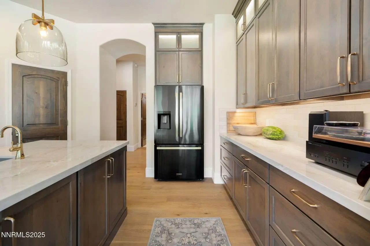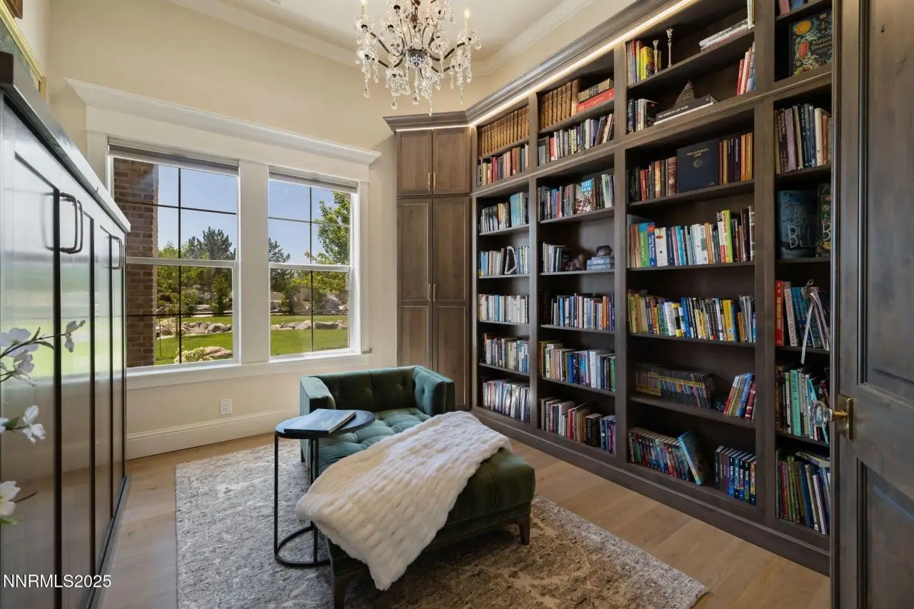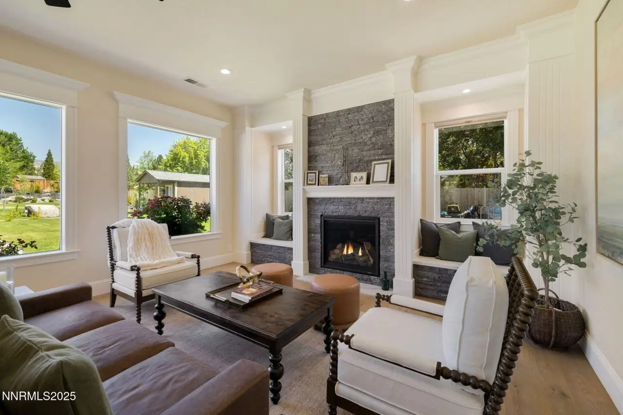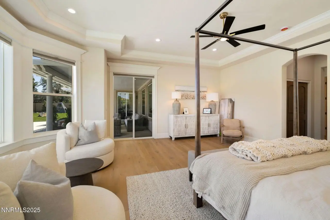 Completely remodeled inside and out, this luxurious single-story home in Spanish Springs sits on a 1.25-acre corner lot in a quiet cul-de-sac, offering the feel of your own private resort. With 3,510 square feet of thoughtfully designed space, the home features four bedrooms, three bathrooms, and a library. The chef's kitchen is the heart of the home, equipped with top-of-the-line ZLINE appliances including an 8-burner dual oven range, stone countertops, ceiling-height cabinets with lighting, Pottery Barn island lighting, a new backsplash, and a remodeled walk-in pantry. The spacious primary suite offers dual walk-in closets, heated tile floors, a cast iron soaking tub, an oversized dual-head shower with floor-to-ceiling stone, glass doors and walls, a heated bidet toilet, custom Omega cabinetry, stone countertops, and private backyard access. Additional highlights include European White Oak stained hardwood flooring, new carpet, custom Closets by Design systems in all bedrooms, fully renovated bathrooms, new blinds, crown molding, new baseboards, new ceiling fans, recessed lighting, a full security system, reverse osmosis drinking water, and a beautifully updated laundry room with dual washers and dryers. The library features a built-in queen-size Murphy bed and a hidden safe room with a concealed door. Step outside to resort-style amenities including a Latham pool with waterslide, spill-over Royal Spa hot tub, custom firepit, new pavers, pergolas, retaining walls, ambient lighting, a fountain with rock feature, lush landscaping with both natural and artificial turf, and mature trees. Three outdoor units include a renovated clubhouse, private office, and utility sheds. With countless additional upgrades throughout, this is a home that truly must be seen and experienced in person - prepare to be wowed! Welcome home!