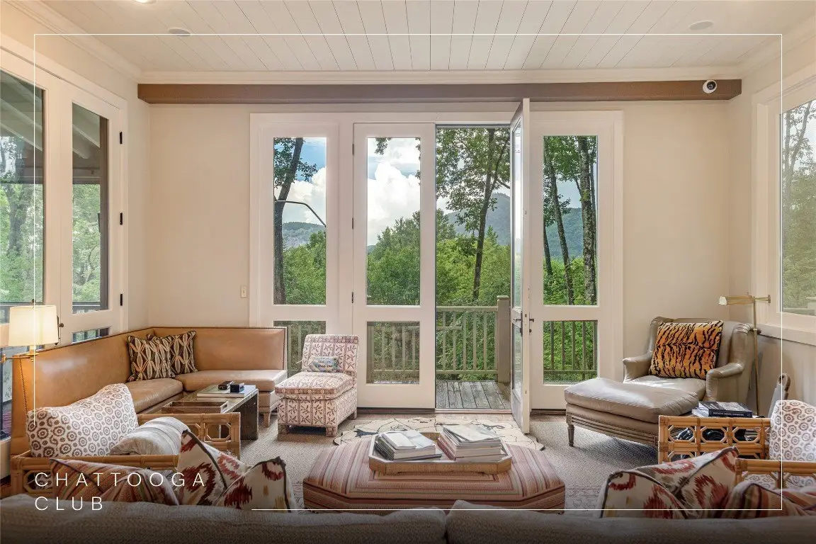 Enjoy peace and privacy on 1.87 acres of secluded forest in the gated Chattooga Club neighborhood. This property boasts a stunning stone entryway and immaculately manicured paths that lead to the most comfortable living on the Plateau. The great room offers a space to relax with a stacked stone fireplace and long-range views of Chimney Top and Rock Mountains, while the expansive screened-in deck is an ideal spot to enjoy the sights and sounds of nature with family and friends. The spacious kitchen features an island that’s perfect for entertaining with top-of-the-line appliances and modern cabinetry. On the main level, the luxurious primary suite features a fireplace, an attached sunroom, and a generous ensuite bathroom with a walk-in shower, a walk-in closet, and its own laundry space. Upstairs, there are two guest bedrooms with ensuite bathrooms, a cozy sitting room, and a bonus room. The lower level features a bedroom with an ensuite bathroom and an additional living space with a wet bar that connects to the wine cellar. There is also a detached guesthouse over the garage with a cozy sitting room, a kitchenette, and a private bedroom with bathroom, providing privacy for family members or guests and connecting to the main house via a short covered walkway. Along with its breathtaking views, the property comes with a vacant lot that backs up to the house, a waterfall, picturesque grounds, a screened-in standalone pavilion with a fireplace, a grill, and ample space to relax and enjoy the sounds of the running water. Located just two miles — a 5-8-minute drive — from the crossroads and all the shopping and dining amenities, this exquisite home offers everything that’s needed to enjoy a refined mountain lifestyle.