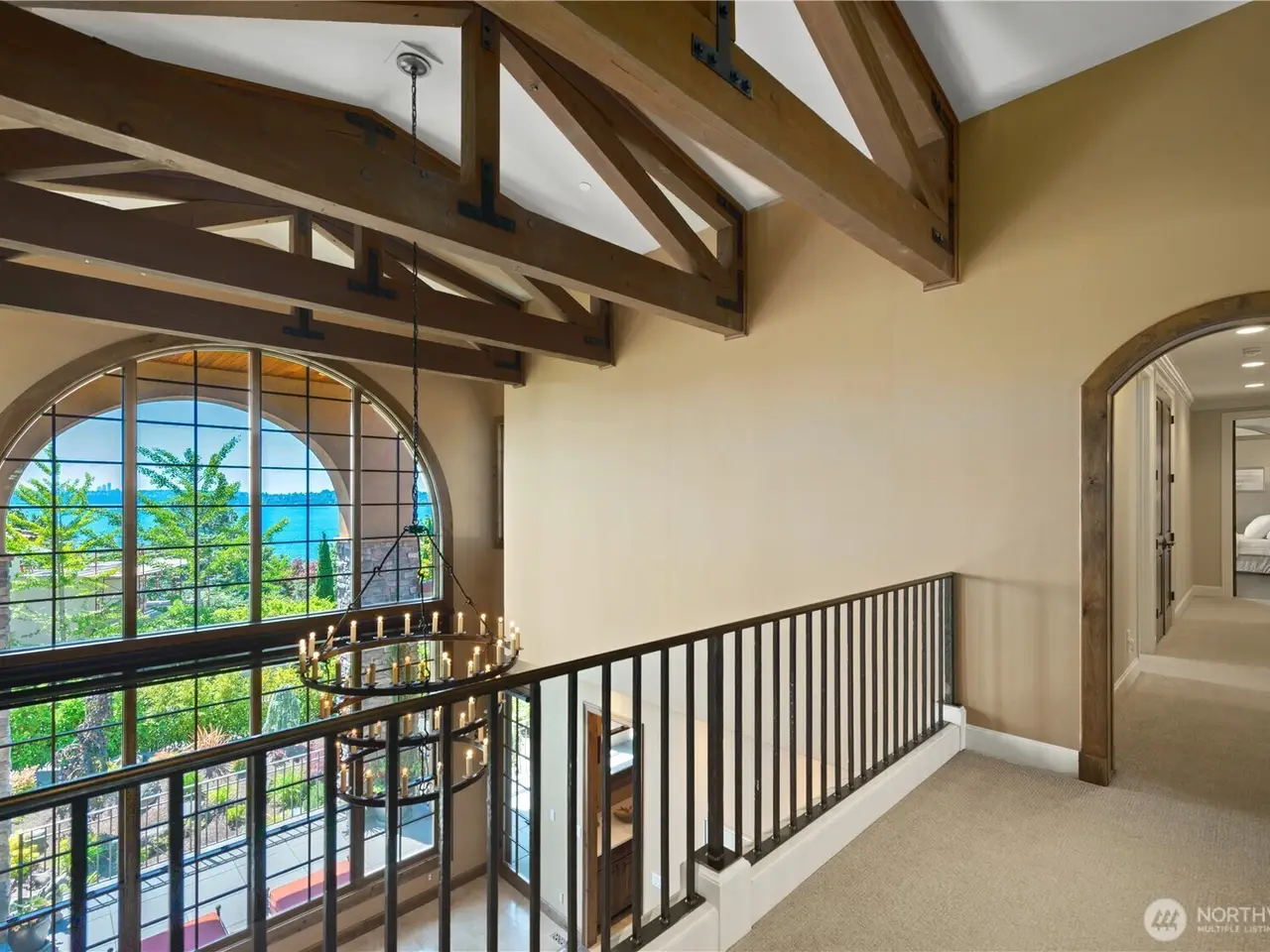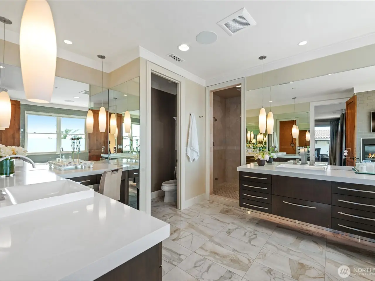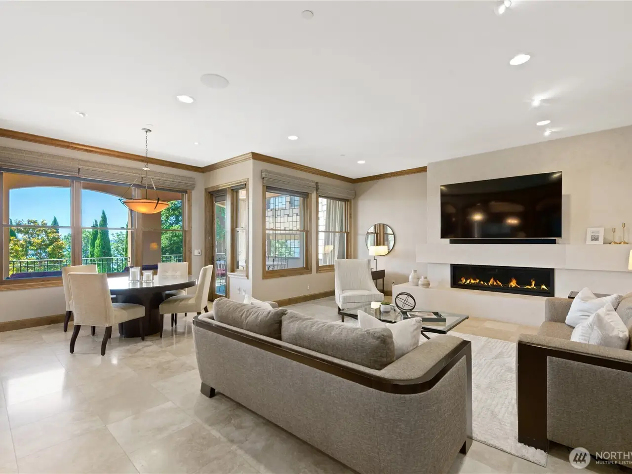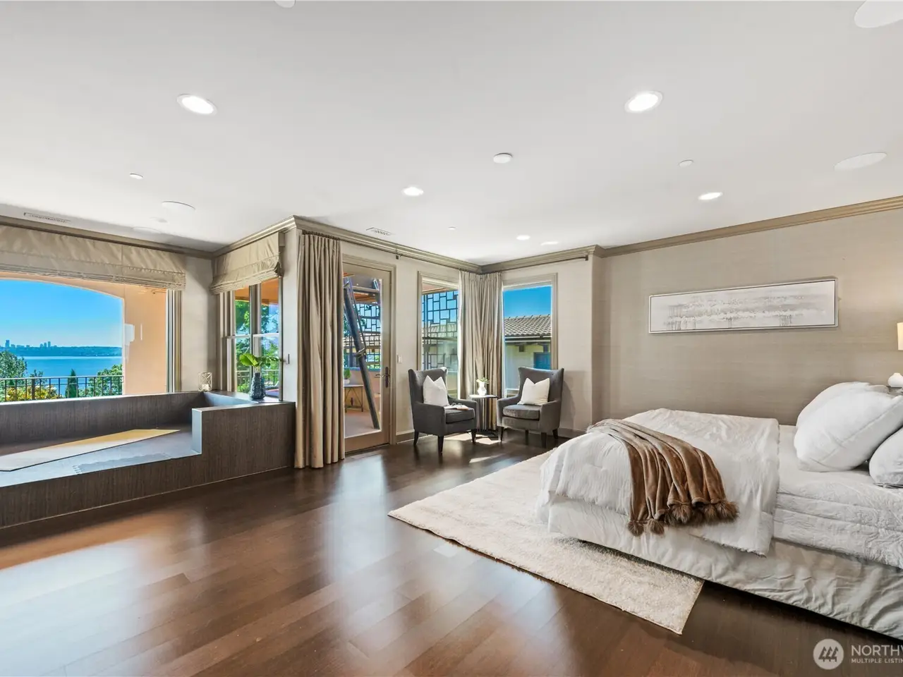 This exquisite view estate embodies luxury living with exceptional design, premium materials, and thoughtful craftsmanship. Glorious views of Lake Washington, city and mountains. The main level welcomes you to formal living and dining, stunning kitchen with large family room, handsome office and ensuite bedroom. The upper level hosts 2 flex space rooms plus 4 ensuite bedrooms all with individual access to decks including the significant primary suite. The lower level is incredible entertaining space with theatre room, rec room, family room, wine room, bar and ensuite bedroom. Elevator services all 3 floors. Parking for 6 cars between 2 garages. Beautifully designed landscape with water feature and lighting creating lovely ambiance.