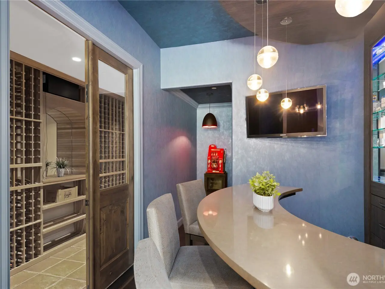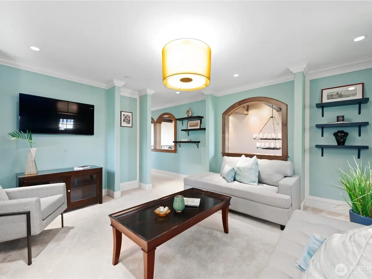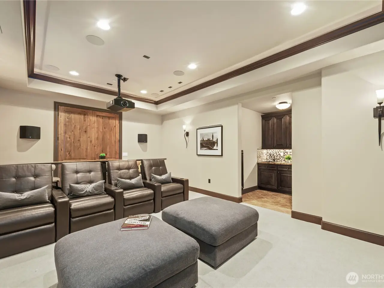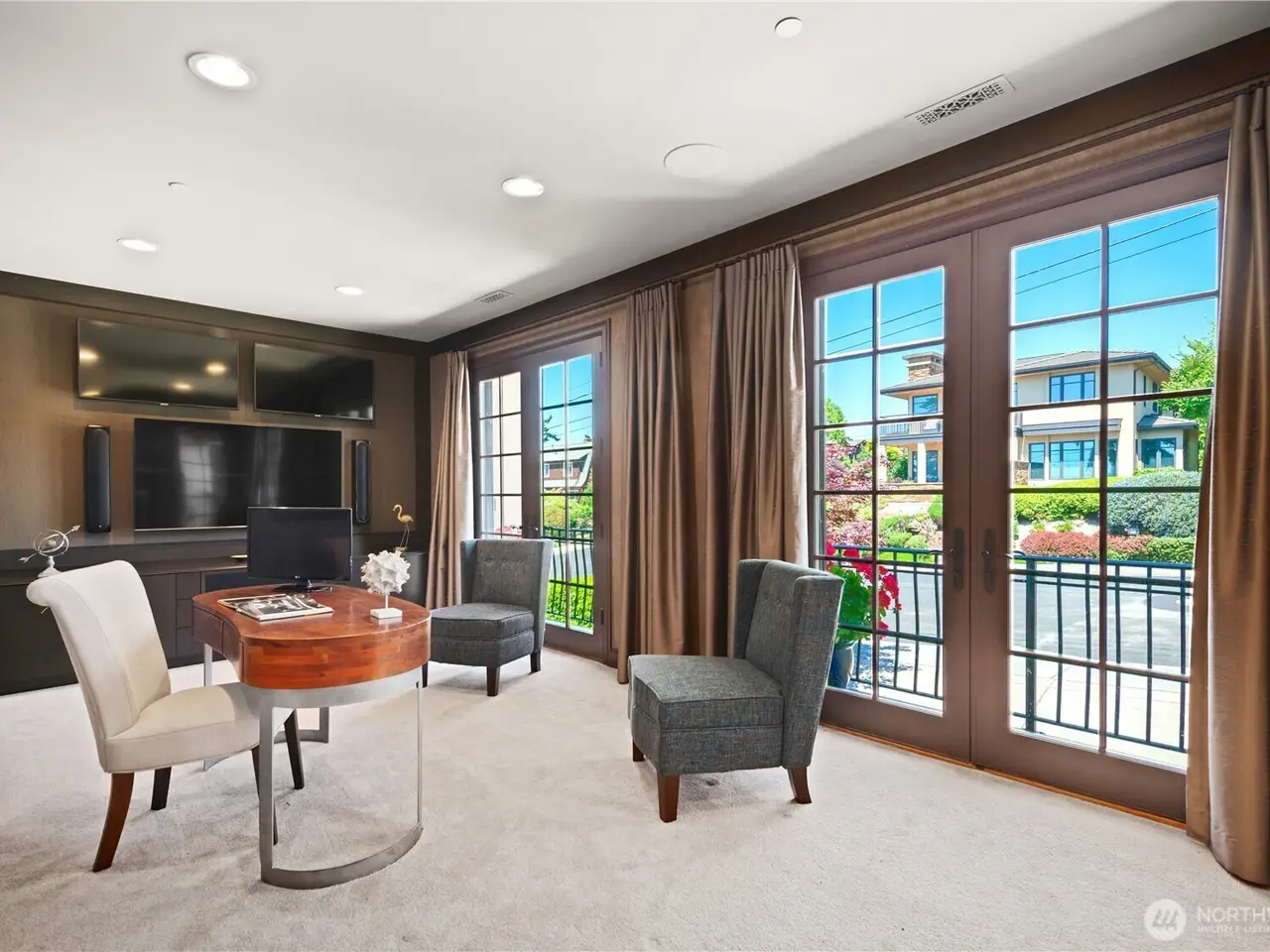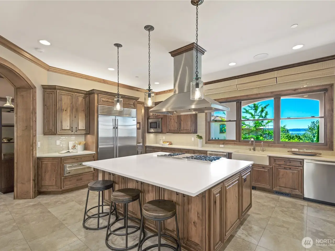 This exquisite view estate embodies luxury living with exceptional design, premium materials, and thoughtful craftsmanship. Glorious views of Lake Washington, city and mountains. The main level welcomes you to formal living and dining, stunning kitchen with large family room, handsome office and ensuite bedroom. The upper level hosts 2 flex space rooms plus 4 ensuite bedrooms all with individual access to decks including the significant primary suite. The lower level is incredible entertaining space with theatre room, rec room, family room, wine room, bar and ensuite bedroom. Elevator services all 3 floors. Parking for 6 cars between 2 garages. Beautifully designed landscape with water feature and lighting creating lovely ambiance.