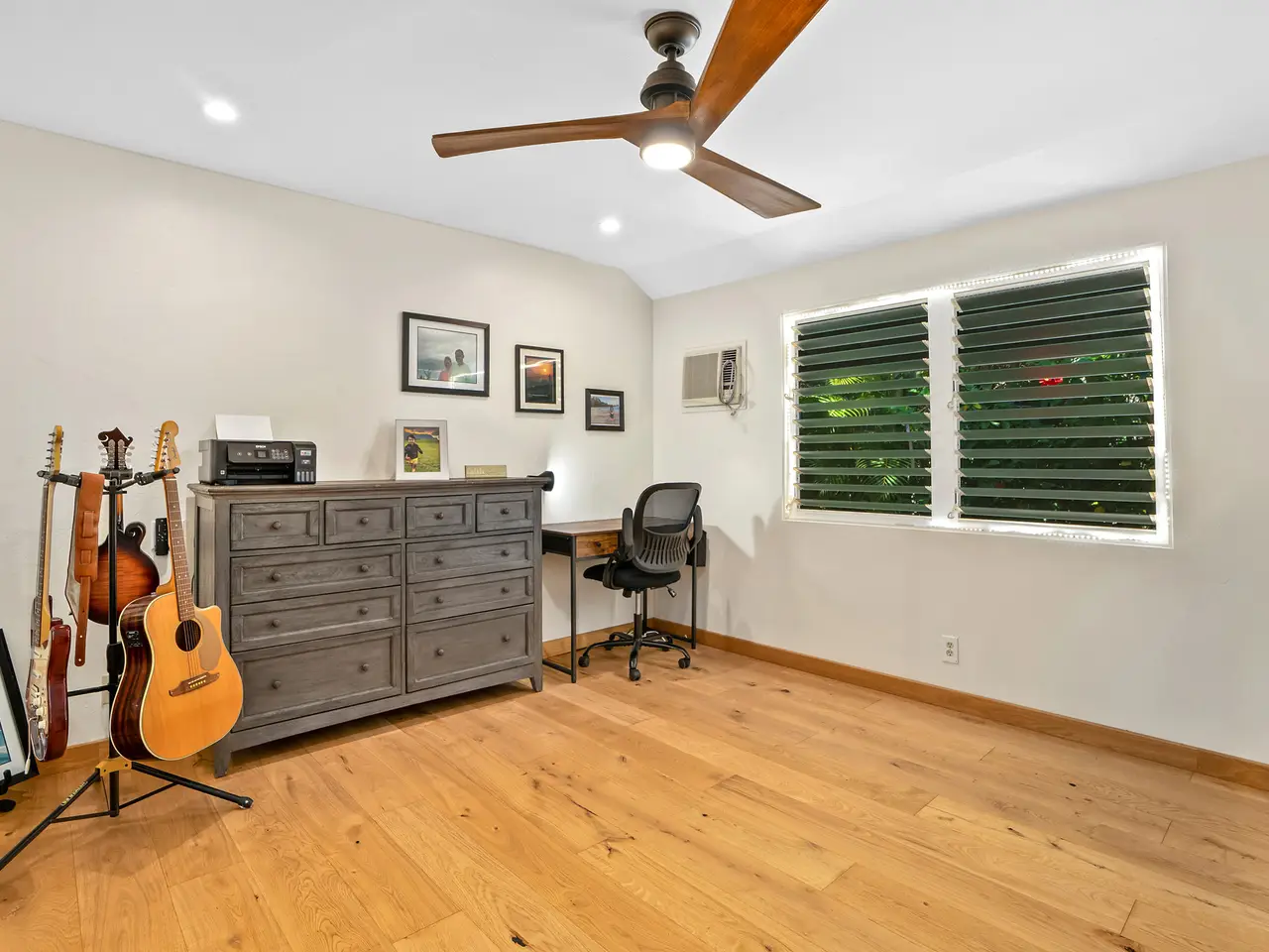 Nestled within a tranquil cul-de-sac, this expansive two-bedroom, two-bathroom residence embodies the essence of island living. Enveloped by the serene 2.5-acre sanctuary of Mili Makani Park. This home offers a rare blend of mountain vistas and seclusion, a testament to understated luxury in a coveted neighborhood. The heart of the home has a generously appointed kitchen, which boasts a Monkeypod bar counter, abundant storage, an induction stovetop, with ample countertop space, and flows seamlessly into the light-filled living and dining areas. Vaulted open-beam ceilings and walls of windows bring the outdoors in. A screened-in lanai invites you to savor gentle breezes, morning sunrises, and vibrant evening sunsets. Together with the interior, the home offers approximately 1,510 sq. ft. of harmonious living space. Fully Furnished with elegant Hawaiian-inspired decor that perfectly complements the tropical surroundings. In addition, recently adorned with pristine white oak hardwood flooring and interior and exterior paint. Retreat to the primary bedroom featuring an en suite bathroom with a walk-in shower and dual sink vanity. Walk out to your private outdoor oasis shower, and a new hot tub adds to your daily relaxation while watching the stars overhead. The secondary bedroom and bath offer spacious accommodations with recent updates. Additional highlights include a two-car garage, custom hurricane shutters, and a lush yard with lime, banana, and breadfruit trees surrounded by tropical flowers. While not currently a vacation rental, the property lies within the Visitor Destination Area (VDA), offering the opportunity for vacation rental eligibility. The sellers are currently accepting backup offers.