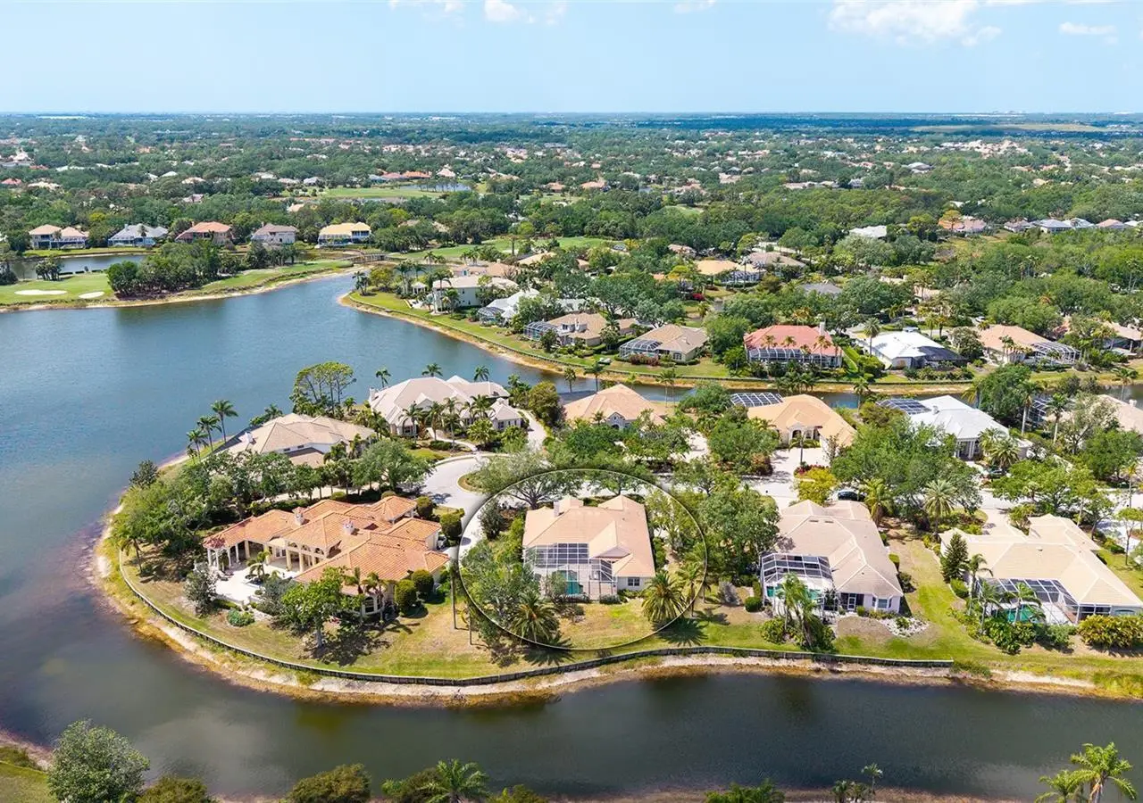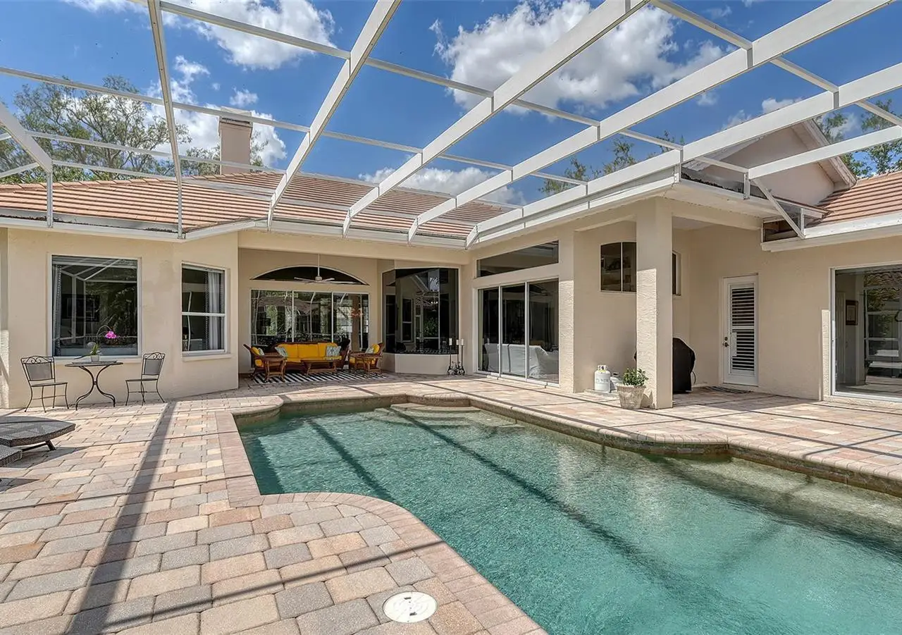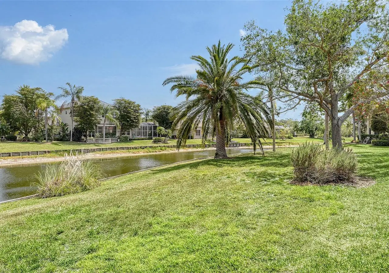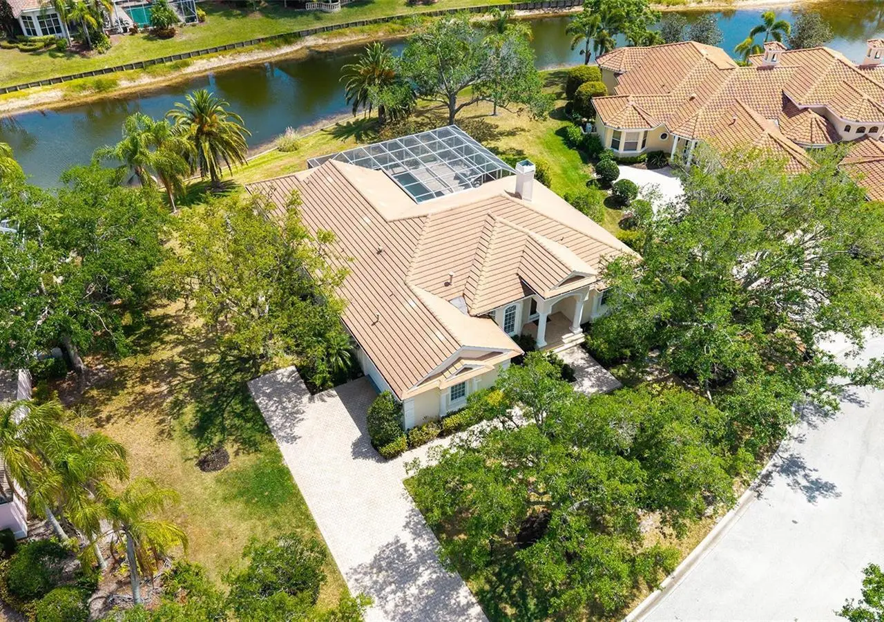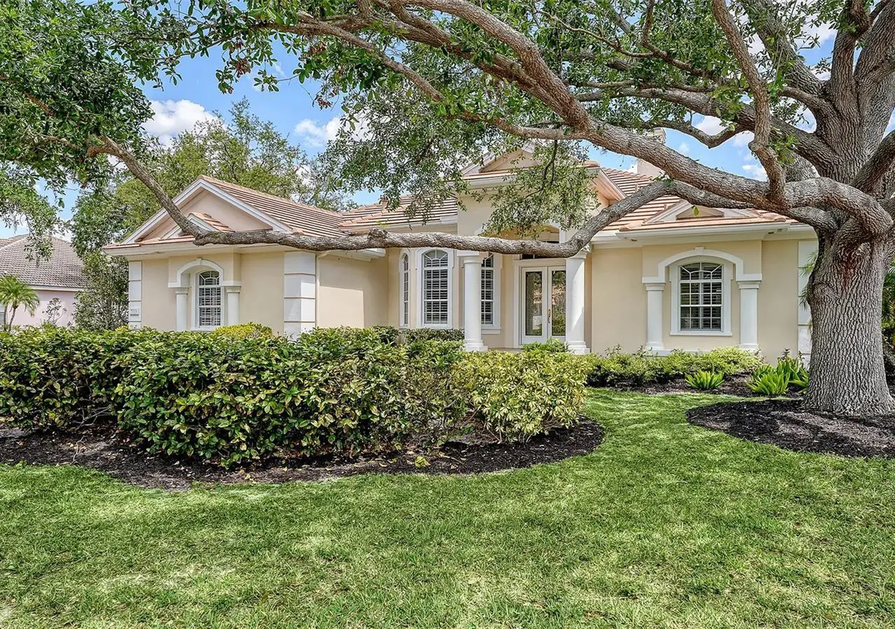 Hyde Park, an enclave of only 12 homes inside the gates of University Park Country Club, sets itself apart for the larger homesites where home sizes vary from 3,000-5,600 sq feet. This home sits on a serene HALF-ACRE and on the water. Slow down and enjoy the drive and lush landscaping throughout the community and arrive in this scenic and charming neighborhood. This home is graced with a beautiful entry of leaded glass doors and custom details throughout. A classic floorplan with an open family room/kitchen that has been updated with timeless finishes. Side entry garage, paver driveway and paved walkway to the entry. (TILE ROOF REPLACED: 2015). Foyer opens to the living and dining room and this home is saturated in natural light with tall windows and sliding glass doors to the pool area. Flooring is 18-inch diagonal tile; soaring ceilings and crown moldings. A feature that sets this welcoming home apart is a floor-to-ceiling striking wall of bookcases enhanced by accent lighting. Fully equipped and well-appointed kitchen; a wet bar and a walk-in pantry. A charming breakfast nook overlooks the pool with an aquarium glass window. Split bedroom plan includes a spacious primary suite with two custom closets, a stunning renovated bathroom with dual granite vanities, walk-in shower, marble flooring, and a private water closet. Two additional bedrooms plus a versatile fourth bedroom with direct pool access can serve as an office, study or additional living space. The backyard and pool area features an expansive paver lanai, two covered seating areas and room for an outdoor kitchen (natural gas hook-up). The pool overlooks the water and the natural beauty surrounding this home is simply relaxing. Residents of University Park Country Club have access to 27 holes of championship golf, tennis and pickleball courts, state-of-the-art fitness center, walking trails, and a wide variety of social activities, all within a secure, gated community. Located just minutes from downtown Sarasota, UTC Mall, world-class shopping, dining, beaches, and SRQ International Airport, this home offers the ultimate lifestyle in one of Sarasota's most desirable communities.