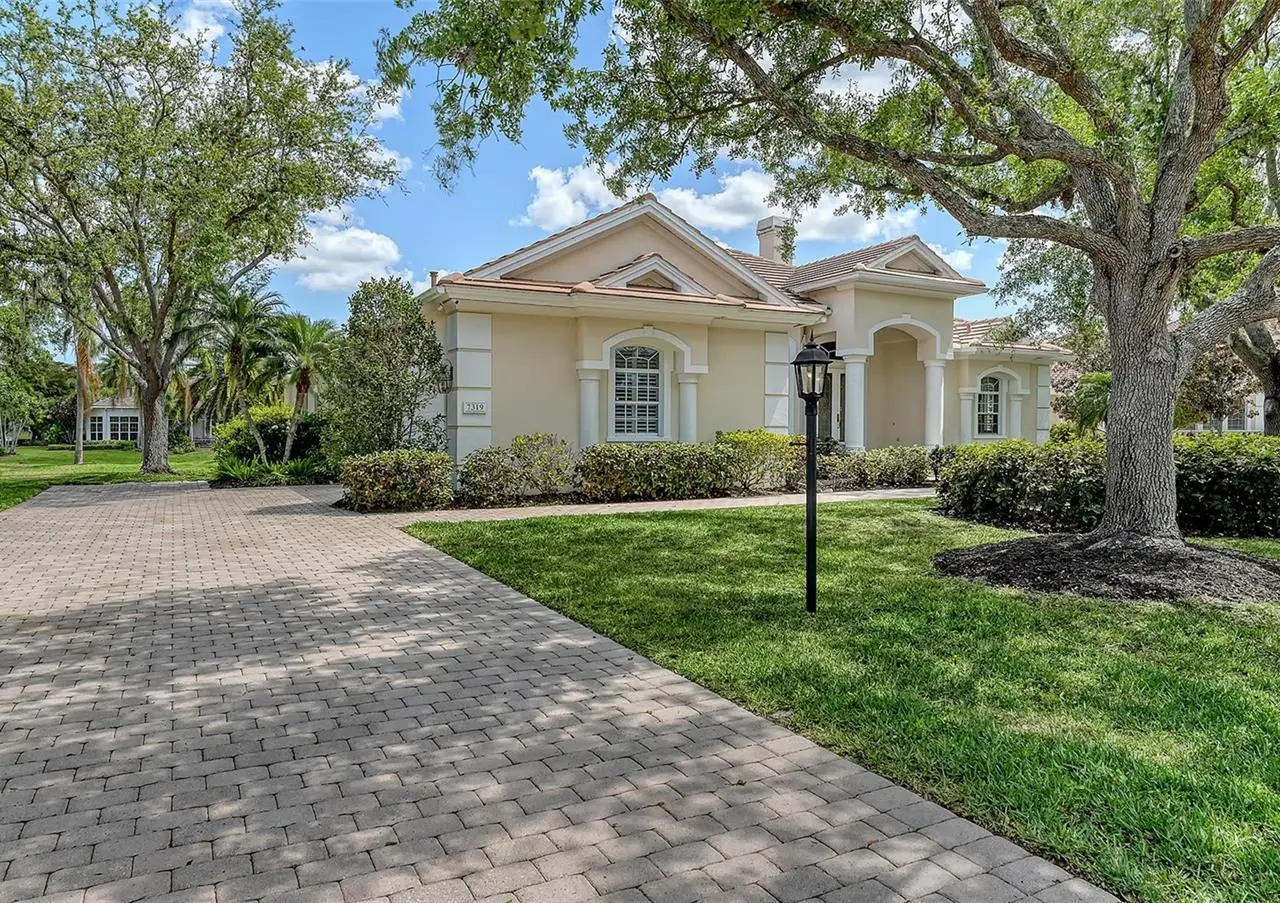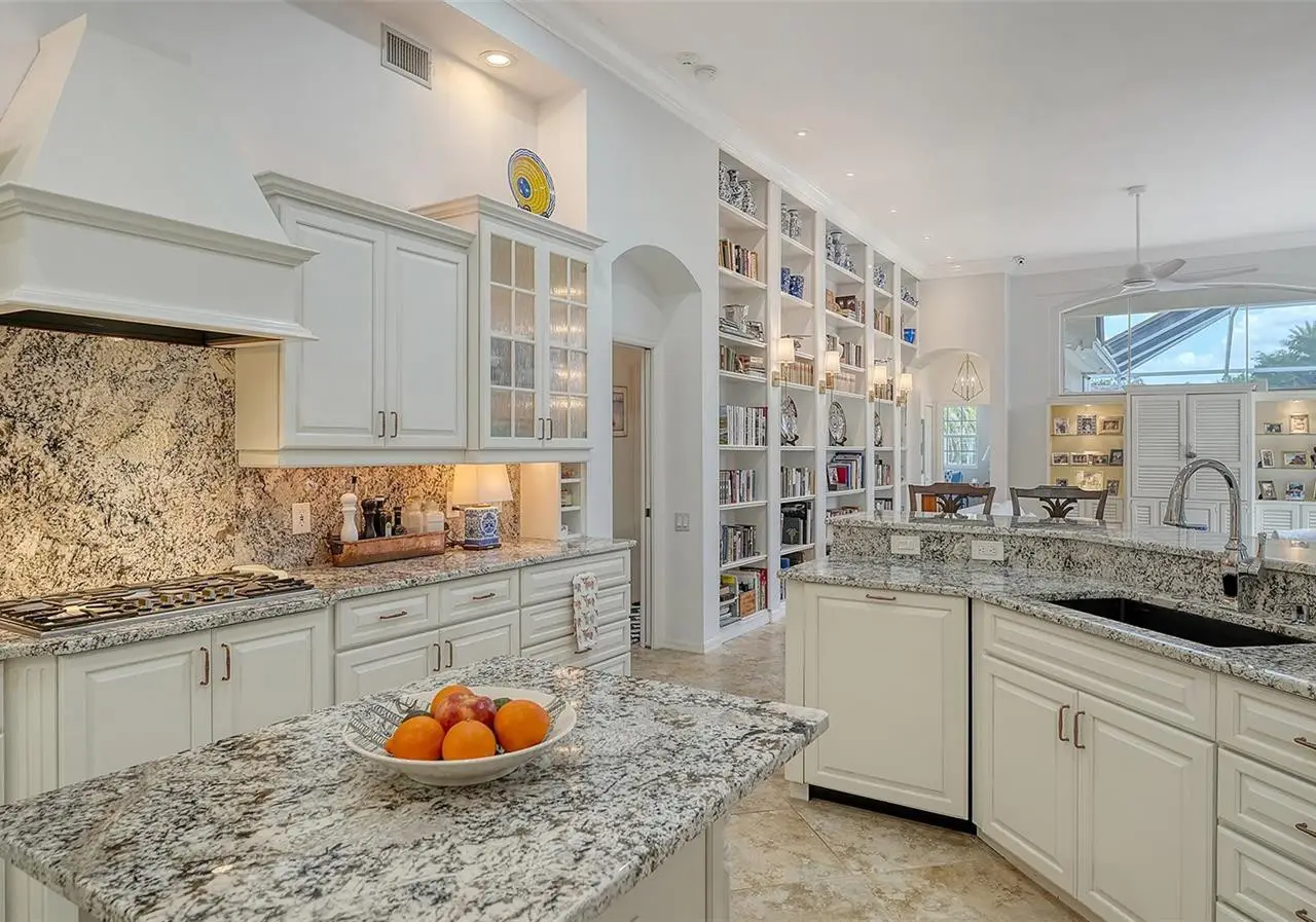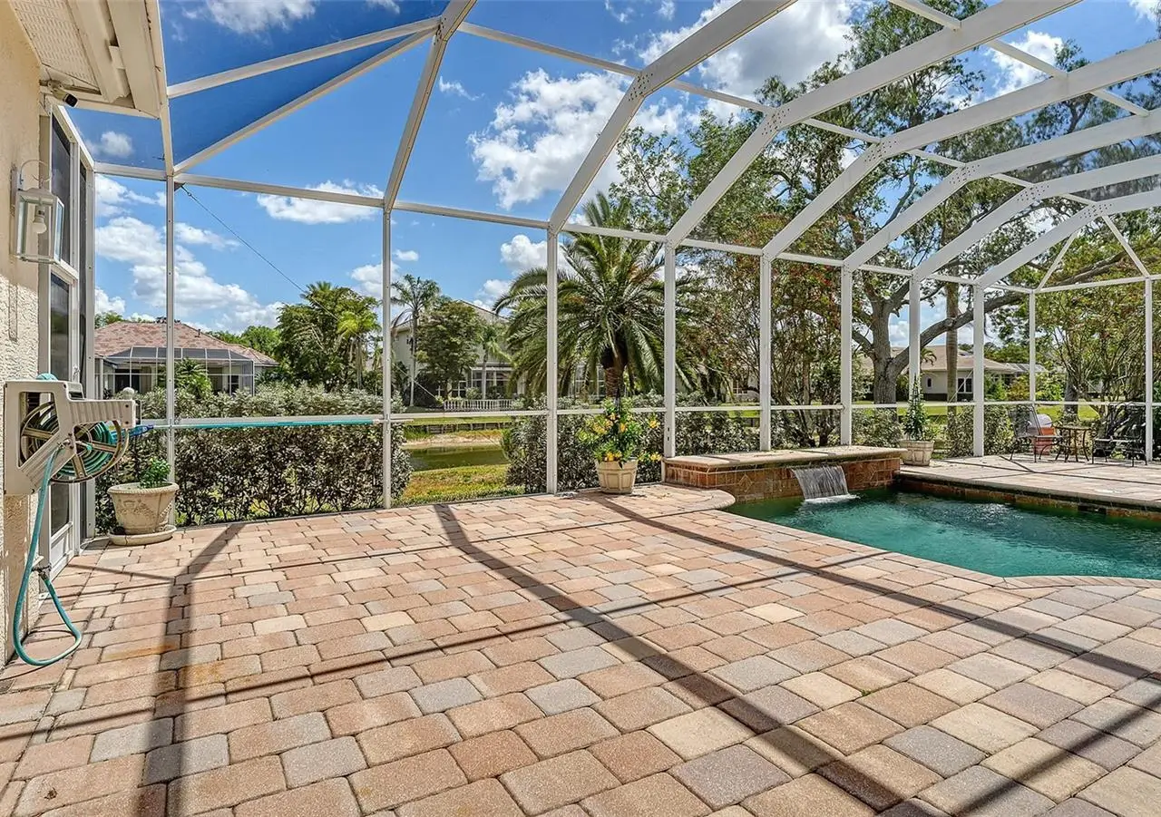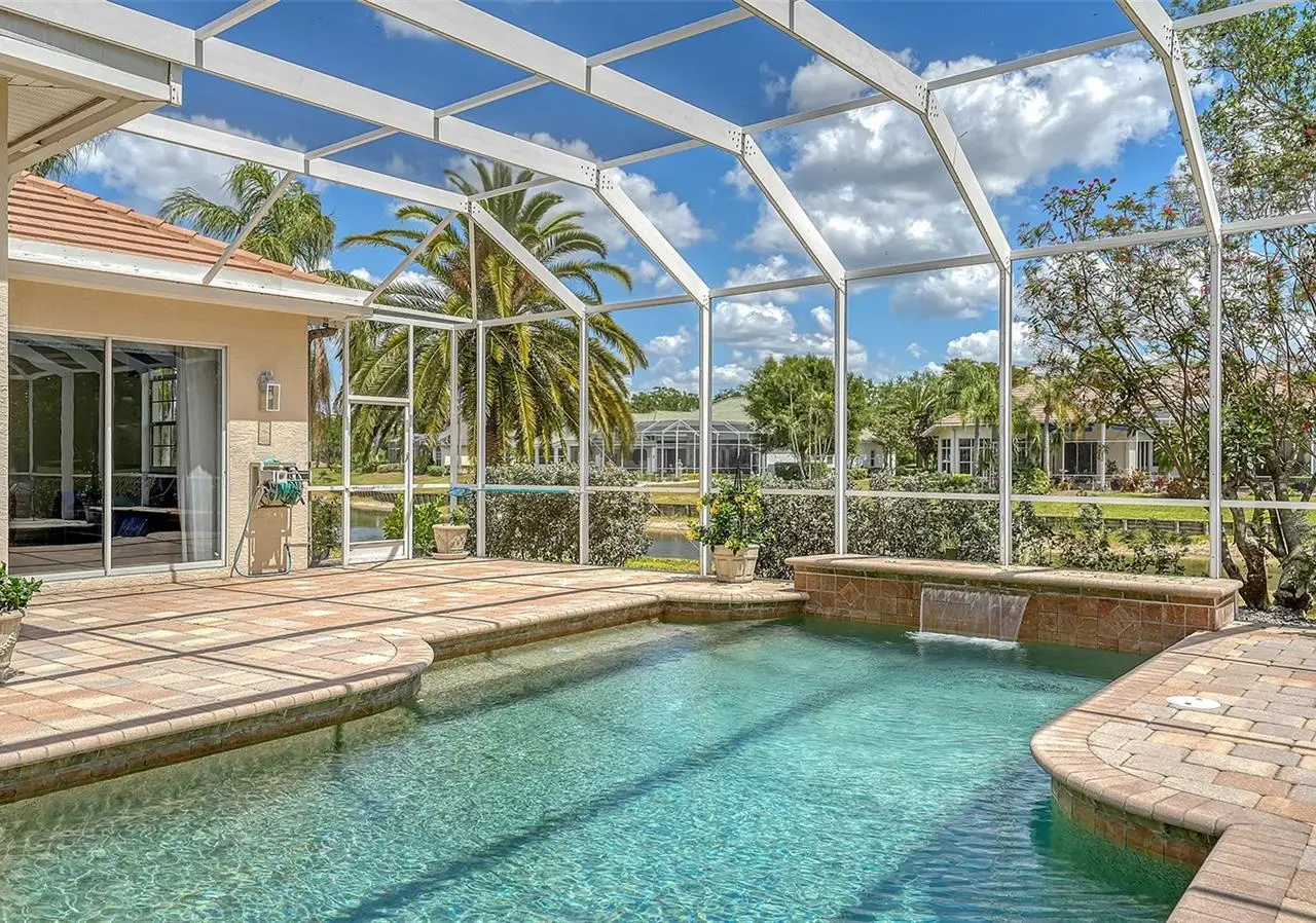 Hyde Park, an enclave of only 12 homes inside the gates of University Park Country Club, sets itself apart for the larger homesites where home sizes vary from 3,000-5,600 sq feet. This home sits on a serene HALF-ACRE and on the water. Slow down and enjoy the drive and lush landscaping throughout the community and arrive in this scenic and charming neighborhood. This home is graced with a beautiful entry of leaded glass doors and custom details throughout. A classic floorplan with an open family room/kitchen that has been updated with timeless finishes. Side entry garage, paver driveway and paved walkway to the entry. (TILE ROOF REPLACED: 2015). Foyer opens to the living and dining room and this home is saturated in natural light with tall windows and sliding glass doors to the pool area. Flooring is 18-inch diagonal tile; soaring ceilings and crown moldings. A feature that sets this welcoming home apart is a floor-to-ceiling striking wall of bookcases enhanced by accent lighting. Fully equipped and well-appointed kitchen; a wet bar and a walk-in pantry. A charming breakfast nook overlooks the pool with an aquarium glass window. Split bedroom plan includes a spacious primary suite with two custom closets, a stunning renovated bathroom with dual granite vanities, walk-in shower, marble flooring, and a private water closet. Two additional bedrooms plus a versatile fourth bedroom with direct pool access can serve as an office, study or additional living space. The backyard and pool area features an expansive paver lanai, two covered seating areas and room for an outdoor kitchen (natural gas hook-up). The pool overlooks the water and the natural beauty surrounding this home is simply relaxing. Residents of University Park Country Club have access to 27 holes of championship golf, tennis and pickleball courts, state-of-the-art fitness center, walking trails, and a wide variety of social activities, all within a secure, gated community. Located just minutes from downtown Sarasota, UTC Mall, world-class shopping, dining, beaches, and SRQ International Airport, this home offers the ultimate lifestyle in one of Sarasota's most desirable communities.