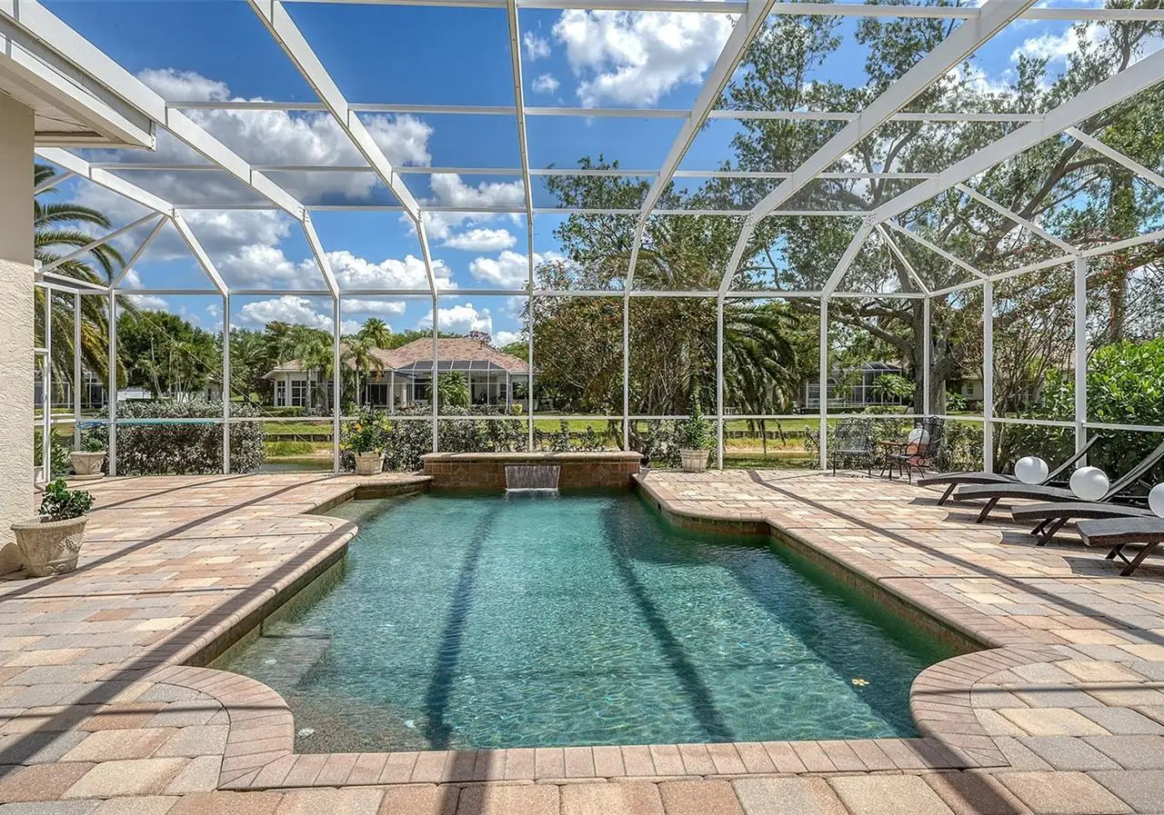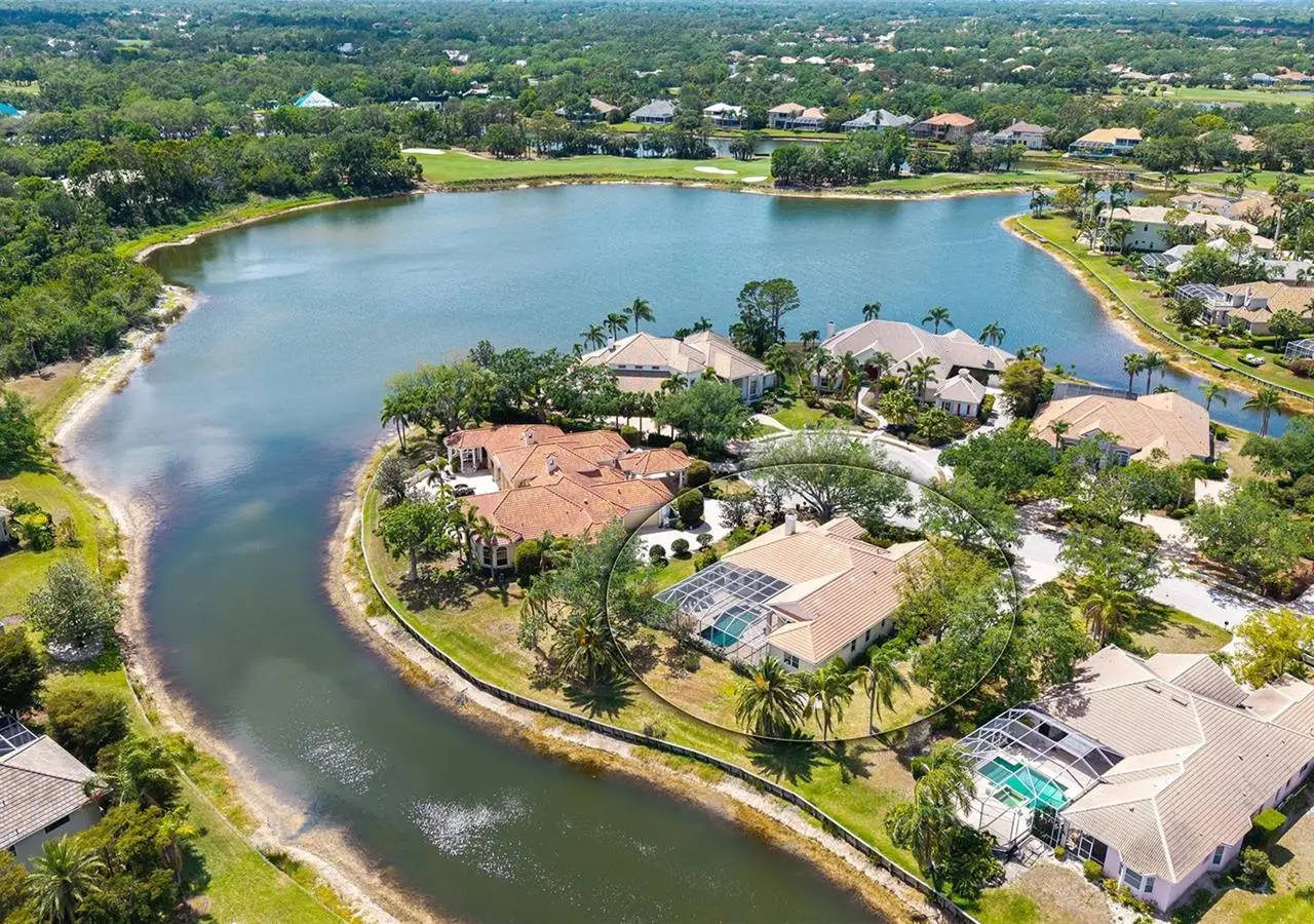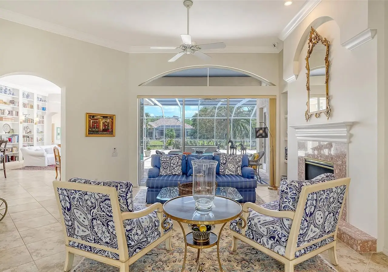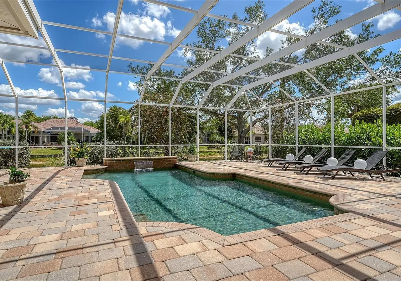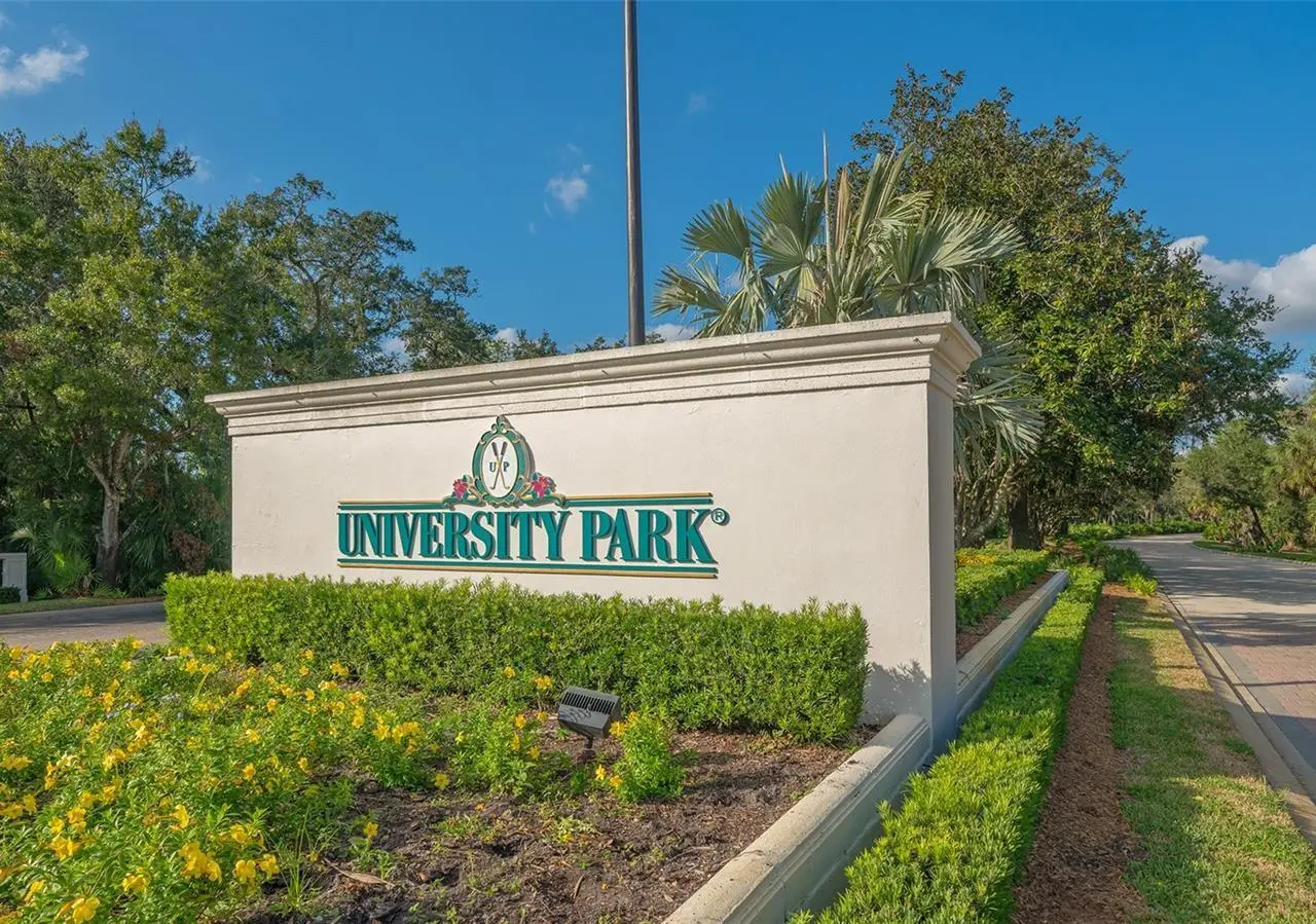 Hyde Park, an enclave of only 12 homes inside the gates of University Park Country Club, sets itself apart for the larger homesites where home sizes vary from 3,000-5,600 sq feet. This home sits on a serene HALF-ACRE and on the water. Slow down and enjoy the drive and lush landscaping throughout the community and arrive in this scenic and charming neighborhood. This home is graced with a beautiful entry of leaded glass doors and custom details throughout. A classic floorplan with an open family room/kitchen that has been updated with timeless finishes. Side entry garage, paver driveway and paved walkway to the entry. (TILE ROOF REPLACED: 2015). Foyer opens to the living and dining room and this home is saturated in natural light with tall windows and sliding glass doors to the pool area. Flooring is 18-inch diagonal tile; soaring ceilings and crown moldings. A feature that sets this welcoming home apart is a floor-to-ceiling striking wall of bookcases enhanced by accent lighting. Fully equipped and well-appointed kitchen; a wet bar and a walk-in pantry. A charming breakfast nook overlooks the pool with an aquarium glass window. Split bedroom plan includes a spacious primary suite with two custom closets, a stunning renovated bathroom with dual granite vanities, walk-in shower, marble flooring, and a private water closet. Two additional bedrooms plus a versatile fourth bedroom with direct pool access can serve as an office, study or additional living space. The backyard and pool area features an expansive paver lanai, two covered seating areas and room for an outdoor kitchen (natural gas hook-up). The pool overlooks the water and the natural beauty surrounding this home is simply relaxing. Residents of University Park Country Club have access to 27 holes of championship golf, tennis and pickleball courts, state-of-the-art fitness center, walking trails, and a wide variety of social activities, all within a secure, gated community. Located just minutes from downtown Sarasota, UTC Mall, world-class shopping, dining, beaches, and SRQ International Airport, this home offers the ultimate lifestyle in one of Sarasota's most desirable communities.
