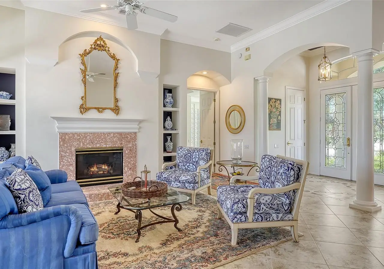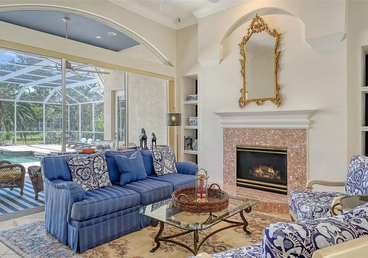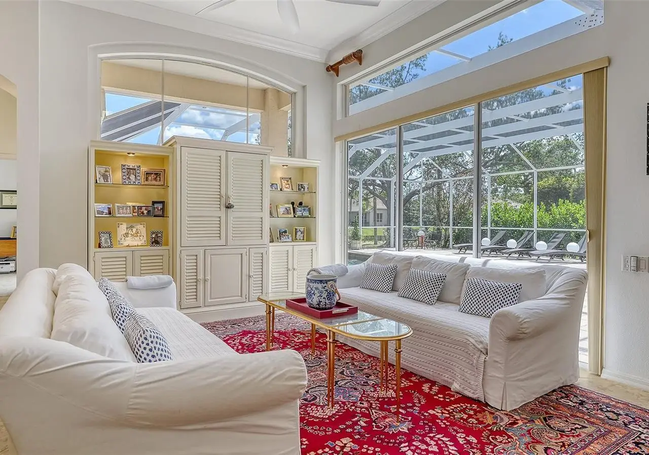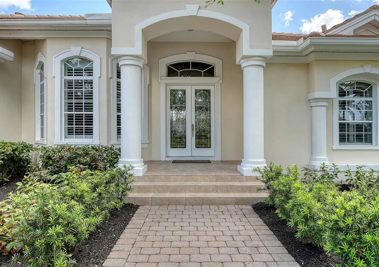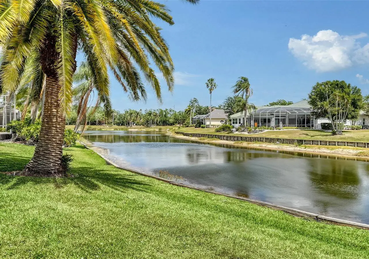 Hyde Park, an enclave of only 12 homes inside the gates of University Park Country Club, sets itself apart for the larger homesites where home sizes vary from 3,000-5,600 sq feet. This home sits on a serene HALF-ACRE and on the water. Slow down and enjoy the drive and lush landscaping throughout the community and arrive in this scenic and charming neighborhood. This home is graced with a beautiful entry of leaded glass doors and custom details throughout. A classic floorplan with an open family room/kitchen that has been updated with timeless finishes. Side entry garage, paver driveway and paved walkway to the entry. (TILE ROOF REPLACED: 2015). Foyer opens to the living and dining room and this home is saturated in natural light with tall windows and sliding glass doors to the pool area. Flooring is 18-inch diagonal tile; soaring ceilings and crown moldings. A feature that sets this welcoming home apart is a floor-to-ceiling striking wall of bookcases enhanced by accent lighting. Fully equipped and well-appointed kitchen; a wet bar and a walk-in pantry. A charming breakfast nook overlooks the pool with an aquarium glass window. Split bedroom plan includes a spacious primary suite with two custom closets, a stunning renovated bathroom with dual granite vanities, walk-in shower, marble flooring, and a private water closet. Two additional bedrooms plus a versatile fourth bedroom with direct pool access can serve as an office, study or additional living space. The backyard and pool area features an expansive paver lanai, two covered seating areas and room for an outdoor kitchen (natural gas hook-up). The pool overlooks the water and the natural beauty surrounding this home is simply relaxing. Residents of University Park Country Club have access to 27 holes of championship golf, tennis and pickleball courts, state-of-the-art fitness center, walking trails, and a wide variety of social activities, all within a secure, gated community. Located just minutes from downtown Sarasota, UTC Mall, world-class shopping, dining, beaches, and SRQ International Airport, this home offers the ultimate lifestyle in one of Sarasota's most desirable communities.