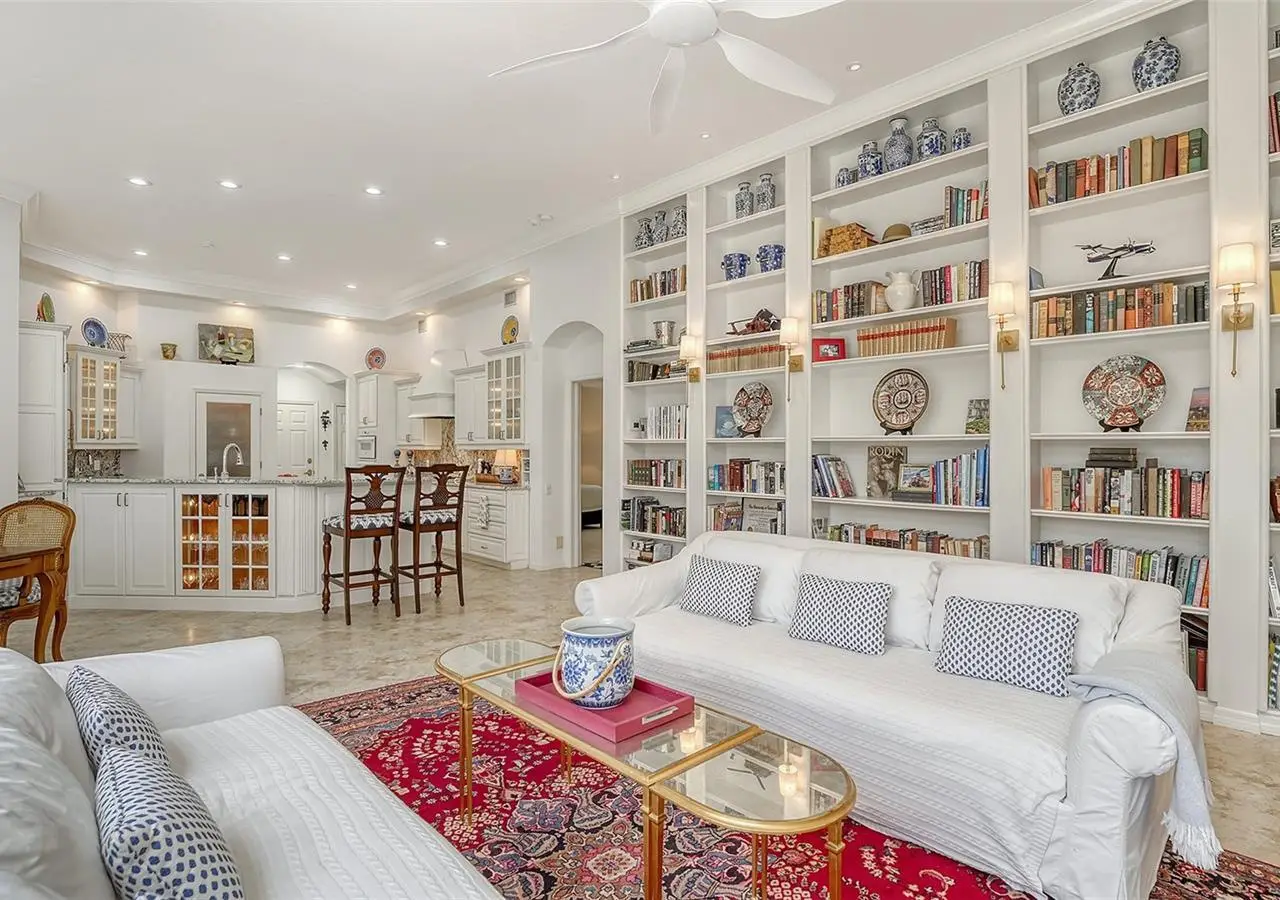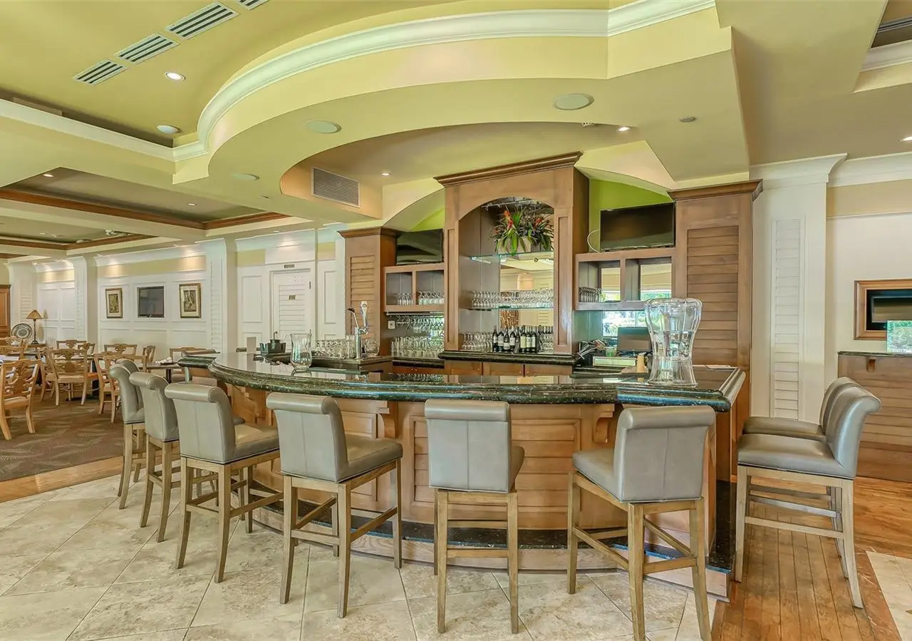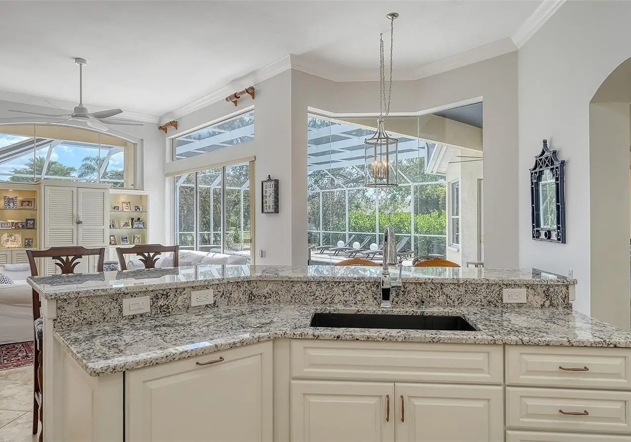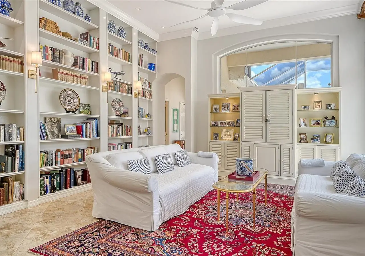 Hyde Park, an enclave of only 12 homes inside the gates of University Park Country Club, sets itself apart for the larger homesites where home sizes vary from 3,000-5,600 sq feet. This home sits on a serene HALF-ACRE and on the water. Slow down and enjoy the drive and lush landscaping throughout the community and arrive in this scenic and charming neighborhood. This home is graced with a beautiful entry of leaded glass doors and custom details throughout. A classic floorplan with an open family room/kitchen that has been updated with timeless finishes. Side entry garage, paver driveway and paved walkway to the entry. (TILE ROOF REPLACED: 2015). Foyer opens to the living and dining room and this home is saturated in natural light with tall windows and sliding glass doors to the pool area. Flooring is 18-inch diagonal tile; soaring ceilings and crown moldings. A feature that sets this welcoming home apart is a floor-to-ceiling striking wall of bookcases enhanced by accent lighting. Fully equipped and well-appointed kitchen; a wet bar and a walk-in pantry. A charming breakfast nook overlooks the pool with an aquarium glass window. Split bedroom plan includes a spacious primary suite with two custom closets, a stunning renovated bathroom with dual granite vanities, walk-in shower, marble flooring, and a private water closet. Two additional bedrooms plus a versatile fourth bedroom with direct pool access can serve as an office, study or additional living space. The backyard and pool area features an expansive paver lanai, two covered seating areas and room for an outdoor kitchen (natural gas hook-up). The pool overlooks the water and the natural beauty surrounding this home is simply relaxing. Residents of University Park Country Club have access to 27 holes of championship golf, tennis and pickleball courts, state-of-the-art fitness center, walking trails, and a wide variety of social activities, all within a secure, gated community. Located just minutes from downtown Sarasota, UTC Mall, world-class shopping, dining, beaches, and SRQ International Airport, this home offers the ultimate lifestyle in one of Sarasota's most desirable communities.