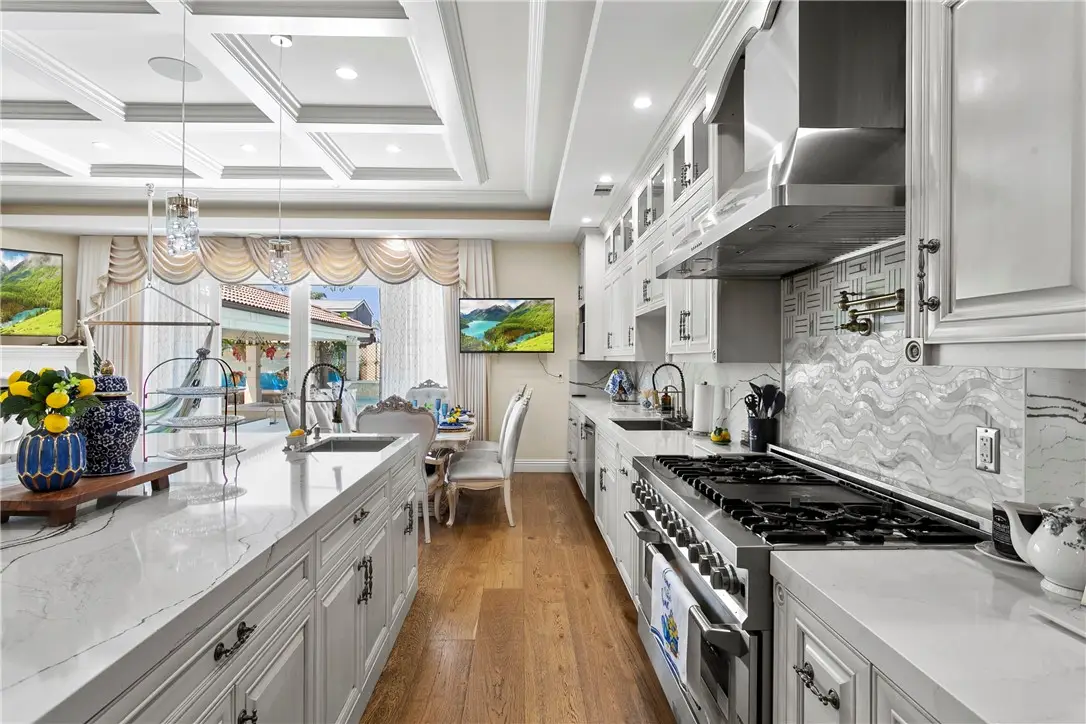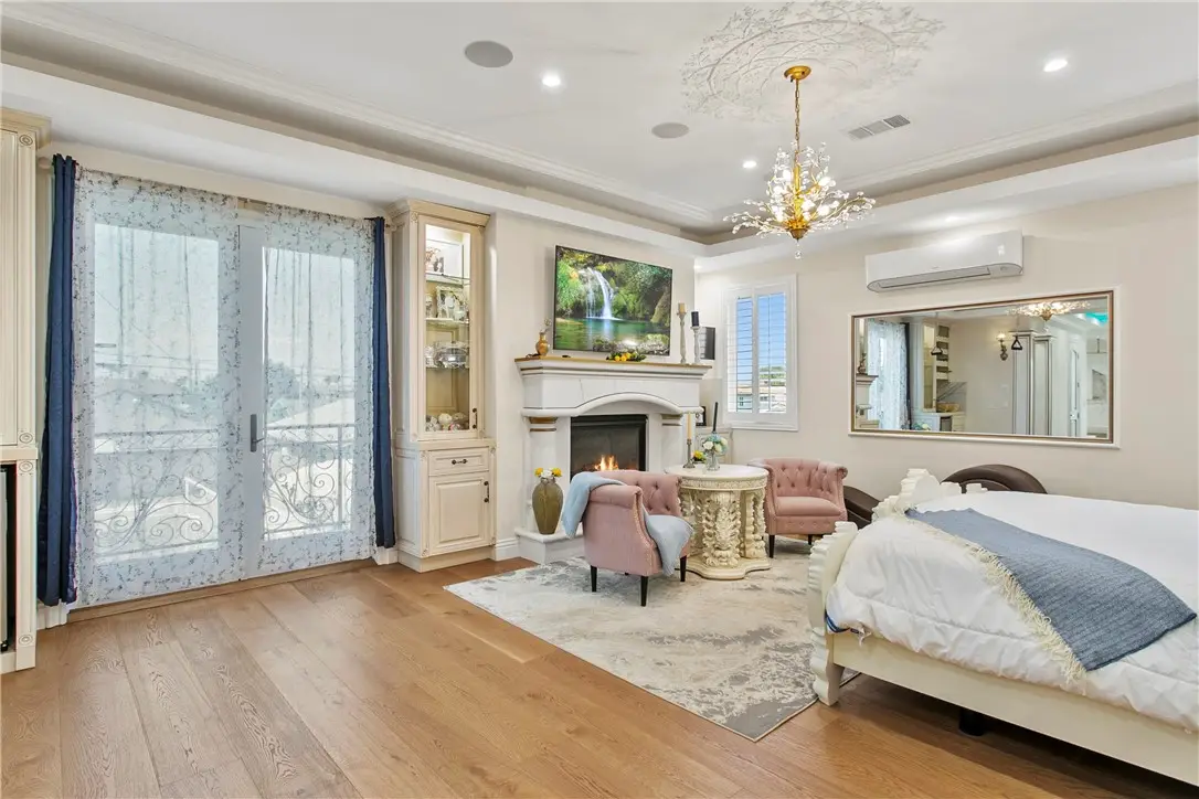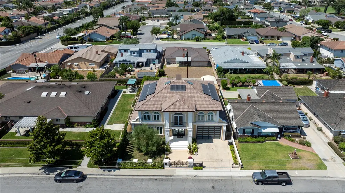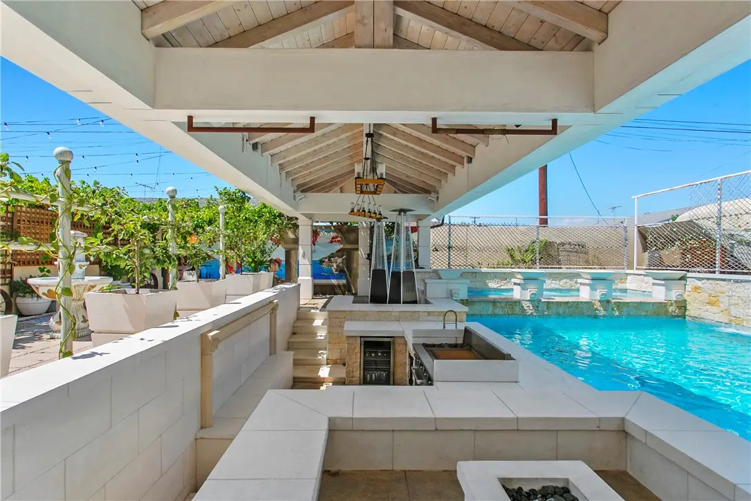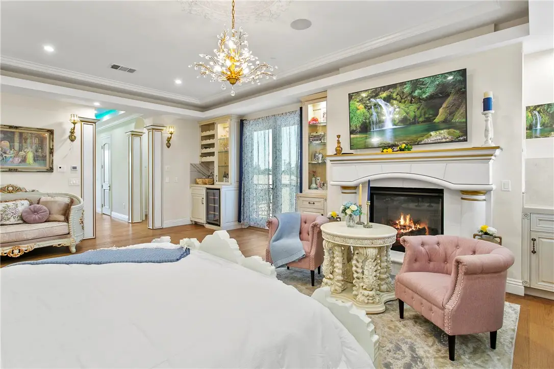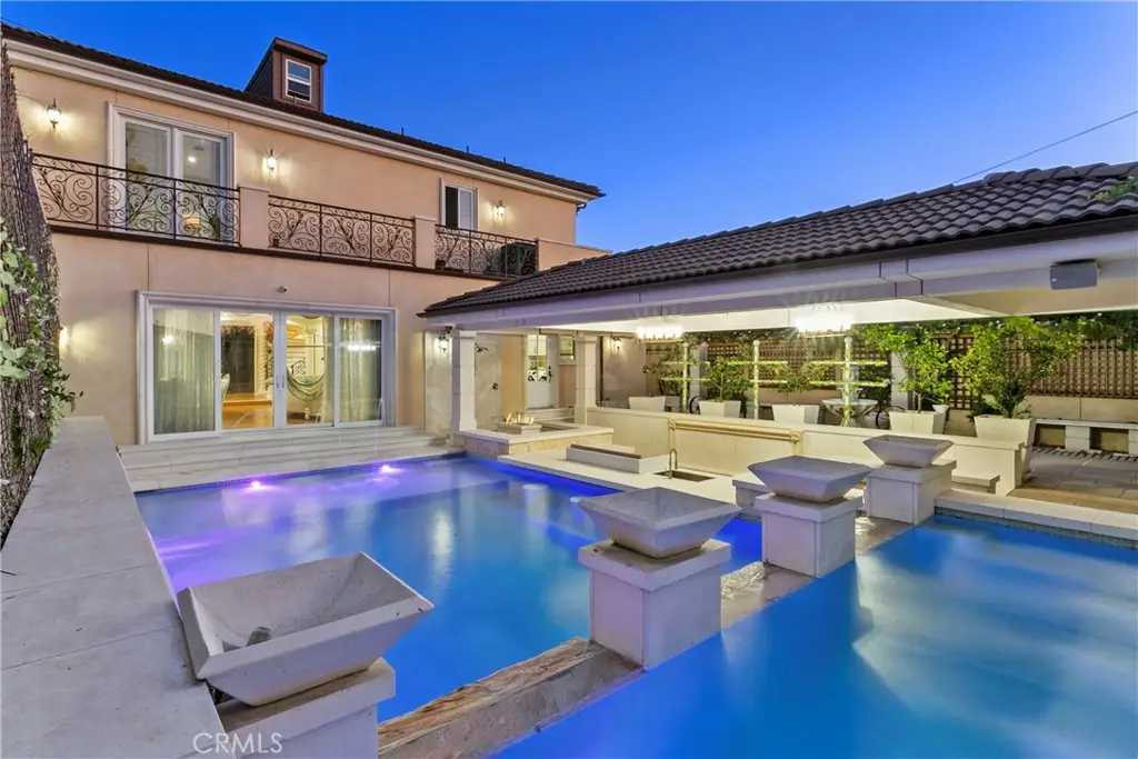 Stunning Mediterranean-Style Luxury Smart Home, Custom Built by Loving Father for Family. This extraordinary custom-built home blends top-tier craftsmanship with unparalleled comfort, style, and functionality, offering a fully integrated Smart Home experience and every amenity imaginable for modern luxury living. Every inch of this home was built with meticulous care and loving devotion. Inside, you'll find solid-core 8 ft tall wood doors, dual-pane fiberglass windows, high-end wood & stone flooring, coffered 10 ft tall ceilings, custom-built crown moldings, golden accents, and an intercom system throughout rooms. In Living Room built into wall is Custom See-Through Salt Water Fish Tank with Exotic fish! Upon entering is wonderful Art Wall depicting landscape and concrete branch design with molded flowers-- A Delightful Artistic Touch. All Bedrooms are Master Bedrooms, featuring en-suite baths, free standing tubs in showers, wet room, Crema Merfil bathroom counters, decorative soffits, walk-in closets, chandeliers, LED remote controlled ceiling lights, bluetooth speakers, and casement double-pane windows with shutter blinds. Upstairs Master Suite features two walk-in closets, gas fireplace, jacuzzi tub, balcony overlooking Oasis, and the Most Enchanting Custom-Design Ceiling Decor! Ceiling above Master Suite jacuzzi is beautiful Venetian Plaster with Golden Veins. Gorgeous Gourmet kitchen with expensive Quartz counters, high-end stove with pot filler and hood, beautiful built-in cabinets in Antique White, spice drawers, eating bar, and thick, durable glass sliding pocket doors overlooking the pool. Enjoy a lush salt-system pool and adjacent jacuuzzi all year long, with water-heating system and waterworks all controlled via phone-- including waterfall, water jets, and underwater LED color-changing lights. Beneath the cabana held up by custom murals is a built-in BBQ with mini fridge, installed bluetooth speakers, and Baja with built in bar stools. Elaborate Smart Home System nestled out of sight, yet easily accessible, manages all features of the home, which YOU can easily control via cell phone! 3 Car Garage includes RV hook ups and Electric Car Charger. A Variety of fruit trees are planted in large pots-- already giving fruit! Access to Bonus Room is in upstairs laundry room. And to wrap it all up, an Underground Lock Safe is nestled below 8 inches of concrete for secure, personal use. This House has it all. Truly, a One-of-a-Kind Home.