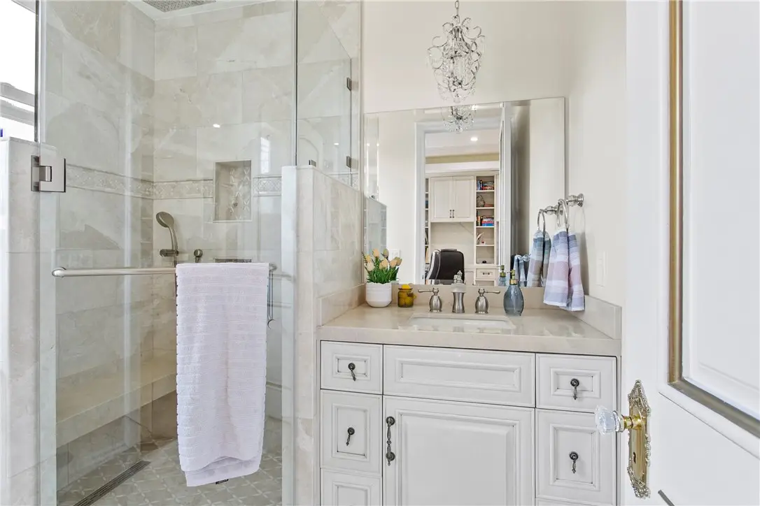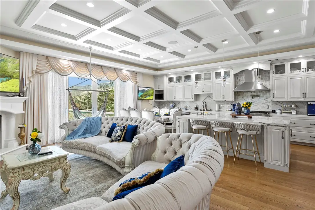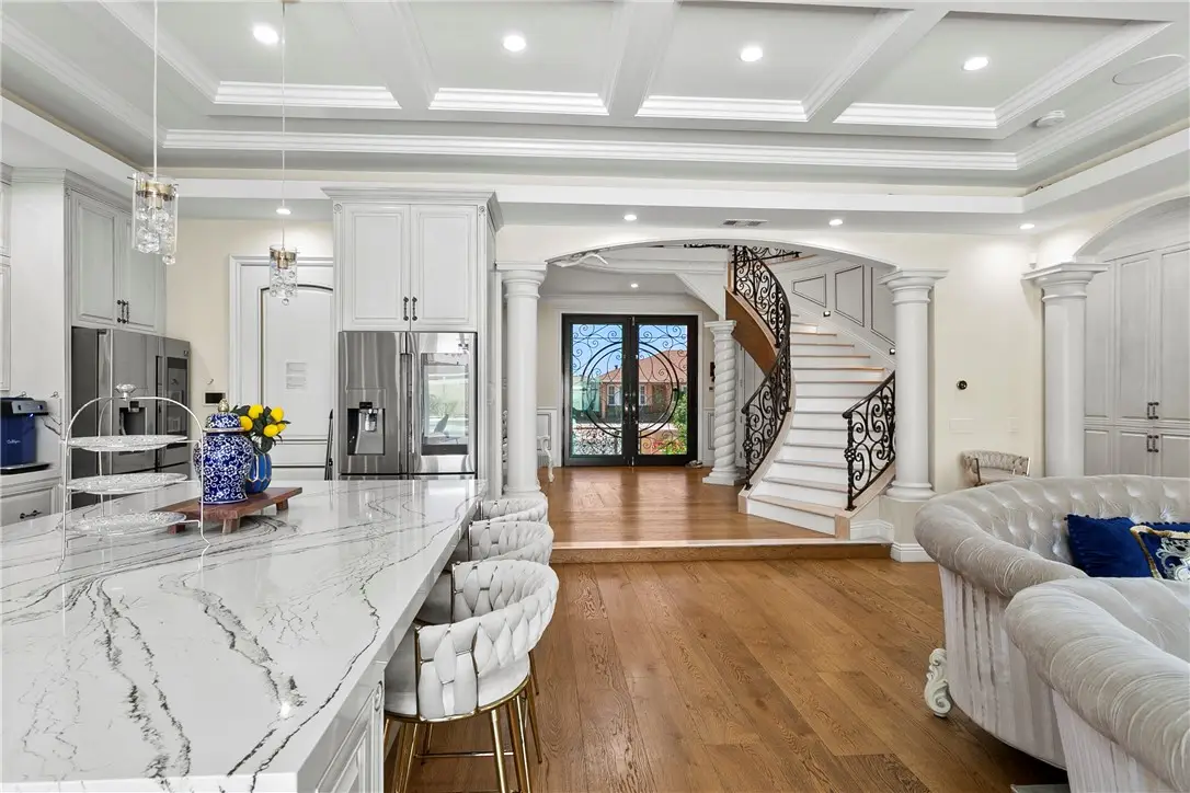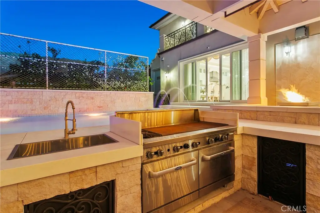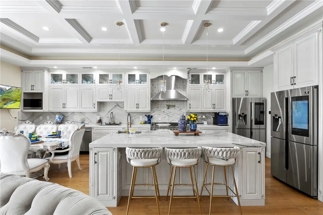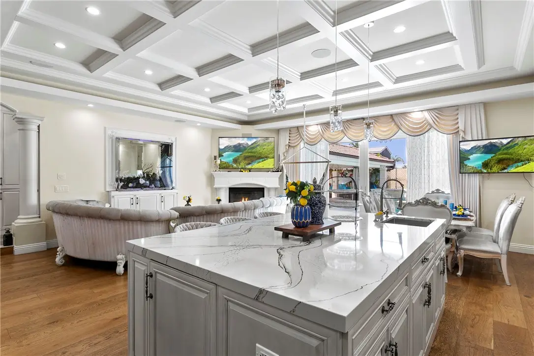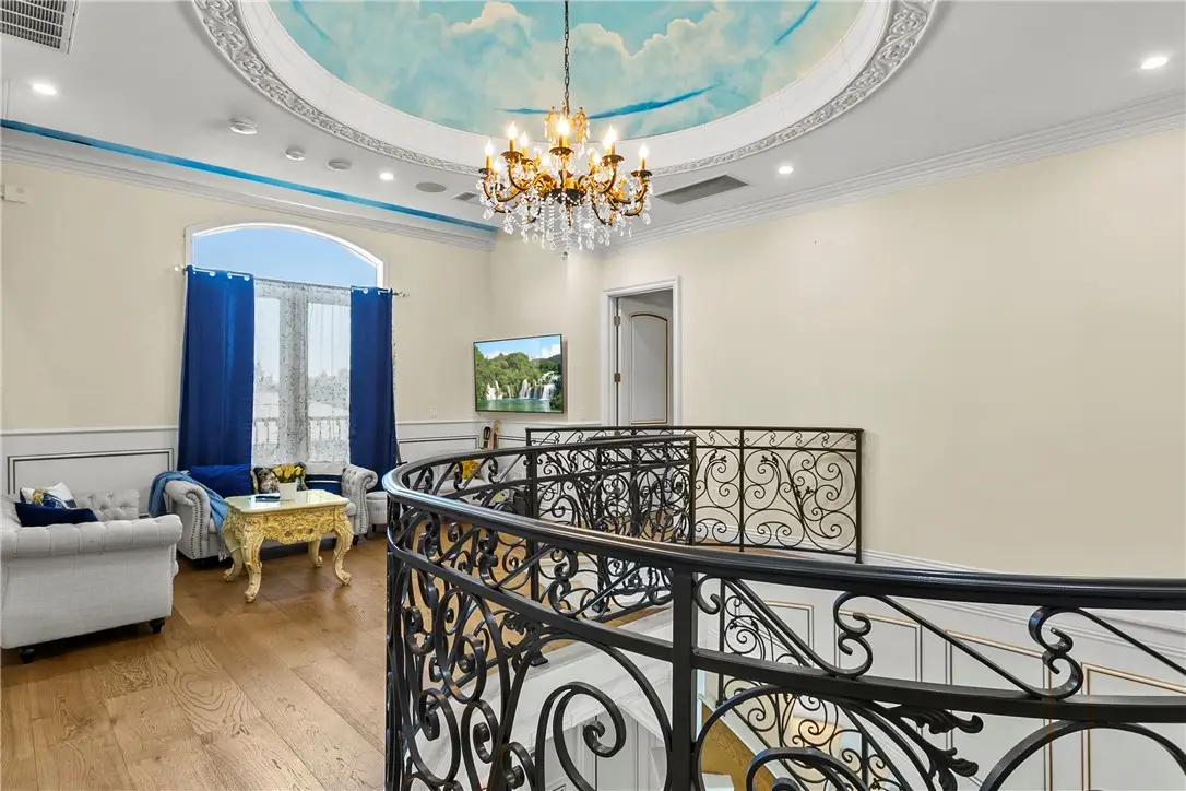 Stunning Mediterranean-Style Luxury Smart Home, Custom Built by Loving Father for Family. This extraordinary custom-built home blends top-tier craftsmanship with unparalleled comfort, style, and functionality, offering a fully integrated Smart Home experience and every amenity imaginable for modern luxury living. Every inch of this home was built with meticulous care and loving devotion. Inside, you'll find solid-core 8 ft tall wood doors, dual-pane fiberglass windows, high-end wood & stone flooring, coffered 10 ft tall ceilings, custom-built crown moldings, golden accents, and an intercom system throughout rooms. In Living Room built into wall is Custom See-Through Salt Water Fish Tank with Exotic fish! Upon entering is wonderful Art Wall depicting landscape and concrete branch design with molded flowers-- A Delightful Artistic Touch. All Bedrooms are Master Bedrooms, featuring en-suite baths, free standing tubs in showers, wet room, Crema Merfil bathroom counters, decorative soffits, walk-in closets, chandeliers, LED remote controlled ceiling lights, bluetooth speakers, and casement double-pane windows with shutter blinds. Upstairs Master Suite features two walk-in closets, gas fireplace, jacuzzi tub, balcony overlooking Oasis, and the Most Enchanting Custom-Design Ceiling Decor! Ceiling above Master Suite jacuzzi is beautiful Venetian Plaster with Golden Veins. Gorgeous Gourmet kitchen with expensive Quartz counters, high-end stove with pot filler and hood, beautiful built-in cabinets in Antique White, spice drawers, eating bar, and thick, durable glass sliding pocket doors overlooking the pool. Enjoy a lush salt-system pool and adjacent jacuuzzi all year long, with water-heating system and waterworks all controlled via phone-- including waterfall, water jets, and underwater LED color-changing lights. Beneath the cabana held up by custom murals is a built-in BBQ with mini fridge, installed bluetooth speakers, and Baja with built in bar stools. Elaborate Smart Home System nestled out of sight, yet easily accessible, manages all features of the home, which YOU can easily control via cell phone! 3 Car Garage includes RV hook ups and Electric Car Charger. A Variety of fruit trees are planted in large pots-- already giving fruit! Access to Bonus Room is in upstairs laundry room. And to wrap it all up, an Underground Lock Safe is nestled below 8 inches of concrete for secure, personal use. This House has it all. Truly, a One-of-a-Kind Home.