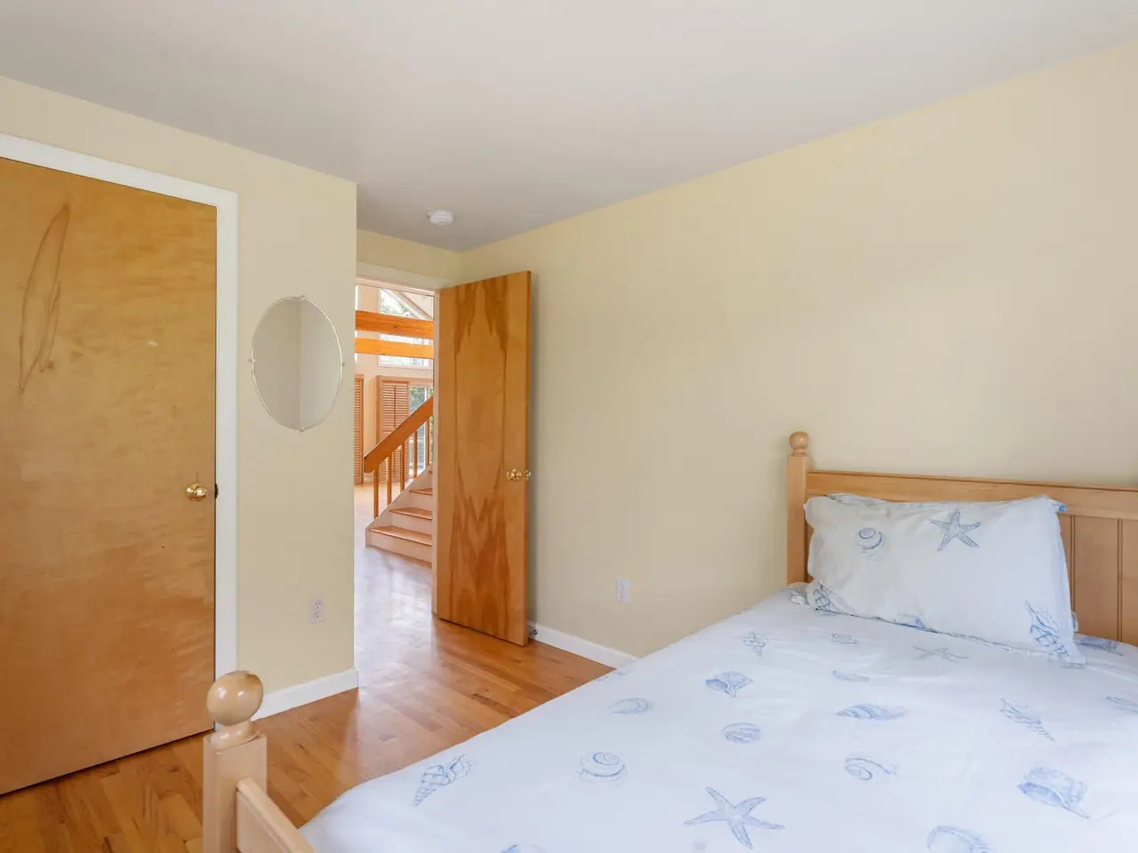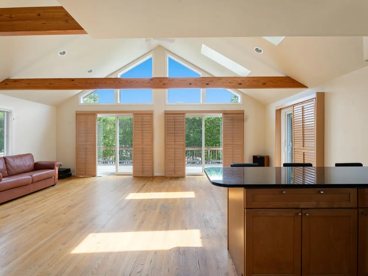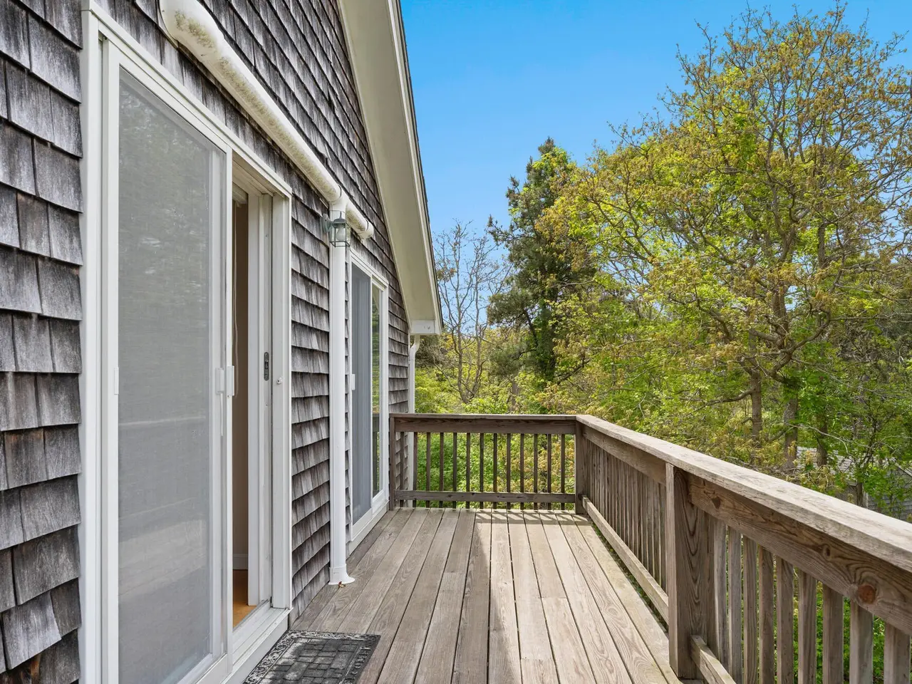 Vacation Getaway in Edgartown Estates - This sunny and welcoming contemporary home could be yours this summer! With an open layout, vaulted ceilings and lots of windows and glass doors, the home feels bright and airy. Step outside to a spacious wrap-around deck-great for relaxing or entertaining. Inside, the living, dining and kitchen areas flow nicely and are just the right size for gathering. The first floor has three guest bedrooms, while upstairs you'll find a loft, the primary bedroom suite, and a private balcony. Other features include hardwood floors, air conditioning, a full basement, and an outdoor shower-perfect after a day at the beach. The half-acre lot offers a nice lawn with mature trees and plantings that provide privacy from the road and neighbors. Edgartown Estates is an excellent location, just off the bike path to South Beach and into Edgartown Village. Come take a look!