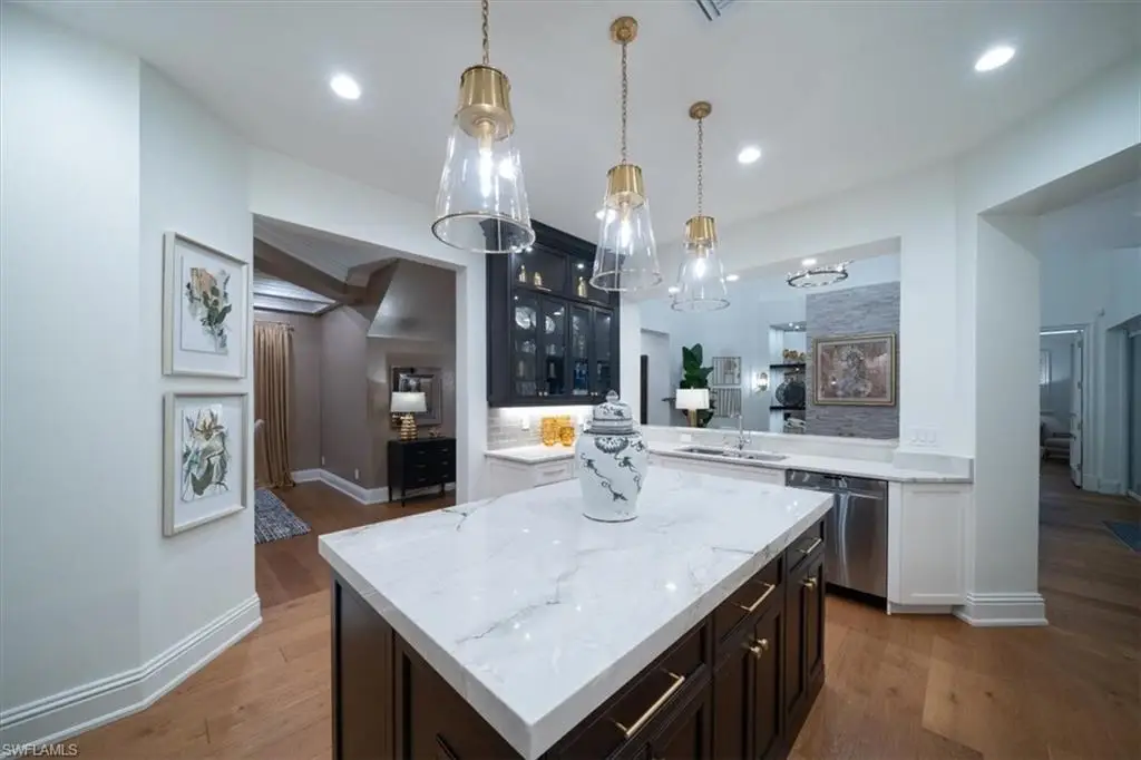 Prepare to be amazed by this exquisite, fully furnished, and remodeled British Cayman inspired haven, just moments from the breathtaking Gulf of Mexico beaches! Positioned a mere three blocks from the shoreline, this luxurious 2-story residence with 4 bedrooms and 3 full and 2 half baths epitomizes the pinnacle of luxury living in Naples. Take a leisurely stroll just five blocks south to immerse yourself in the world-class shopping and dining experiences of 5th Ave S. As you approach, be captivated by the circular paved driveway and meticulously designed landscaping that elevate the curb appeal of this magnificent manor-style home. Enter through the custom Mahogany wood front doors of 33 3rd St and step into a grand yet welcoming great room that offers stunning views of the pool and tropical terrace. The ground floor primary suite features two walk-in closets and a lavish master bath. For those passionate about culinary excellence, the spacious gourmet kitchen showcases high-quality appliances, including a gas stove top, complemented by an outdoor kitchen. With ample space for entertaining, this home also boasts a heated pool and spa in your private backyard oasis, perfect for enjoying when you're not soaking up the Florida sunshine at the beach. With its sophisticated light neutral palette, French oak flooring, Anderson impact windows & doors, impeccable designer finishes and fixtures, and undeniable charm, this home is a true masterpiece waiting to be uncovered and cherished. In addition this home did not sustain any water issues from Ian or Milton.