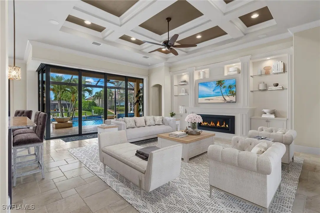 Located in the premier deep-water boating community of Southwest Florida, this luxurious 4-bedroom home boasts a great room floor plan complete with a fireplace, custom built-ins, and top-quality finishes throughout. The home exudes spaciousness, featuring a beautiful kitchen with high-end stainless steel appliances and a well-appointed butler's pantry with an extra refrigerator and wine cooler. The master bedroom is expansive, offering a gorgeous, spacious bath and two walk-in closets. Guest bedrooms are also roomy and private. A private study is conveniently located off the great room, along with a formal dining or additional sitting area. Zero pocket sliders open from the great room to a generous pool entertainment area, which includes fire bowls, an impressive spa, and a large outdoor kitchen area with a fireplace. The dock area is superb, with ample deck space and a boat lift. Palmetto Point provides quick access to the intercoastal, bay, and gulf waters, where you can enjoy waterfront dining, incredible beaches, world-class fishing, and more. The location of Palmetto Point is ideal, being close to Sanibel and Captiva Islands, Fort Myers Beach, nearby HealthPark, shopping, and excellent restaurants. This is a remarkable offering.