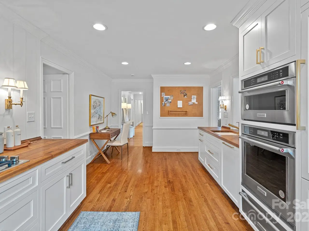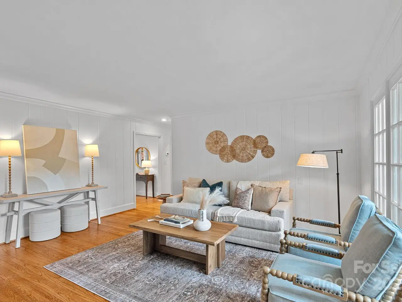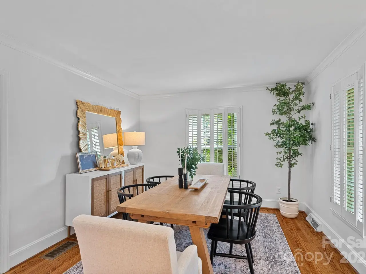 Timeless elegance and classic charm define this beautifully updated 1954 ranch nestled in the heart of Old Cotswold neighborhood. Thoughtfully designed for both comfort and style, this three-bedroom, two-full-bath home was redesigned by the renowned architect Don Duffy and features a tastefully renovated kitchen with warm butcher block counters, custom cabinetry and elegant fixtures. The charming sunroom offers additional custom cabinetry for extra storage needs and an abundance of windows, flooding the room with natural light. The living room exudes sophistication with custom built-ins accented by soft recessed lighting and a cozy gas fireplace, while a second fireplace in the den adds additional warmth and character. Beautifully updated baths complement the home's enduring style, while the very private, landscaped backyard provides an ideal retreat for outdoor enjoyment. The covered rear porch, formerly a two-car carport, along with the beautiful stone patio is a wonderful area for outdoor living. Additional highlights include a whole-house gas generator that offers peace of mind and everyday convenience. Perfectly situated near premier dining, shopping, and Uptown Charlotte, this quintessential home blends classic design with timeless modern comforts in a most sought-after neighborhoods.