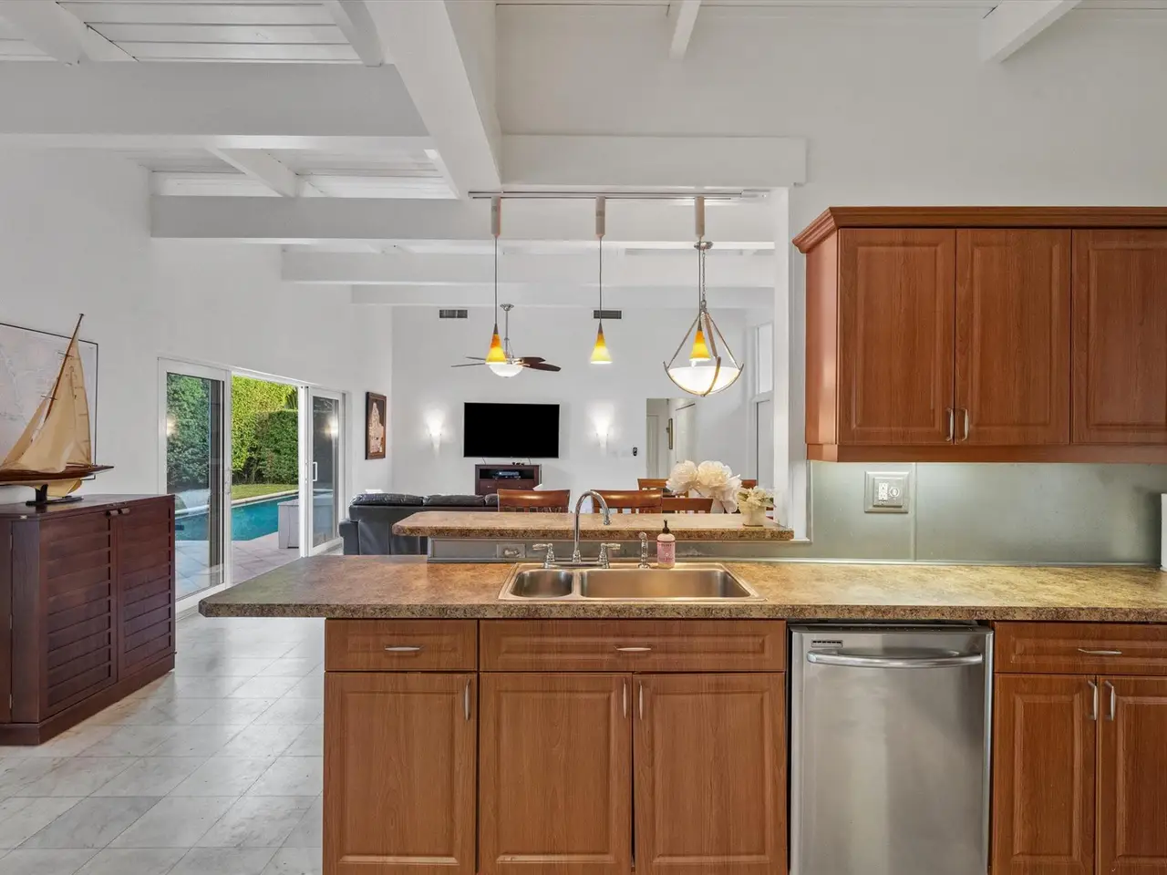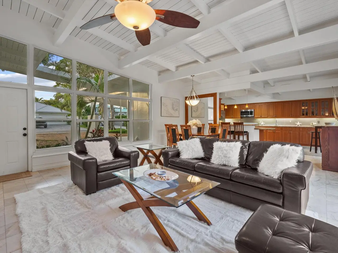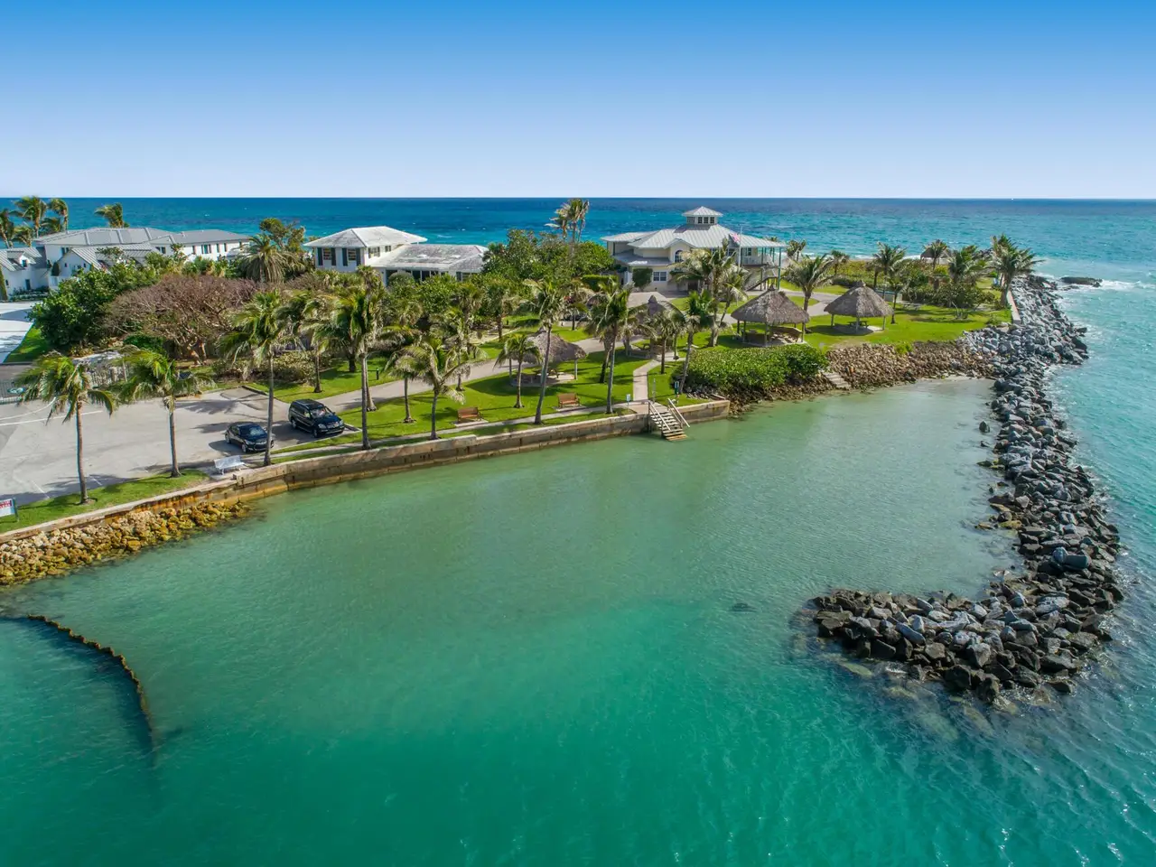 Just steps from the private, secured beaches of Jupiter Inlet Colony, this one-level Mid-Century coastal retreat sits on a prime interior lot, offering both charm and opportunity. Fully furnished and turnkey, this CBS-constructed home features 3 bedrooms, 2 baths, and an open floor plan where the kitchen seamlessly connects to the dining and living areas. With soaring volume ceilings, exposed beams, and all-impact windows and doors, the home is designed for both style and security. Outside, a lushly landscaped backyard oasis awaits, complete with a private pool enveloped by greenery. Offered at land value and sold as-is. This property presents a rare chance to build new or renovated in one of the most coveted beachside communities.