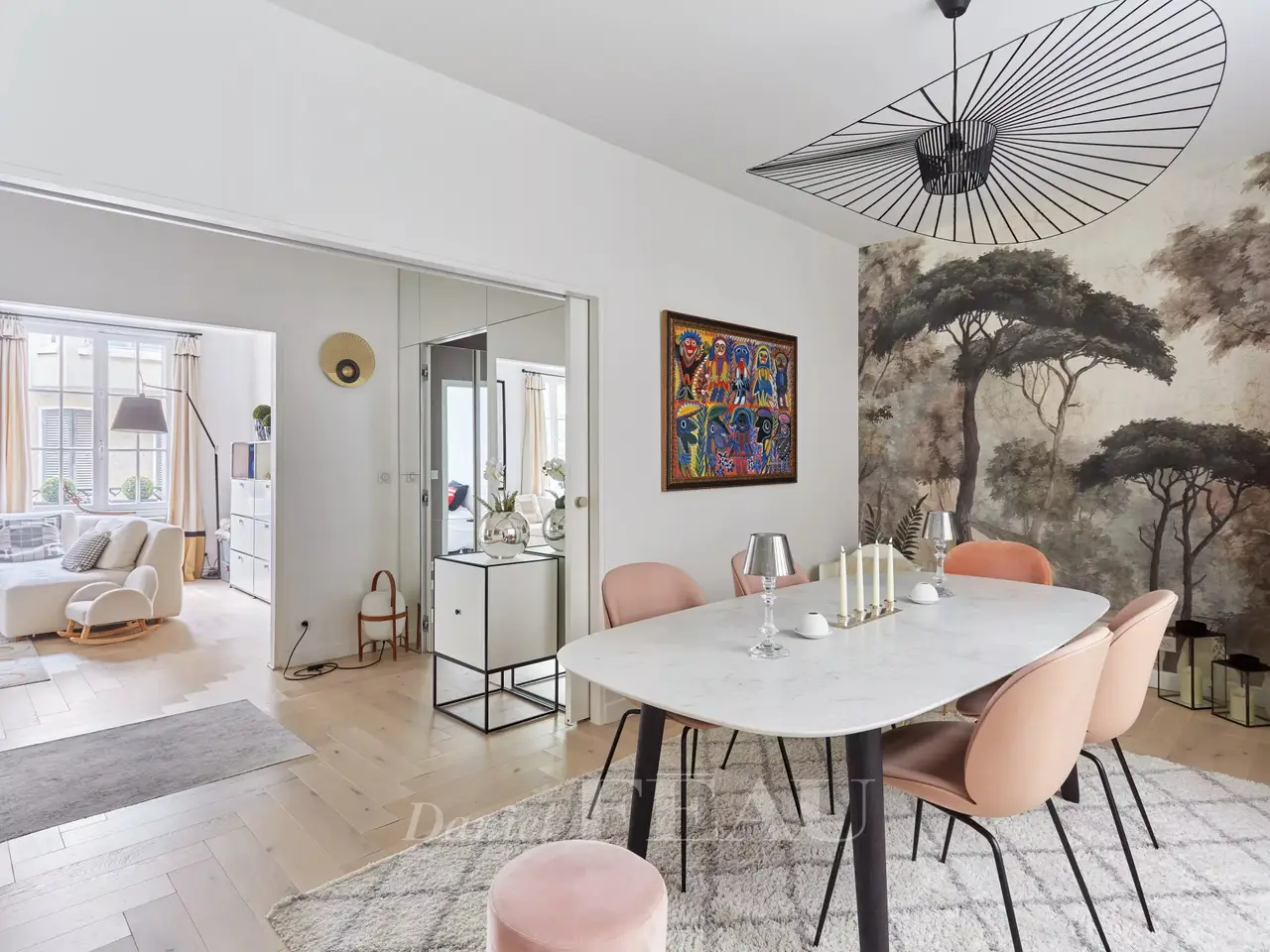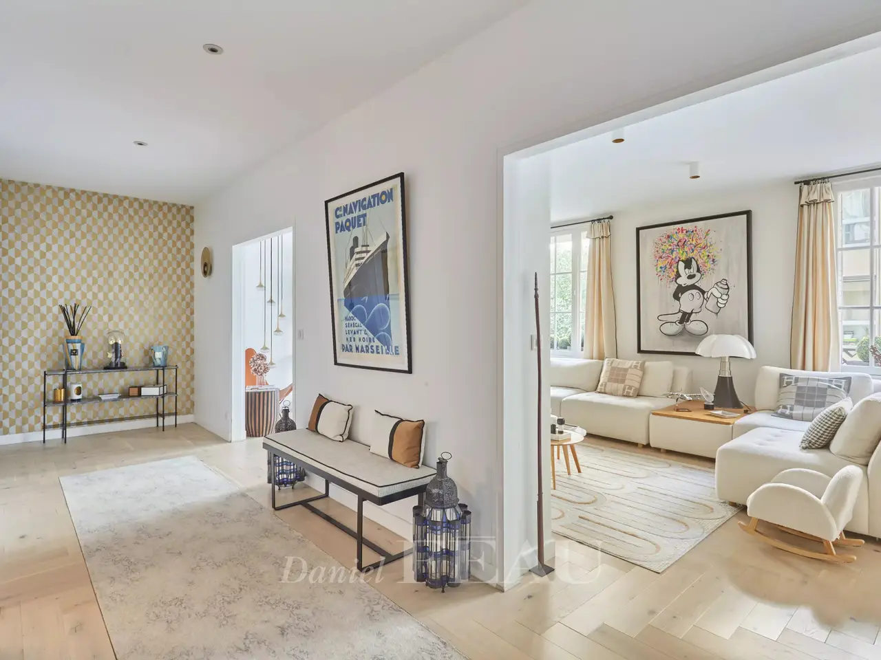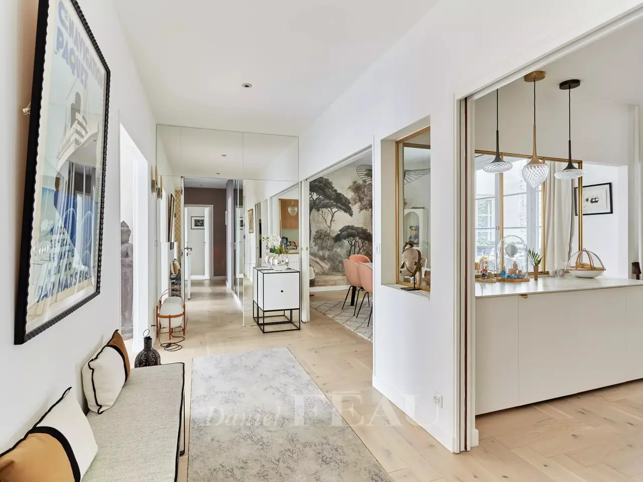 La Muette neighbourhood. This apartment on the 1st floor of a fine 1930s building located near rue de la Pompe was renovated throughout by an interior decorator in 2021. It includes a spacious living/reception room, a dining room, a semi open-plan kitchen, a master bedroom with a shower room and dressing room, three further bedrooms, a bathroom, a shower room and a utility area. With a cellar. Air conditioning. An ideal family apartment in the immediate vicinity of the schools, the shops and the transport networks.