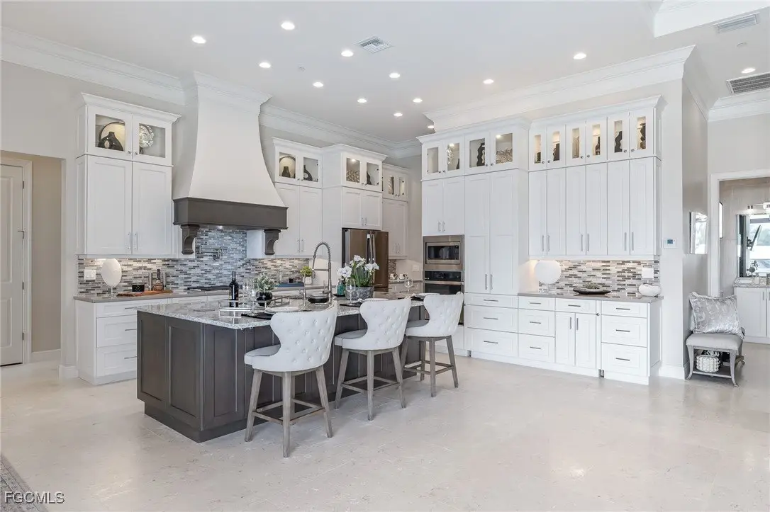 On the prestigious 200' wide, deep-water Bimini Canal, just minutes to the Gulf of Mexico, beaches, and waterfront dining, stands a masterpiece of design and craftsmanship. Built in 2023 by Sinclair Custom Homes, this four-bedroom, four-and-a-half-bath estate-with an additional office and private in-law suite-offers the perfect balance of elegance, comfort, and functionality. From the moment you arrive, the 10' custom iron front door makes a statement, opening into a home filled with natural light, soaring tray ceilings, and seashell stone flooring. The chef's kitchen is both stunning and practical, featuring quartz countertops, a WOLF 5-burner gas cooktop, GE Profile appliances, a farmhouse sink, a hidden spice rack, pull-out steps, and a walk-in pantry. Every cabinet, every finish, has been designed with care. An elevator connects you to the second-floor in-law suite, where guests can enjoy their own private living area, bedroom, bath, and balcony. For the ultimate sunset views, a spiral staircase leads to a third-story observation deck-an unrivaled vantage point over the canal. The outdoor living is where this property truly shines. With coveted southern exposure, the heated saltwater pool and spa create the centerpiece of your private retreat, accented by fire and water bowls for dramatic ambiance. Two fully equipped outdoor kitchens-one under cover with dual refrigerators, sink, and hood fan, and the other beneath a tiki hut-make entertaining effortless. At the water's edge, a 92x29 dock includes a 16,000 lb lift and kayak pad, ready to launch you into adventure at a moment's notice. The master suite is a sanctuary in its own right, with dual vanities, a soaking tub, a walk-through shower, and a self-cleaning bidet. Every comfort has been considered, from electric storm shades to a hidden safe room, a whole-house fire sprinkler system, two reverse osmosis water systems, and a full-house generator. Hurricane-impact windows and doors, coupled with the home's high, dry positioning, mean peace of mind even in storm season-this home has never flooded. The oversized, three-car garage is air-conditioned with its own split unit, epoxy flooring, and insulated attic storage, home generator making it as functional as it is beautiful. A terracotta tile roof, wood staircases, and refined finishes throughout complete the home's timeless elegance. With world-class boating access in the heart of paradise, this is as luxurious as it gets. No detail has been overlooked, no expense spared. This residence is not simply move-in ready-it is the pinnacle of Gulf-access luxury living, offering safety, sophistication, and a lifestyle without compromise.