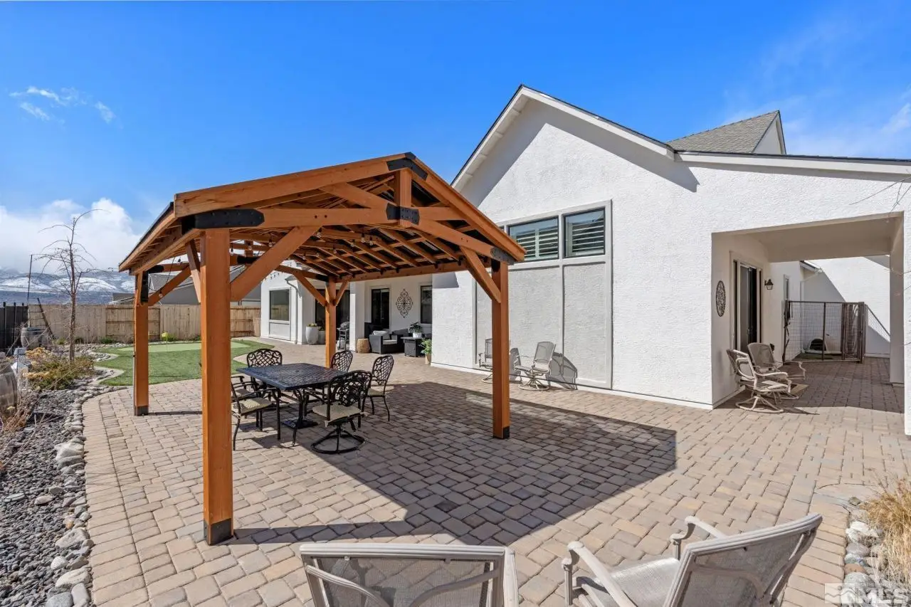 Welcome to Ridgeline at Carmella Ranch! This gated community home features 12' ceilings, European Oak hardwood floors, and upgraded soft-close kitchen cabinetry with a farmhouse sink, double ovens, and walk-in pantry. The primary suite offers an oversized shower and expansive closet. Enjoy multiple outdoor spaces: a front porch with scenic views, a covered back patio, gazebo, and private patio off the primary suite. The low-maintenance yard includes artificial turf and a personal putting green. Experience elevated living in the prestigious gated enclave of Ridgeline at Carmella Ranch. This beautifully appointed home blends timeless design with sophisticated upgrades to create an atmosphere of refined comfort and effortless style. Step inside and be greeted by soaring 12-foot ceilings and wide-plank European Oak hardwood flooring that flows gracefully throughout the main living areas. Elegant 8-foot, six-panel doors and thoughtfully selected high-end fixtures elevate each space, while plush premium carpeting adds warmth to the bedrooms. The chef's kitchen is a true showstopper - designed for both functionality and entertaining. Enjoy upgraded soft-close cabinetry, an oversized island, farmhouse sink, double ovens, and a generous walk-in pantry. The adjacent dining area is accented by a custom shiplap feature wall, adding texture and charm to the open-concept layout. Every wall in the home showcases a hand-troweled, imperfect smooth finish, creating a clean and artful aesthetic. Retreat to the expansive primary suite - a serene sanctuary offering a spa-inspired ensuite with a large walk-in shower, dual vanities, and an oversized walk-in closet. Step out onto your private covered patio for peaceful morning coffee or quiet evenings under the stars. Outdoor living is just as inviting with multiple spaces designed to relax and entertain. From the welcoming front porch with mountain views to the large covered patio, a charming gazebo, and a separate seating area off the primary suite - there's a perfect spot for every moment. The front and rear yards are fully landscaped with high-quality artificial turf for year-round greenery and water efficiency, while the backyard also features a personal putting green for added enjoyment. Every secondary bedroom includes its own walk-in closet and plantation shutters, with two sharing a stylish Jack and Jill bathroom. The floorplan is thoughtfully arranged to provide both comfort and privacy throughout. As a resident of Ridgeline, you'll also enjoy access to exceptional community amenities including a full-sized gym, outdoor pool and spa, indoor/outdoor entertaining spaces, locker rooms, and more. This is more than a home?it's a lifestyle. Schedule your private showing today. Note: Audio and video surveillance systems are in use on the property.