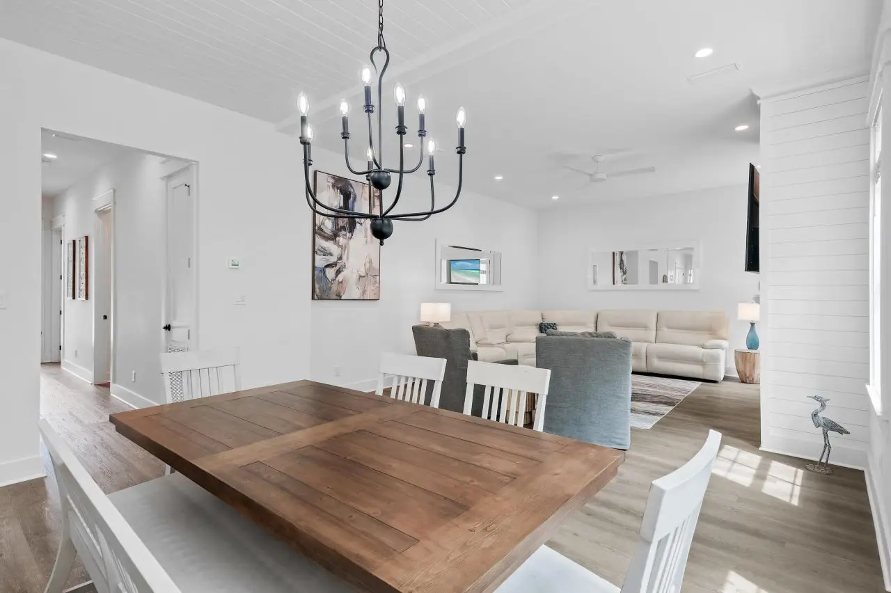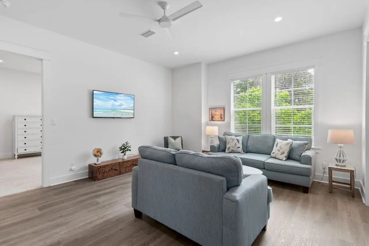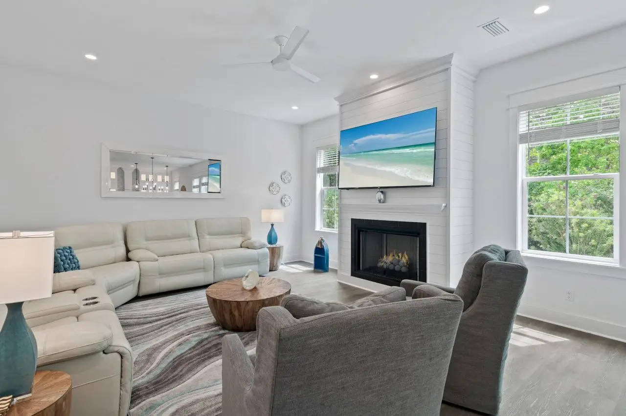 Step into modern coastal elegance in this thoughtfully crafted residence, located in the exclusive gated community of Tops'l Beach and Racquet Resort. This newly constructed 4-bedroom, (plus bonus room), 4.5-bathroom home in Grand Villas, offers a harmonious blend of luxury and comfort across 3,454 square feet of thoughtfully designed living space. Enjoy the convenience of primary suites on both the first and second floors, each featuring spa-like bathrooms for ultimate relaxation. The open-concept kitchen is equipped with top-of-the-line stainless steel appliances, custom cabinetry, and a spacious island, making it perfect for entertaining guests. Step outside to a screened patio featuring a built-in grill, perfect for alfresco dining and enjoying the Florida breeze. A home theater that doubles as an additional bedroom and twin bunks in the upstairs sitting area provide ample space for family and guests. The upstairs sitting area also includes a wet bar. Dual laundry rooms on each floor add to the home's convenience. Situated within the exclusive Grand Villas at Tops'l Beach Club, residents have access to a private community pool, as well as, state-of-the-art fitness center, tennis courts, additional swimming pools, and deeded beach access. Tops'l offers a laid-back coastal vibe with proximity to beautiful beaches and a variety of recreational amenities. Experience the perfect blend of luxury, comfort, and convenience in this exceptional beach retreat. Whether you're seeking a primary residence, vacation home, or investment property, 33 Palm Ridge Road offers an unparalleled coastal living experience.