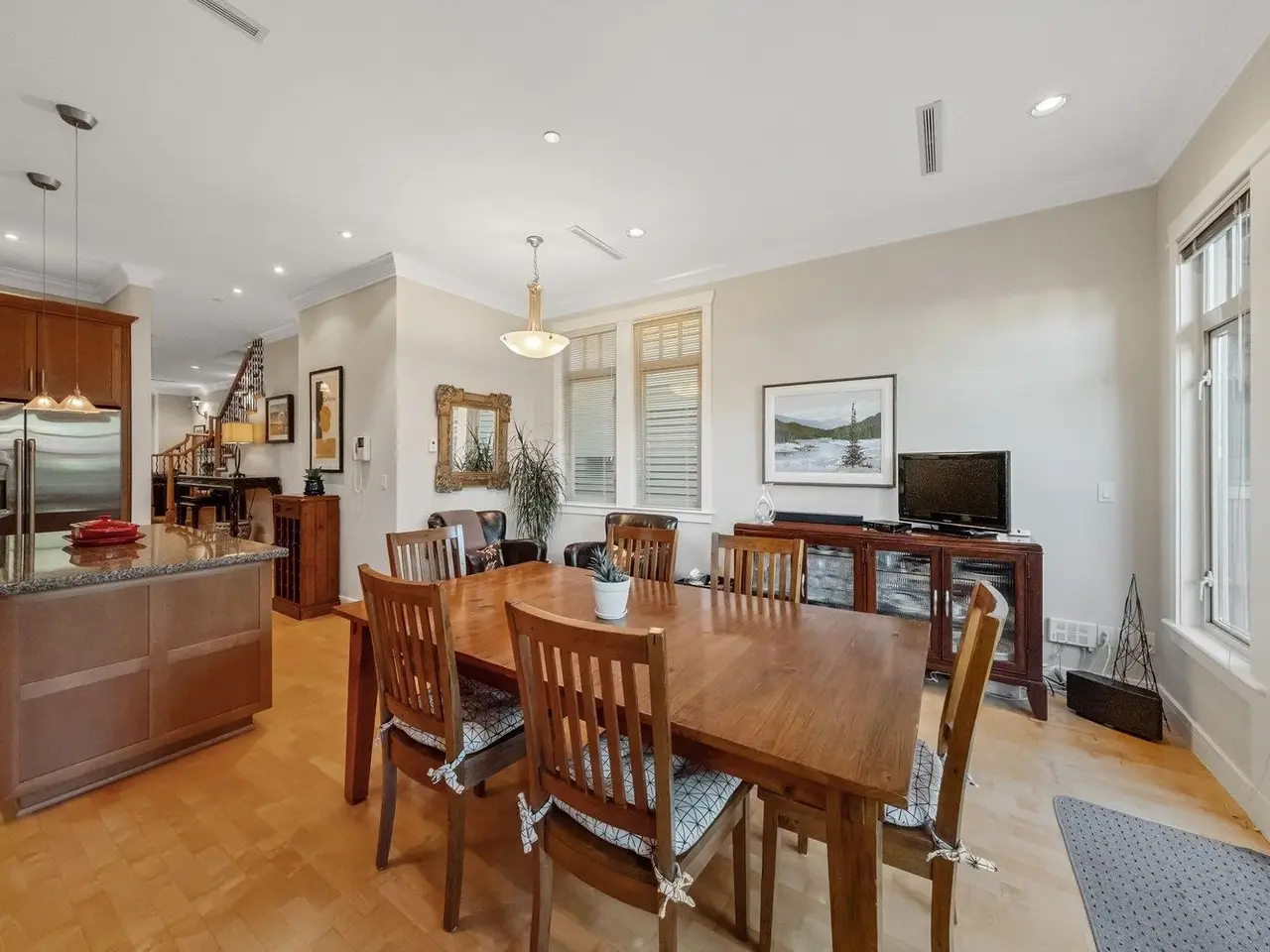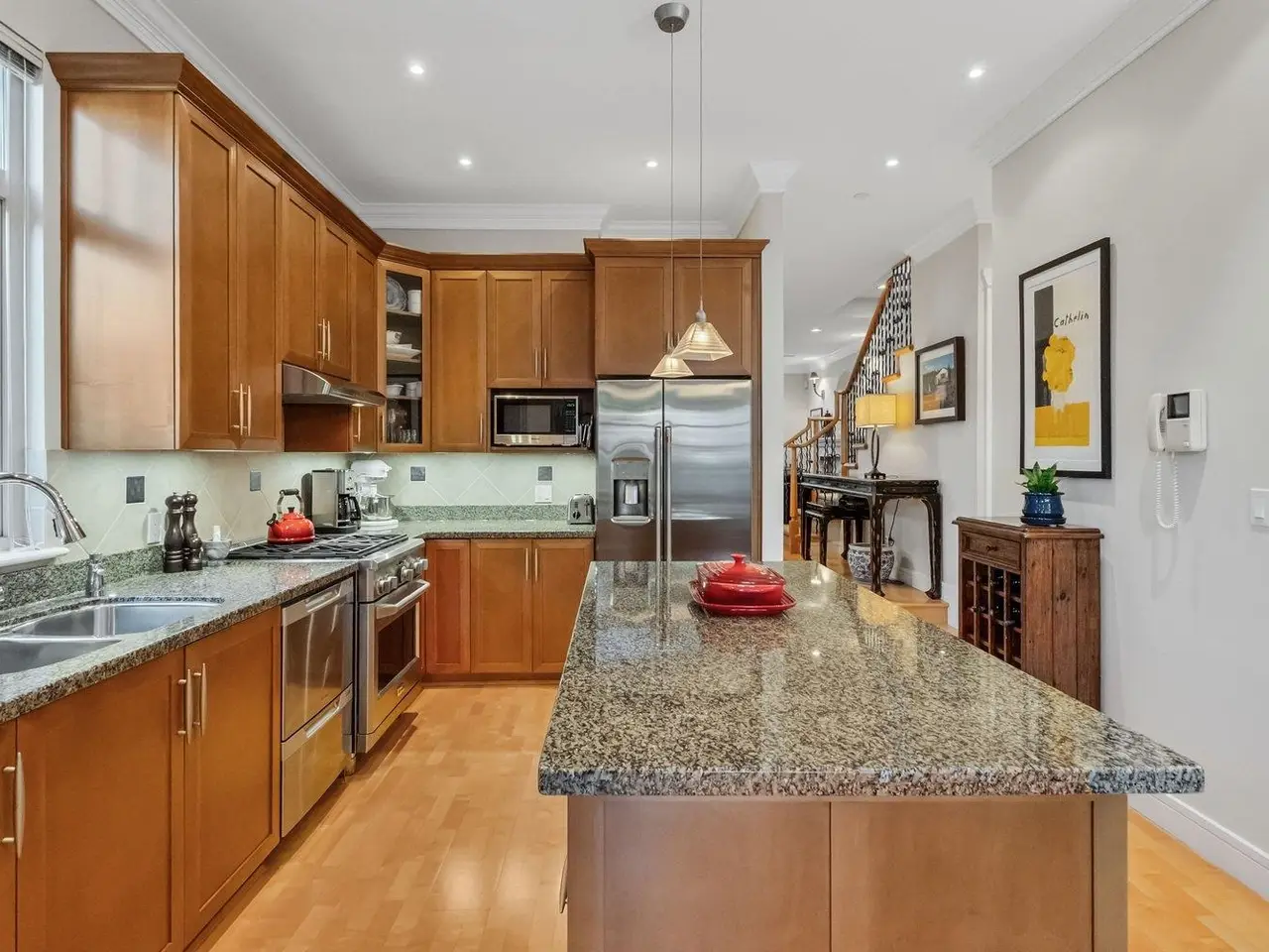 Perennial gardens lead to the front entry of this stately 4-bed, 4-bath, 3-storey Kerrisdale home. Open concept main w/ over-height ceilings, maple H/W floors, & architectural details throughout, including crown moulding, recessed bench seating in family rm, windows seat & gas F/P in living rm. Chef's kitchen w/ bespoke cabinets & island, granite counters, gas range, & S/S appliances. French doors lead to patio for seamless in/outdoor living. 2nd floor features: sprawling primary bed w/ ensuite, + 2 additional beds (one w/ vaulted ceiling), bath, & laundry. Potential 2nd primary suite on top floor w/ ensuite, W-I-C, skylight, & W-facing balcony. Serene backyard w/ professional hardscaping & custom pond.