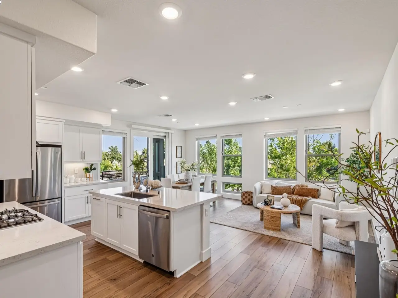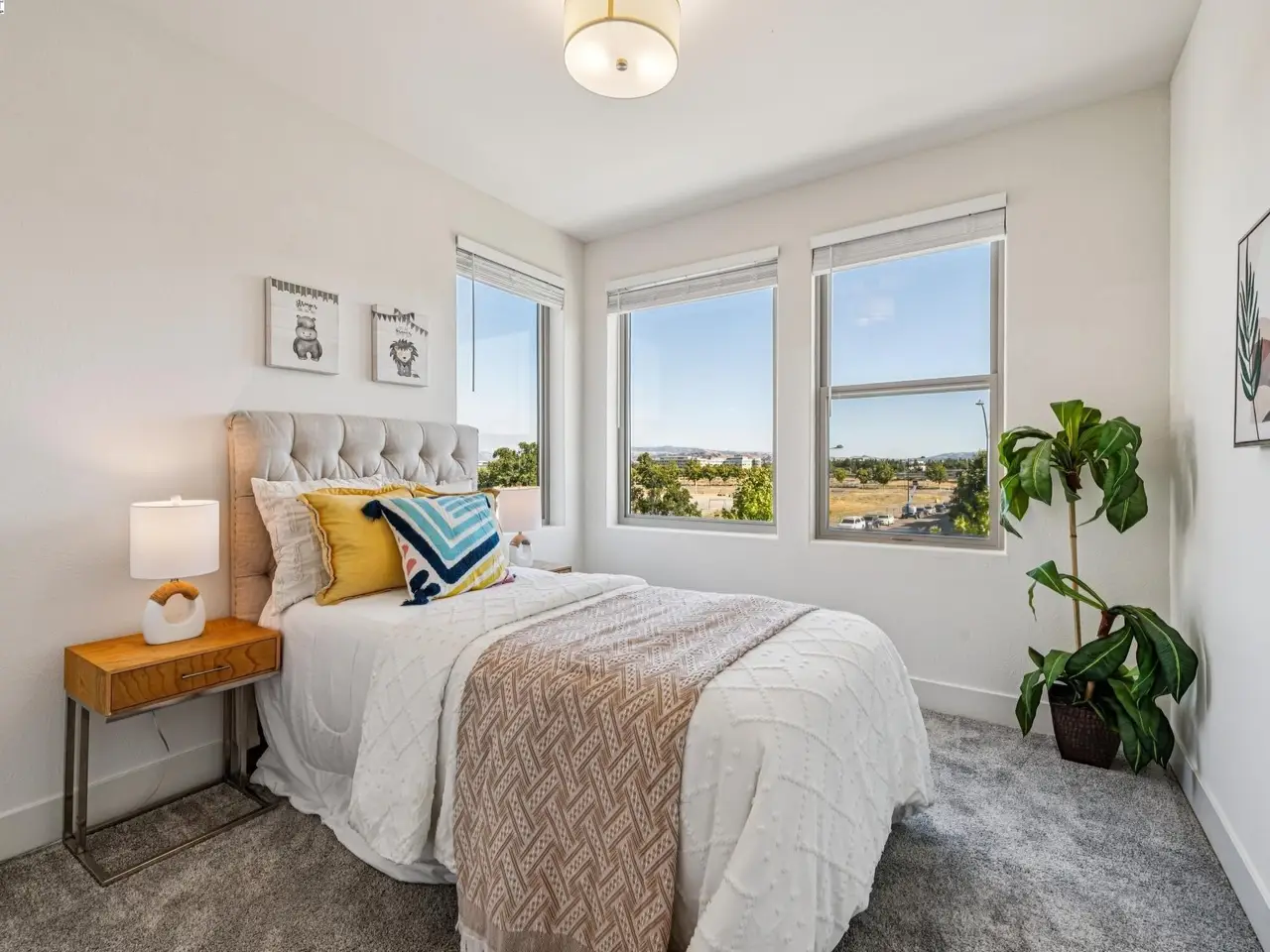 Welcome to this exceptional multi-story corner condo NORTH EAST Facing Front Door. The main level presents an inviting open living concept, flooded w/natural light from an abundance of windows that also offer stunning views. Enjoy peace & quiet thanks to the triple-paned windows designed for superior sound reduction. Contemporary kitchen, a chef's delight featuring sleek quartz countertops, elegant white shaker cabinets, a gas range, stainless steel appliances & a walk-in pantry. Spacious primary suite w/a walk-in closet, a double vanity & a large walk-in shower. 2bed/1ba on the same floor with washer/dryer in closet. Attached two-car garage w/driveway parking ensures easy access. Step out onto your private balcony to enjoy the views. Boulevard Rec Center, featuring a heated pool, meeting rooms, workout areas, a game room & outdoor lounges. Commuting is a breeze with easy access to major highways & just a 5-minute walk to BART. This prime location places you minutes from everyday essentials: groceries, banks, farmer's markets, diverse shopping options, charming cafes, exquisite dining, and entertainment at the local theater. Top-rated schools, beautiful parks, and a variety of recreational facilities are also within easy reach.