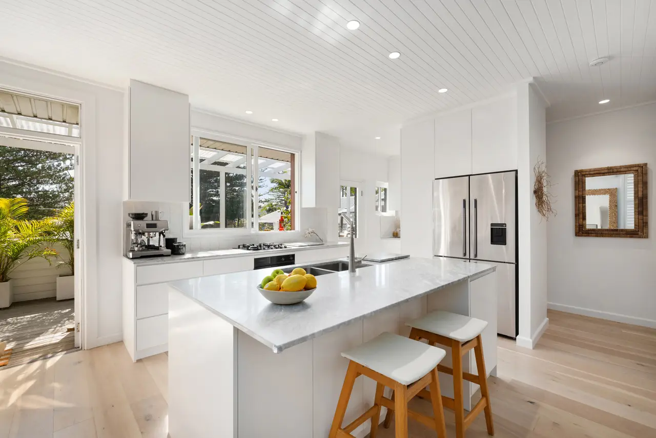 Completed just this year, the transformation of this property is simply astonishing; the creativity the design has created a wow-factor that's right off the charts. Now zoned for dual occupancy, there are two stunning homes on a single title, each one embracing a cool, beachside aesthetic to dazzling effect. Adding further appeal is the absolute privacy between the dwellings – it's been cleverly sited to provide each cottage with entirely separate entrances, lawns and gardens with views over the Norfolk Pines. Both homes are drenched with natural light; the interiors are impeccably curated, with the fresh neutral tones joined by a richly-textured material palette. There's an exceptional opportunity here for multi-generational living or shared ownership; the dual-occupancy also allows new owners to rent out one dwelling while living in the other, all in a prime North Avalon pocket. - Two chic beachside cottages, one title; perfect for shared ownership - Each feature private gardens with sheltered decks and level lawns - Both completed in 2024; open plan layouts and premium appointments - Ideal for extended families or as a passive income stream for buyers - Property is beautifully landscaped, affording privacy and greenery - Wide-plank oak floors, plantation shutters, R/C air conditioning - Dwelling 1 features a marble-topped kitchen with servery and French doors to the deck, three bedrooms, BIRs, luxe bathroom - Dwelling 2 includes a stone/induction kitchen, bifolds to the deck, two bedrooms, bathroom and a large, finished studio that can easily connect via a breezeway to the home, for additional living space, home office or detached 3rd bedroom - Clearly, its North Avalon's most versatile and stylish new offering