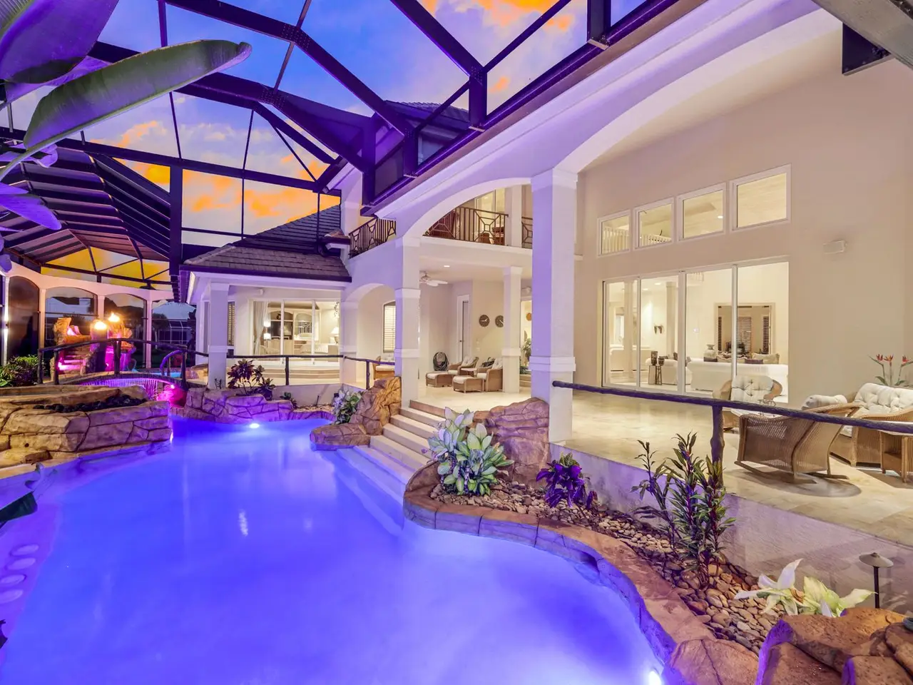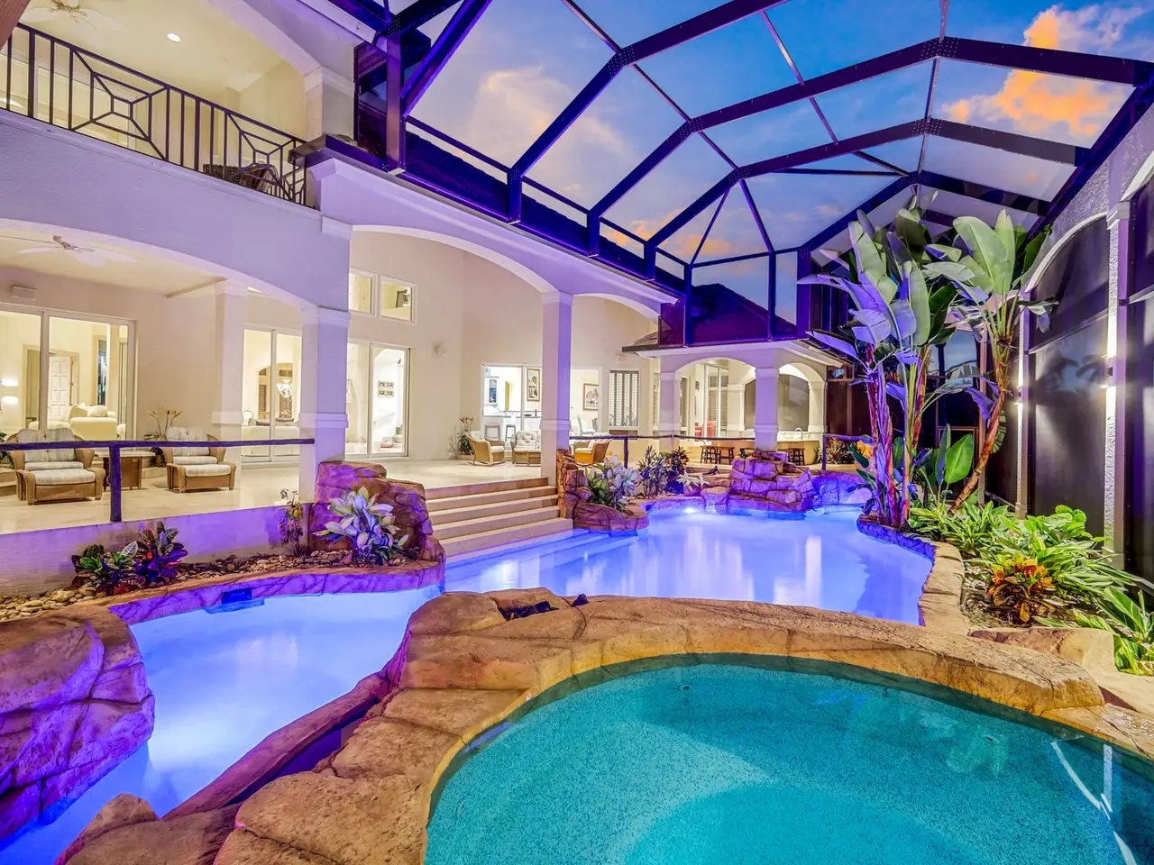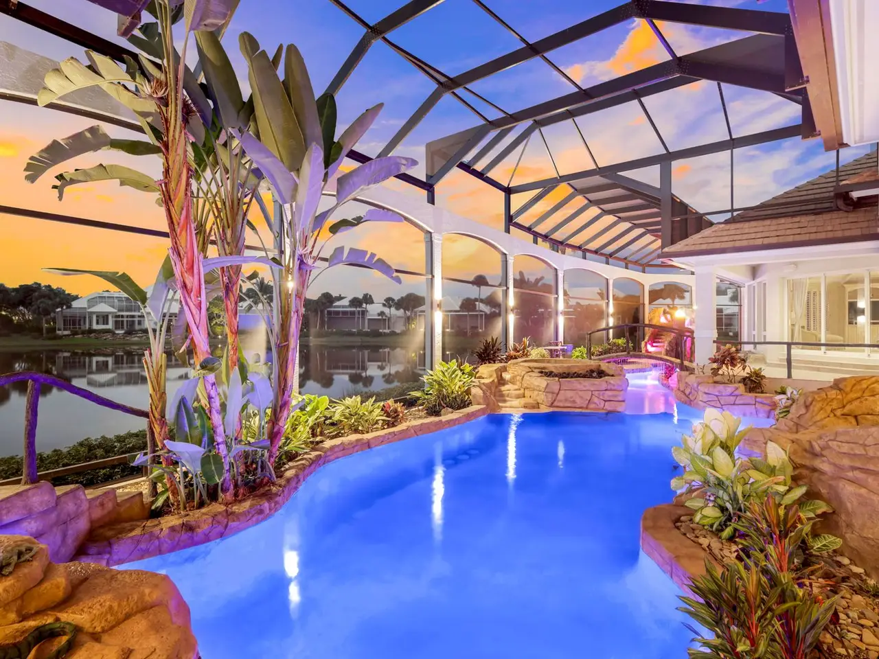 Entertainer’s dream home. This home is a must see with the largest private pool in Bonita Bay. Harwick built custom home with Harwick designed/built additions. When you walk in the door this home impresses with views of the lake and pool. This home boasts soaring Ashwood ceilings, a thirty foot keystone fireplace, four bedrooms with en suite, two half baths, home gym, office/den, formal dining, and home theater with full bath. The main bedroom has expansive sliders opening directly to the pool with lake views from every window, grand main bath, his and her water closets, walk through shower with two shower heads, fireplace, and wet bar. The pool has an expanded pool deck with five waterfalls, three fire features, spa, slide, in pool bar, an outdoor kitchen and soaring custom cage. Located in exclusive Ibis Cove directly across from the marina for boat lovers in the premier gated community of Bonita Bay. Bonita Bay Club offers a 29,000 square foot fitness complex and spa, five golf courses, eighteen tennis courts, ten pickleball courts and twelve miles of walking trails. Six restaurants at the club and marina. Bus shuttle to the private beach park on the gulf. Play golf in the morning and take your boat on a sunset cruise that night.