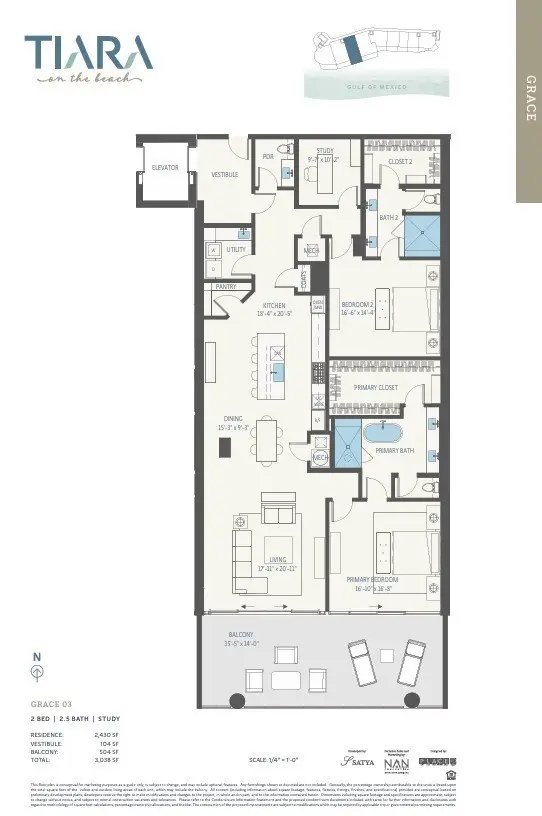 Welcome to the Grace floorplan at Tiara on the Beach - This floorplan is located on the 5th floor and redefines the art of gracious living with a private elevator vestibule, lofty 10’ ceilings, and all Thermador appliances. Contemporary and sophisticated, Tiara on the Beach will be an architectural gem nestled along one of Galveston Island’s prime locations. This luxury residence will offer an amenity-rich lifestyle on Galveston Island. Features include spacious open floor plans and endless water views. Distinctive finishes such as Italian cabinetry and the highest levels of design and craftsmanship await you. Visit our one-of-a-kind sales gallery that includes a scaled model to showcase the architecture and amenities on 300 feet of beachfront. Total square footage includes square footage of balcony. Estimated completion is 2027.