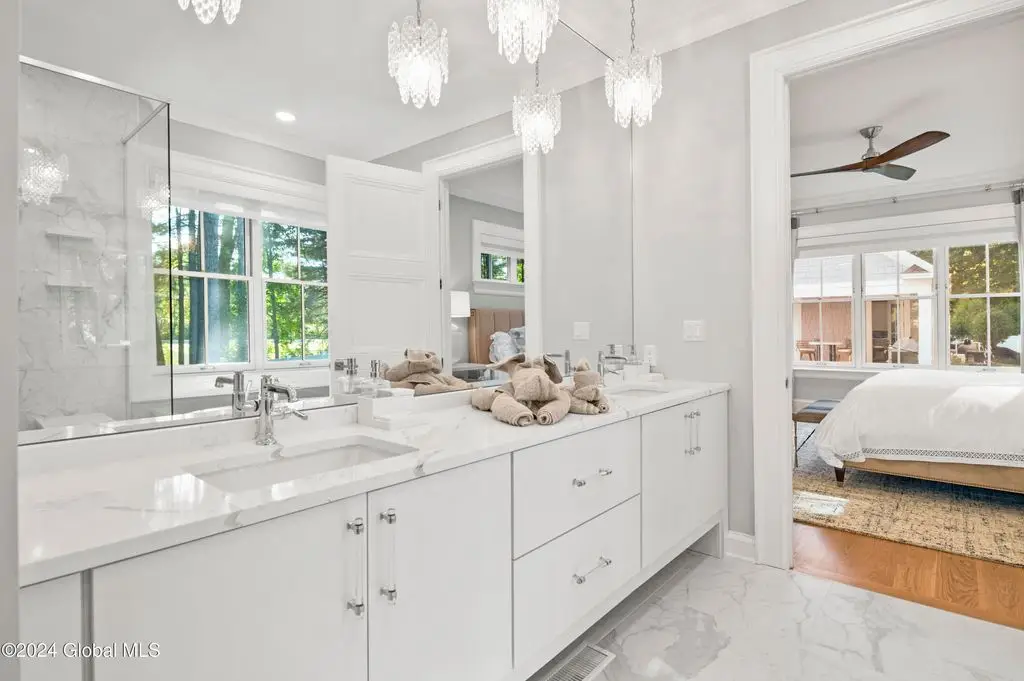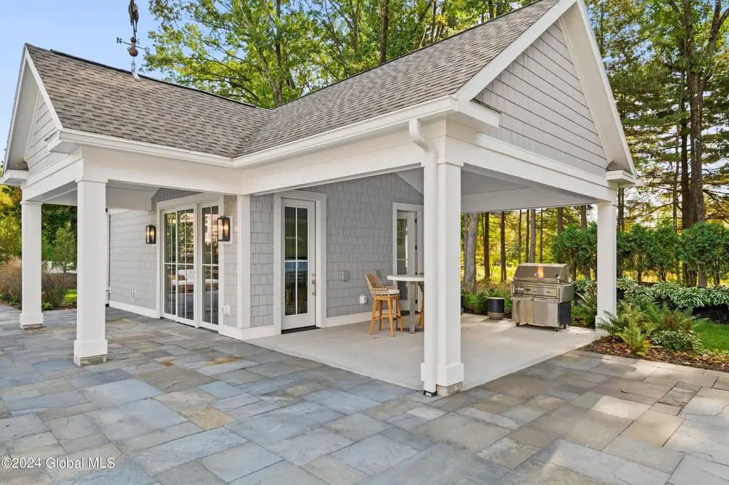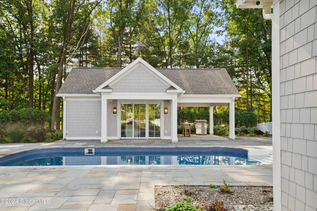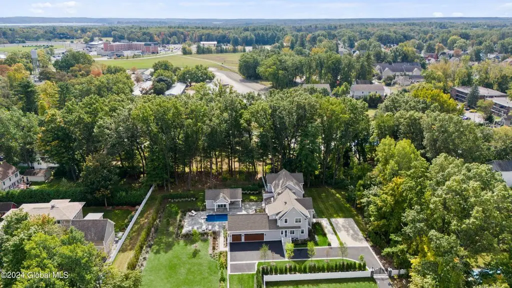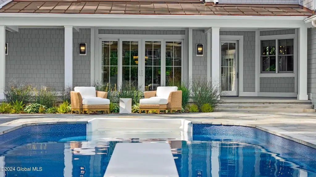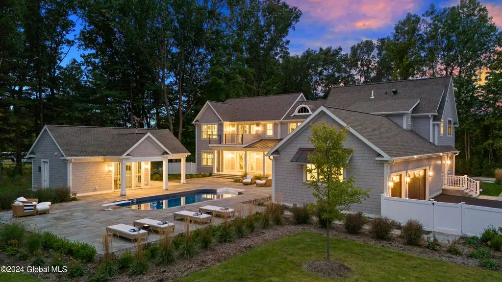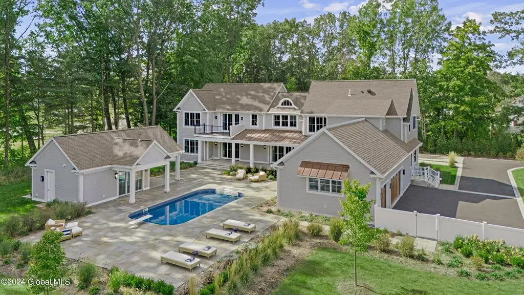 A lifestyle upgrade is waiting for you, only 1.5 blocks from Saratoga Racetrack! Turnkey luxury living; furniture included! Brand-new home, w/ 7568 sqft of finished space. Wide-plank oak floors underfoot; tray & coffered ceilings overhead. Exquisite kitchen features stone walls & countertops plus Viking & Sub-Zero appliances. 1st & 2nd floor primary suites w/ sitting rooms & opulent private baths. 2nd-floor Saratoga Room has cathedral ceiling & wet bar. Finished lower level w/ full bath & gym. IT room offers state-of-the-art technology. Sliding doors open to a serene covered-porch & pool area. Pool house features a kitchen, bath, & wet bar. 3-car garage. Fully fenced, professionally landscaped, 1.33 acres. Stylish furniture, chic decor, cookware, & cozy linens. This home is move-in ready!