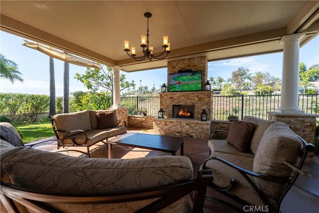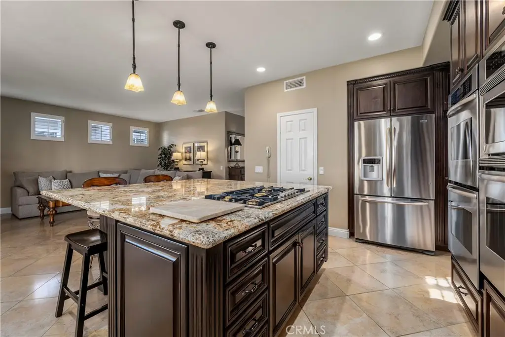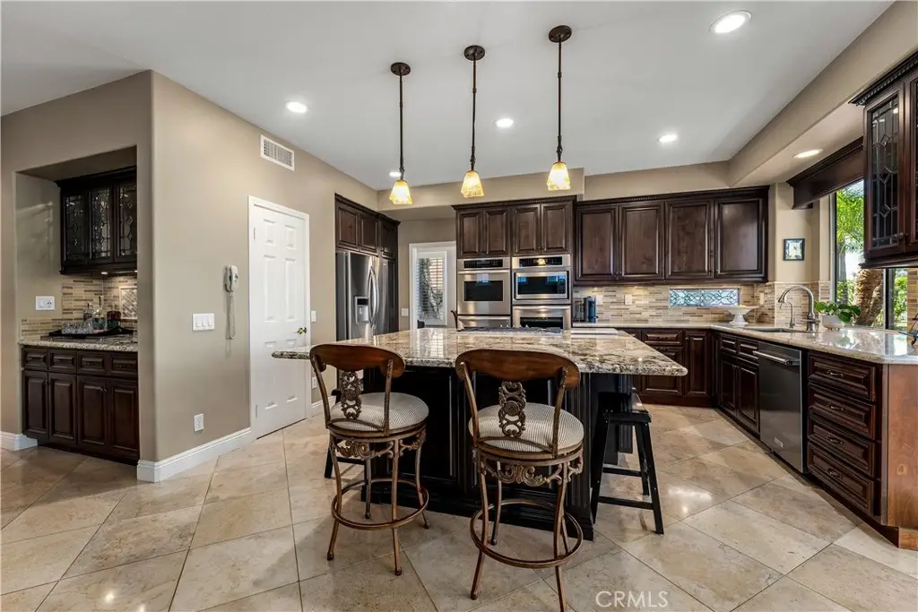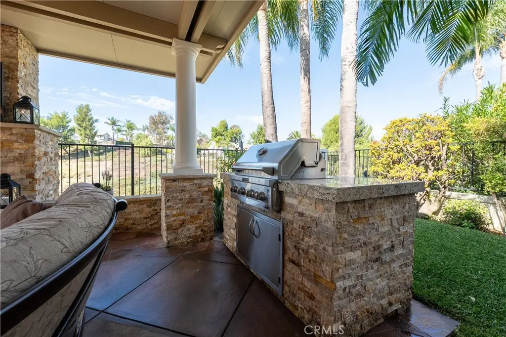 823 Cottontail Lane, Anaheim Hills 5 Bedrooms | 3 Baths | 3-Car Garage | Canyon View| Welcome to this beautifully upgraded view home in the hills of Anaheim. From the moment you arrive, the impressive curb appeal stands out with a front courtyard highlighted by a large fountain, and a colored concrete driveway accented with slate. Enter through elegant custom iron double doors into a welcoming foyer with fossilized Portuguese limestone floors. To the left, the formal living room features a custom fireplace mantel, mirrored wall, and crown molding. The adjoining formal dining room offers wood shutters and a sliding glass door that opens to the backyard patio, creating a seamless indoor/outdoor flow. The upgraded kitchen is a chef's delight with rich cabinetry, granite counters, tile backsplash, and an oversized island with bar seating and a five-burner cooktop. High-end Thermador appliances include three ovens and a microwave. Recessed and pendant lighting illuminate the space. The kitchen opens to the inviting family room complete with a brick fireplace, custom mantel, and a granite-topped wet bar--perfect for entertaining. The main level also includes a bedroom and an upgraded three-quarter bath, plus a convenient laundry room with sink. Upstairs, the spacious primary suite features double door entry, a retreat, ceiling fan, walk-in closet, and a private balcony to take in the serene canyon views. A double-sided fireplace warms both the retreat and the luxurious primary bath with dual vanities, upgraded cabinetry, recessed lighting, chandelier, a jetted tub, separate shower, and private toilet room. Three additional bedrooms--one currently used as a bonus room--share a well-appointed hall bath with dual sinks and a tub/shower combination. Step outside to a stunning backyard designed for entertaining, complete with an alumawood patio cover, outdoor fireplace, chandelier, mounted TV, BBQ island, and a soothing fountain--all set against a tranquil canyon backdrop. Additional features include wood shutters on all windows, a whole-house water softener and filtration system, and dual-zone heating and air conditioning for year-round comfort. Close to award winning schools, shopping, restaurants and freeways