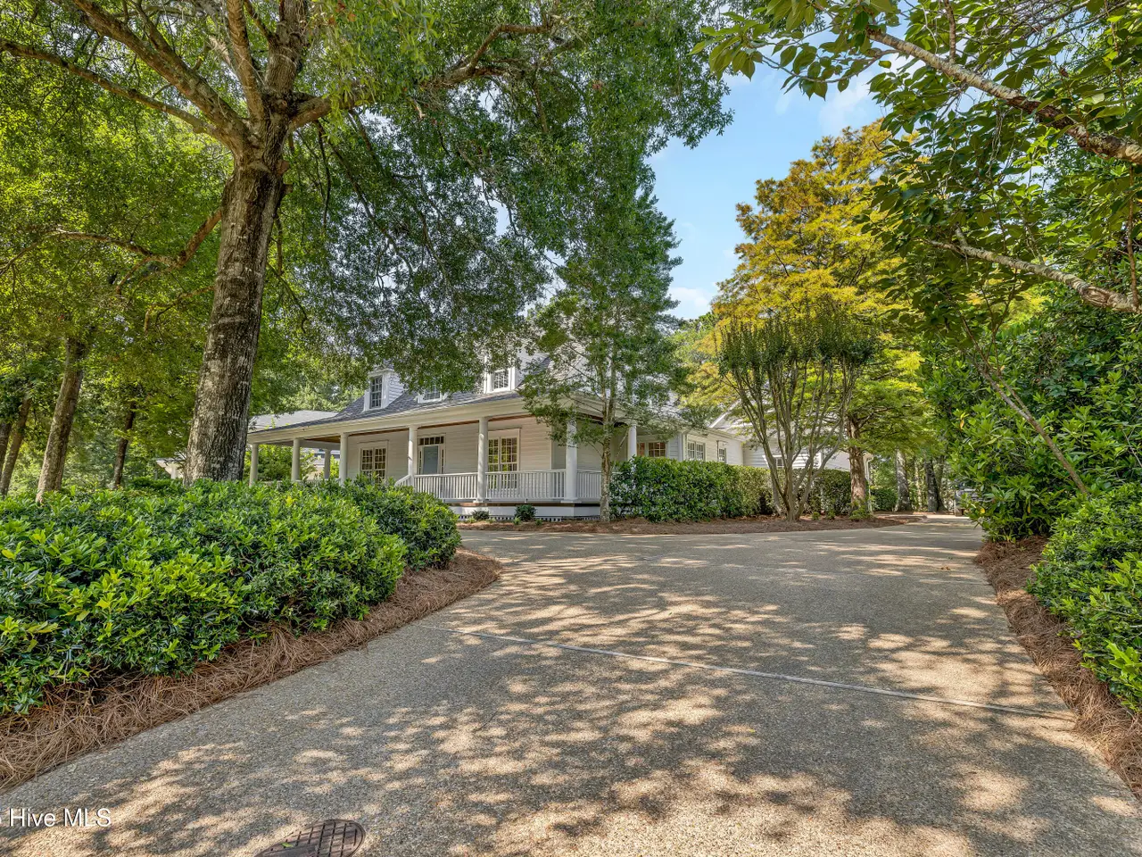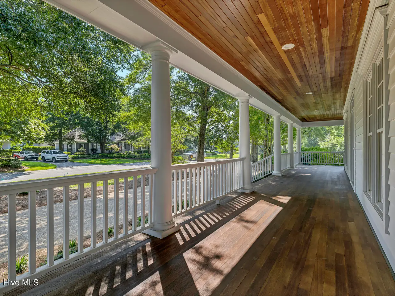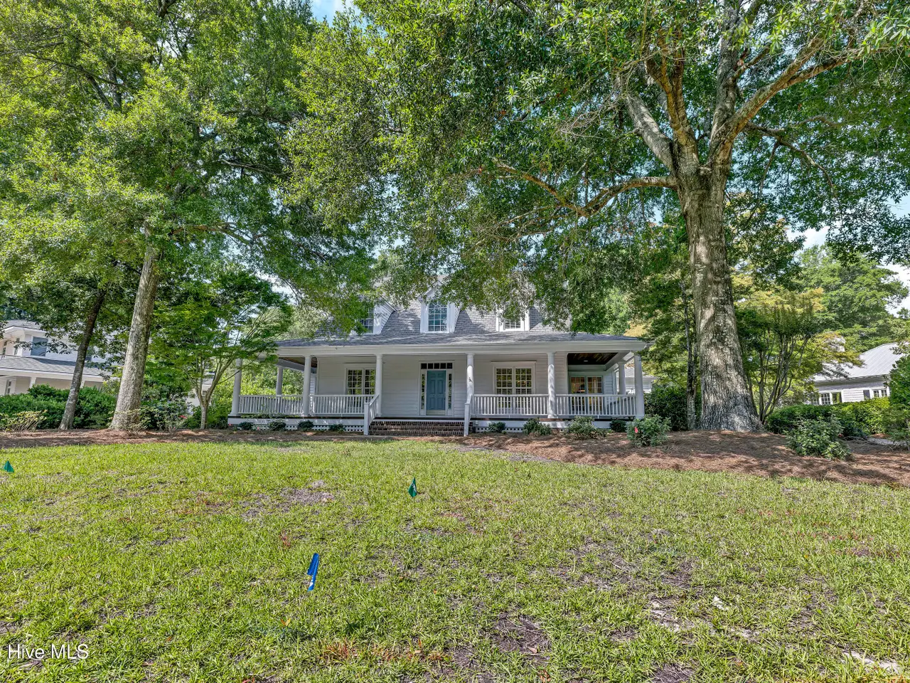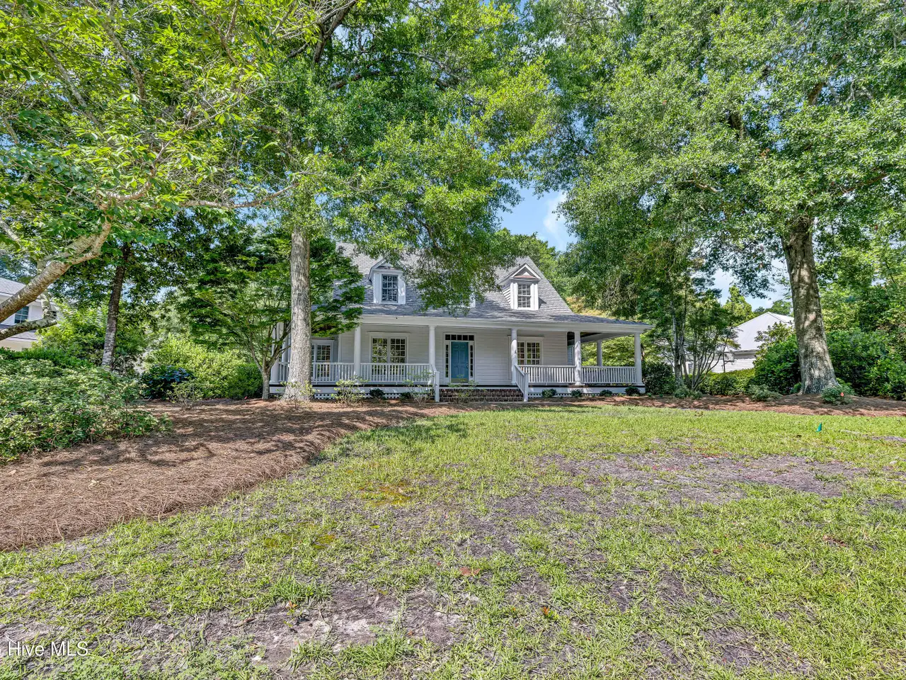 Newly renovated home in one of Landfall's most sought after neighborhoods. Charming southern-inspired design by Scott Sullivan. Curb appeal abounds with stately live oak trees, lush landscaping, and a circular aggregate driveway. The welcoming entrance features a large wraparound porch with Ipe decking, tongue and groove ceiling and partial views of the ICWW over the Nicklaus Ocean course. Upon entering the home, you are greeted with newly refinished hardwood floors, 9' ceilings, heavy crown molding, picture frame moldings and chair rail. To the left is an office with French glass doors, and to the right, a formal dining room that leads to the newly updated kitchen. The large primary bedroom is located on the first floor and features separate walk-in closets and a partial view of the ICWW and Ocean Course. The second floor has three bedrooms, offering separation and privacy, plus an oversized bonus room. An exceptionally bright home with large windows that capture the sun throughout the day. The back of the house features a screened-in porch, open deck, and large backyard with plenty of room to add a pool. The side-loading three-car garage provides plenty of storage area, along with a newly epoxied floor and a utility room with an extra refrigerator-freezer. The new homeowner will enjoy numerous upgrades, including refinished hardwood floors, new carpeting, and fresh paint throughout, two new HVAC systems, new chandeliers, and recessed LED canned lights. New interior doors and hardware. The kitchen has been updated with Quartz countertops and new stainless LG appliances with a natural gas range. Quartz countertops, cabinets, and sconce lighting in the bathrooms. All of this on a large .46-acre lot - your forever home awaits.