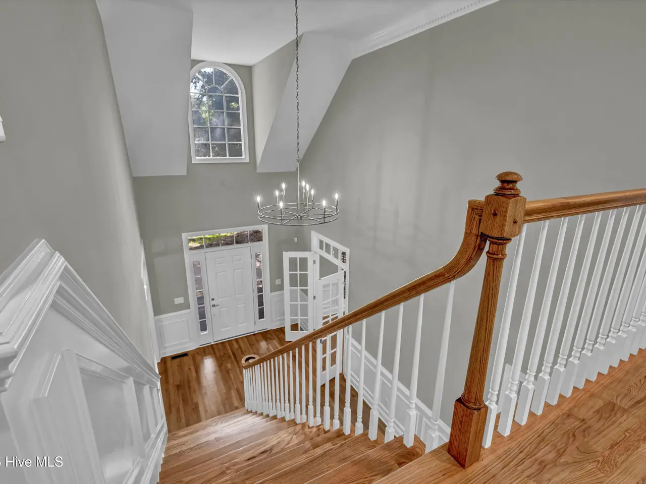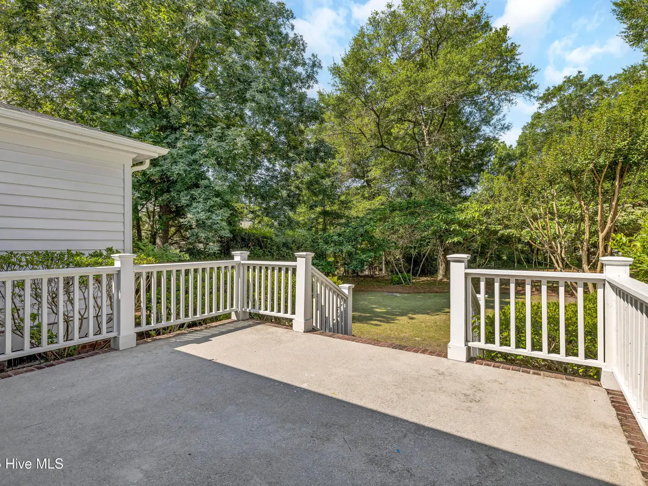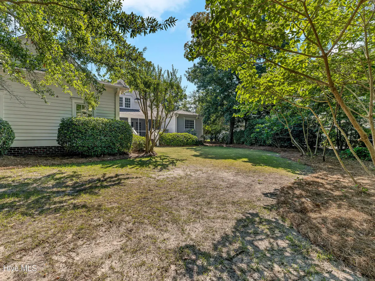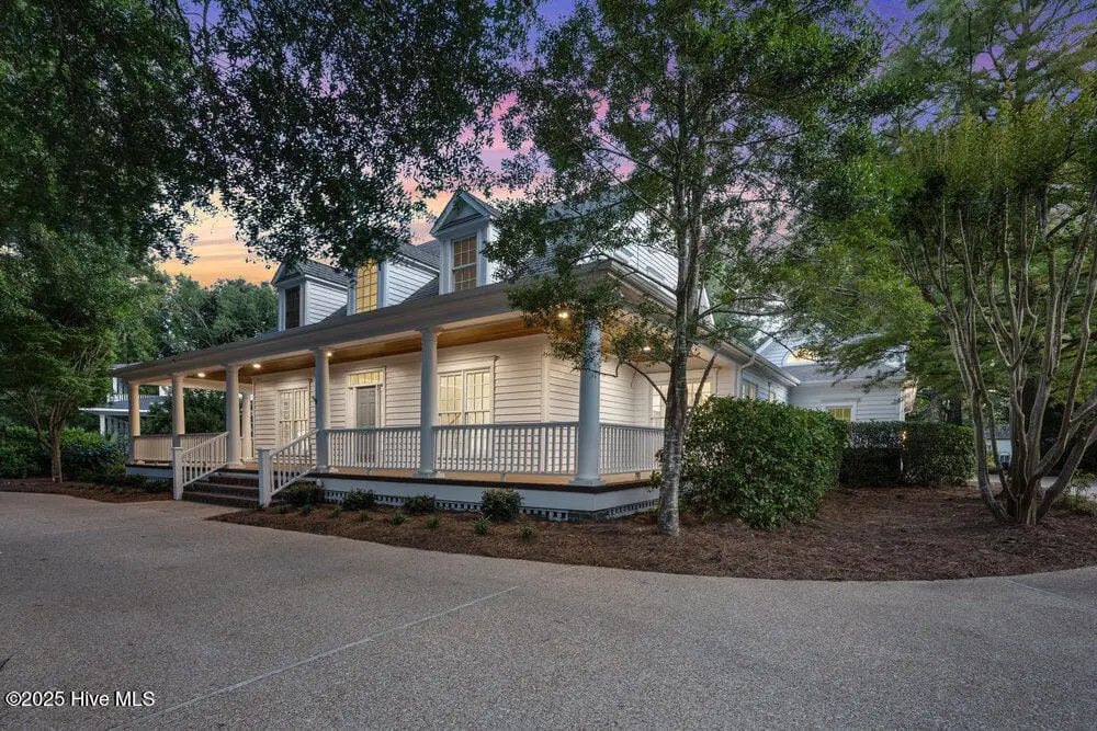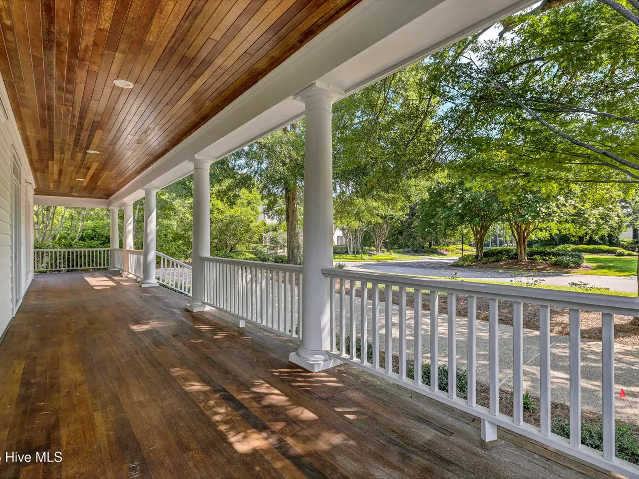 Newly renovated home in one of Landfall's most sought after neighborhoods. Charming southern-inspired design by Scott Sullivan. Curb appeal abounds with stately live oak trees, lush landscaping, and a circular aggregate driveway. The welcoming entrance features a large wraparound porch with Ipe decking, tongue and groove ceiling and partial views of the ICWW over the Nicklaus Ocean course. Upon entering the home, you are greeted with newly refinished hardwood floors, 9' ceilings, heavy crown molding, picture frame moldings and chair rail. To the left is an office with French glass doors, and to the right, a formal dining room that leads to the newly updated kitchen. The large primary bedroom is located on the first floor and features separate walk-in closets and a partial view of the ICWW and Ocean Course. The second floor has three bedrooms, offering separation and privacy, plus an oversized bonus room. An exceptionally bright home with large windows that capture the sun throughout the day. The back of the house features a screened-in porch, open deck, and large backyard with plenty of room to add a pool. The side-loading three-car garage provides plenty of storage area, along with a newly epoxied floor and a utility room with an extra refrigerator-freezer. The new homeowner will enjoy numerous upgrades, including refinished hardwood floors, new carpeting, and fresh paint throughout, two new HVAC systems, new chandeliers, and recessed LED canned lights. New interior doors and hardware. The kitchen has been updated with Quartz countertops and new stainless LG appliances with a natural gas range. Quartz countertops, cabinets, and sconce lighting in the bathrooms. All of this on a large .46-acre lot - your forever home awaits.