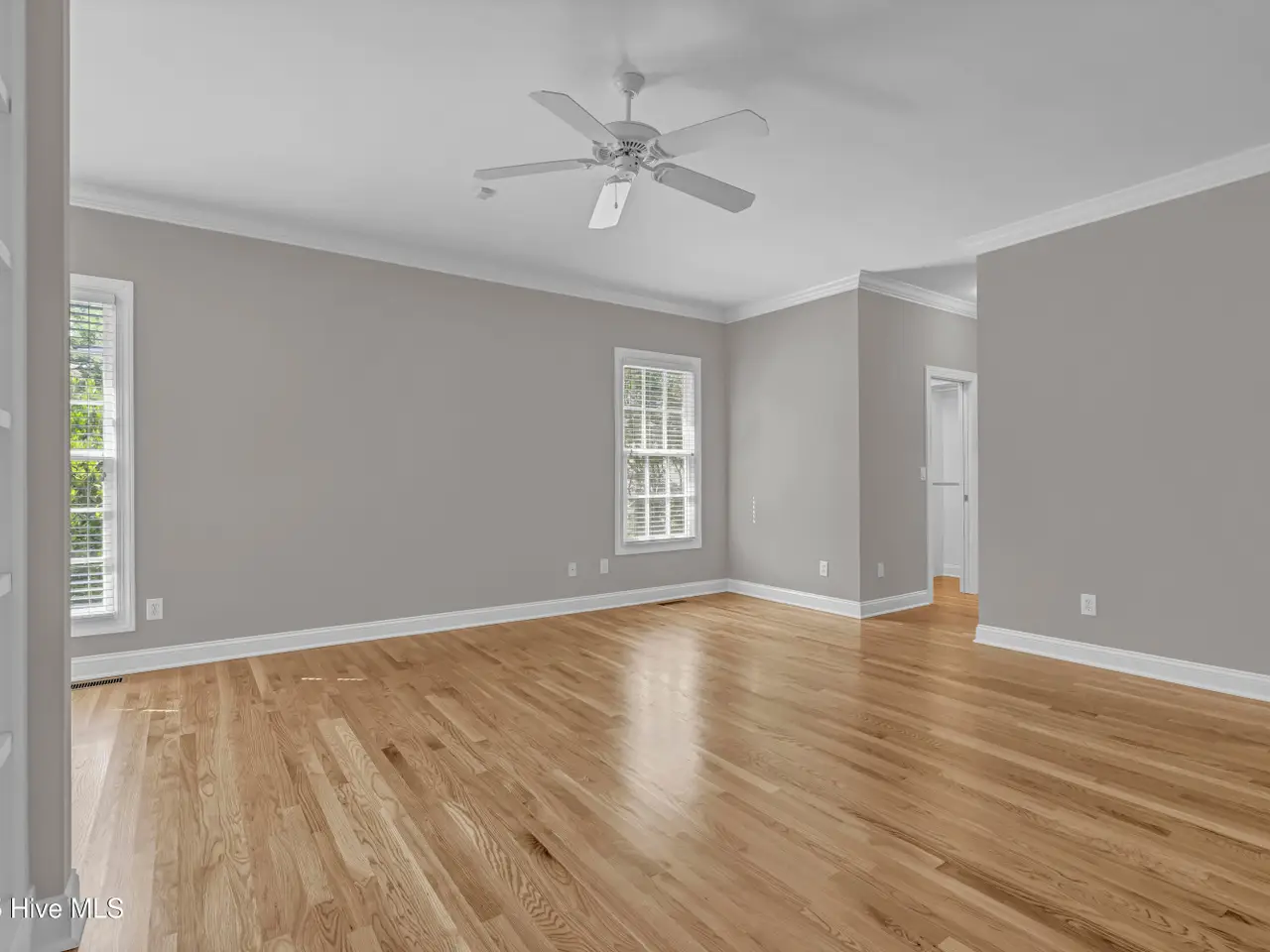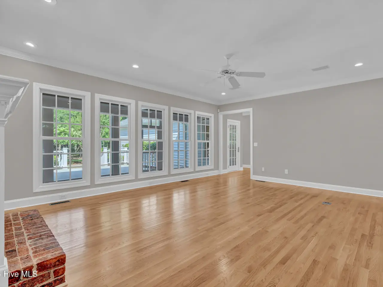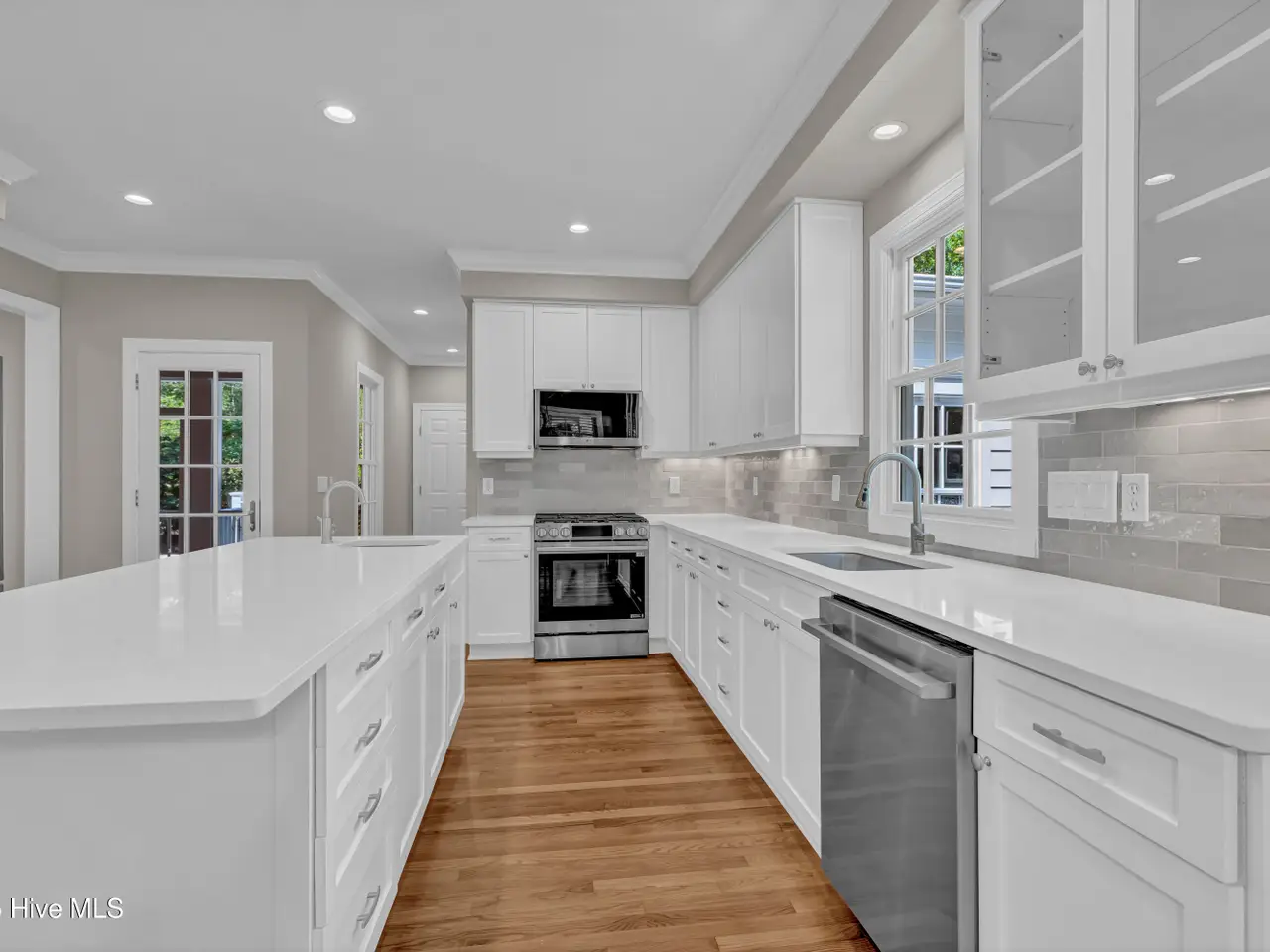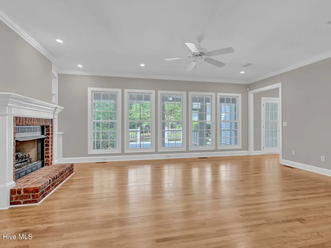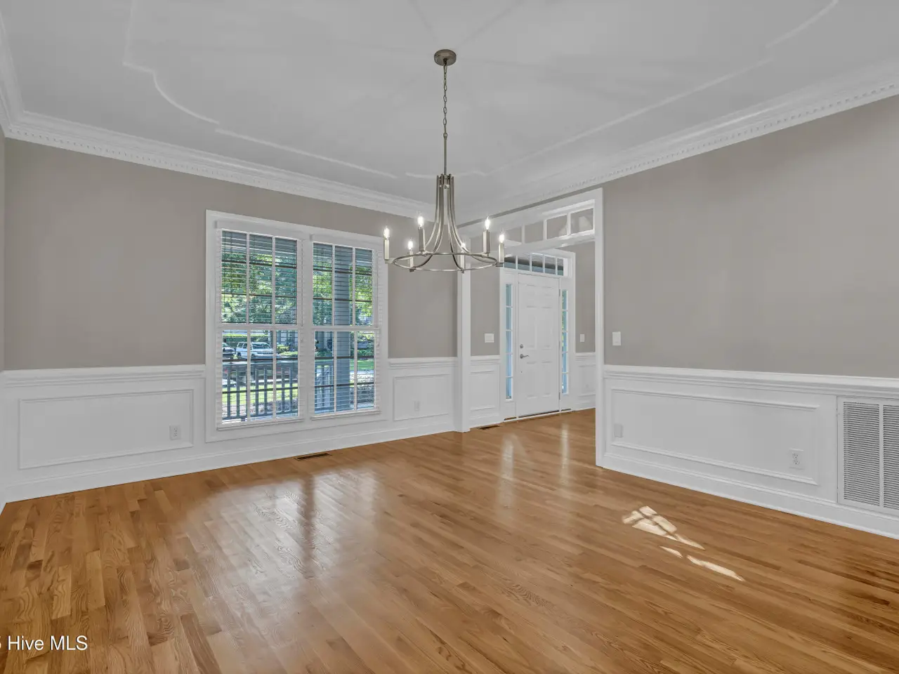 Newly renovated home in one of Landfall's most sought after neighborhoods. Charming southern-inspired design by Scott Sullivan. Curb appeal abounds with stately live oak trees, lush landscaping, and a circular aggregate driveway. The welcoming entrance features a large wraparound porch with Ipe decking, tongue and groove ceiling and partial views of the ICWW over the Nicklaus Ocean course. Upon entering the home, you are greeted with newly refinished hardwood floors, 9' ceilings, heavy crown molding, picture frame moldings and chair rail. To the left is an office with French glass doors, and to the right, a formal dining room that leads to the newly updated kitchen. The large primary bedroom is located on the first floor and features separate walk-in closets and a partial view of the ICWW and Ocean Course. The second floor has three bedrooms, offering separation and privacy, plus an oversized bonus room. An exceptionally bright home with large windows that capture the sun throughout the day. The back of the house features a screened-in porch, open deck, and large backyard with plenty of room to add a pool. The side-loading three-car garage provides plenty of storage area, along with a newly epoxied floor and a utility room with an extra refrigerator-freezer. The new homeowner will enjoy numerous upgrades, including refinished hardwood floors, new carpeting, and fresh paint throughout, two new HVAC systems, new chandeliers, and recessed LED canned lights. New interior doors and hardware. The kitchen has been updated with Quartz countertops and new stainless LG appliances with a natural gas range. Quartz countertops, cabinets, and sconce lighting in the bathrooms. All of this on a large .46-acre lot - your forever home awaits.