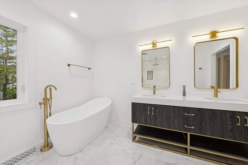 Every detail has been reimagined in this 4 bedroom + bonus room, 4 bath Hinsdale masterpiece, set on an extra wide 66' lot just steps from The Lane elementary. A full 2025 renovation includes a brand new floor plan, elevated design and modern finishes throughout. Step inside to discover a reimagined interior, with new hardwood floors sweeping across the first and second levels, complimented by fresh paint, flawless new drywall and insulation, and sophisticated modern lighting that illuminates every space with warmth. The heart of the home is the new chef's kitchen, anchored by a striking 10' quartz island with seating for five, custom cabinetry and open shelving, tile backsplash, sculptural chandelier and all new appliances. A hidden walk-in coffee station/pantry adds everyday convenience, opening seamlessly to the sunlit breakfast area, complete with a brick wood burning fireplace. Designed for modern living, the first floor features a private office with custom built in shelves and desk, which can optionally be converted to an additional first floor bedroom. The first floor showcases a dining room adorned with elegant picture frame molding and a statement chandelier, a light filled family room designed for gathering, a thoughtfully crafted oversized mudroom with custom built in bench, and a sleek new contemporary bathroom with shower. Upstairs, the primary suite is a true retreat, offering a walk out balcony, custom walk-in closet with new front loading smart washer and dryer, hardwood floors and a completely renovated spa inspired bathroom with a soaking tub, double vanity, Carrara marble tile, contemporary lighting and a shower featuring 6 body sprayers. Three additional oversized bedrooms are located on the second level with hardwood floors and a new updated shared bath with double vanity and modern lighting. The lower level features a spacious recreation room with wine storage area, an additional bonus room that can be used as a bedroom with an en suite renovated full bath, abundant storage and durable new hard surface flooring. Dual laundry centers on both the second and lower levels - both with brand new washer and dryers - deliver everyday convenience. Outdoors, enjoy a professionally landscaped yard with abundant green space, new paver patio and freshly painted exterior. A 2.5 car detached garage, Google nest thermostat and front door camera complete this turn-key home.