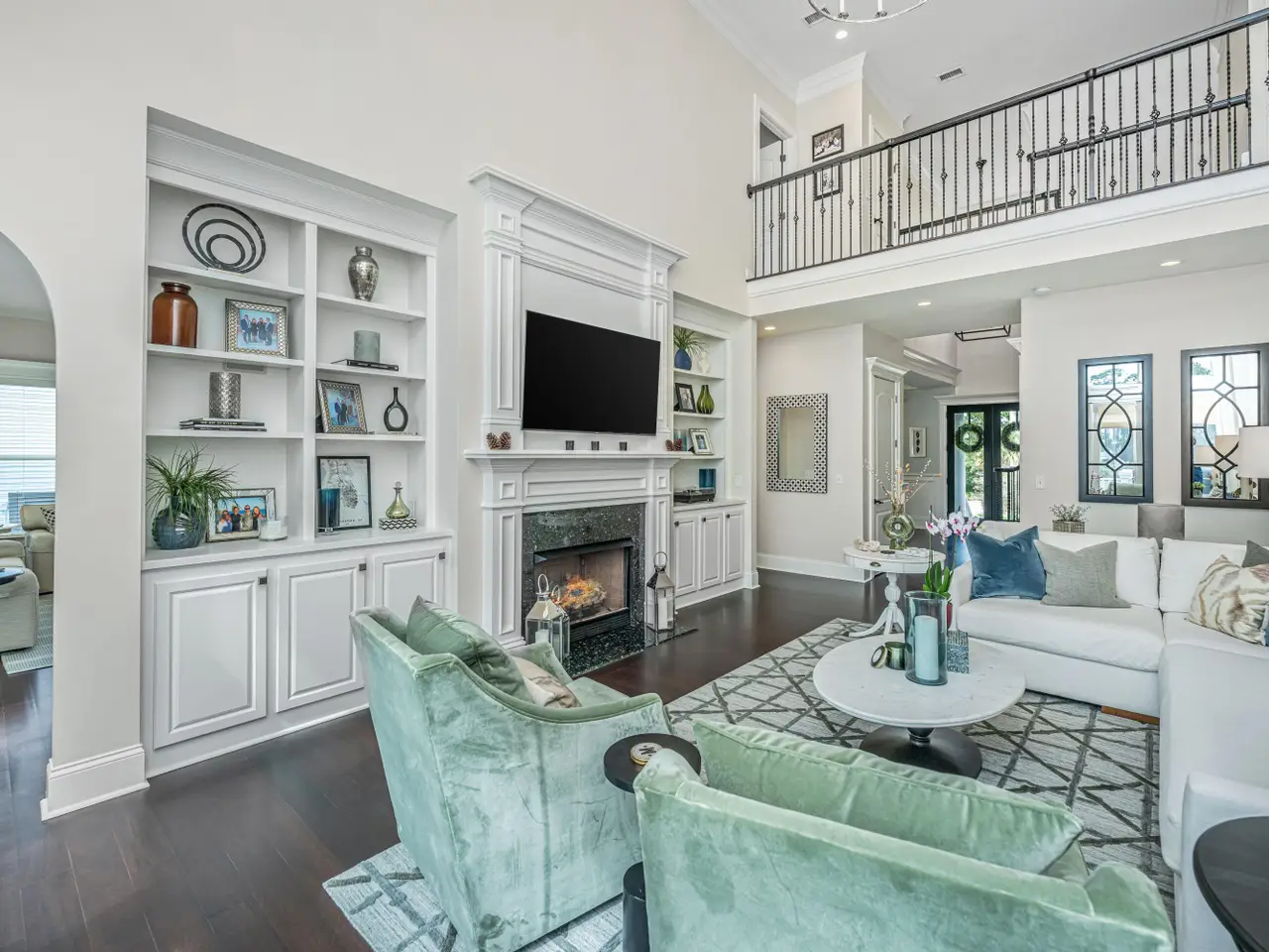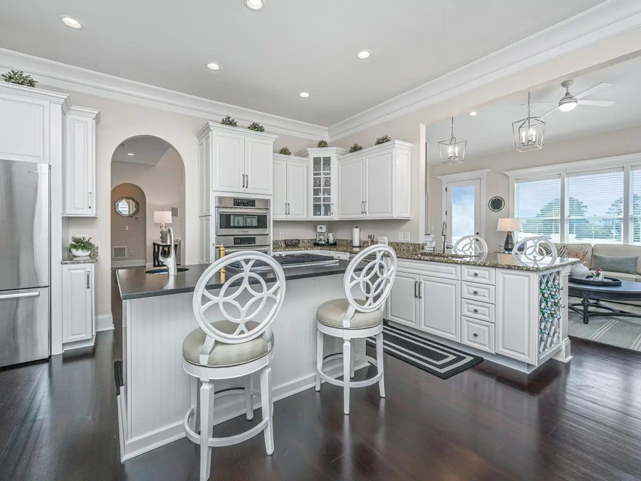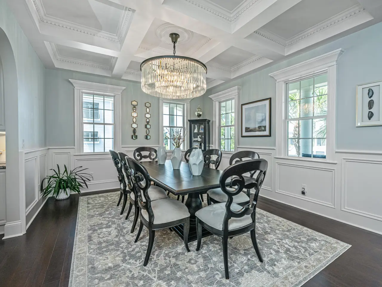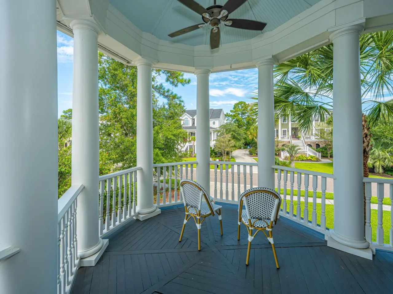 Welcome to this meticulously maintained elevated 5 Bedroom/4 Bath quintessential Charleston home located in Rivertowne Country Club with a center view of the large pond. This home offers timeless elegance and numerous modern upgrades throughout. From the moment you arrive you'll appreciate the inviting wrap around porch with gazebo great for rocking or having a leisurely breakfast. Then step into the bright spacious interior featuring coffered ceilings in the dining room and downstairs bedroom, wainscoting, 10' ceilings, 12'' moldings, 8'' baseboards, and 8' solid interior doors downstairs, 6' upstairs, iron stair railings, adding sophistication to every room. In addition, the home boasts all new light fixtures and ceiling fans, freshly painted neutral interior, new carpets andre-finished hardwood floors. The spacious large living room features a dramatic two-story ceiling, French Doors, completely trimmed first and second story windows, built-in bookshelves with large lower cabinets, gas fireplace with granite surround, and a large TV niche over the fireplace with surround sound system - perfect for game days or movie nights. Arched doorways lead you to the white cabinet eat in kitchen complete with center island with bar seating, all new Bosch/Kitchenaid appliances and an open layout to the spacious family room - perfect for everyday living and intimate gatherings. Retreat to the primary suite with tray ceilings, two walk in closets, luxury spa bath and shower and two separate sink areas with direct access to the covered screened porch. The second level offers 3 large spacious bedrooms - one with an ensuite and walk in closet and the others with jack and jill bathroom. An elevator shaft is already in place for all 3 floors offering current additional storage. The drive under 3-car garage offers enough room for 5 car spaces, workshop, man cave and work out area complete with Race Deck flooring. Thermal tint on all back windows to protect from heat. The exterior highlights include landscape lighting, French Drain, New Roof (2023), rock ribbon flower beds, 4 mature Palmetto palm trees, and tankless water heater. Move-in ready! Welcome Home! Rivertowne Country Club is an Arnold Palmer signature course and is rated 4.5 stars by golf digest.