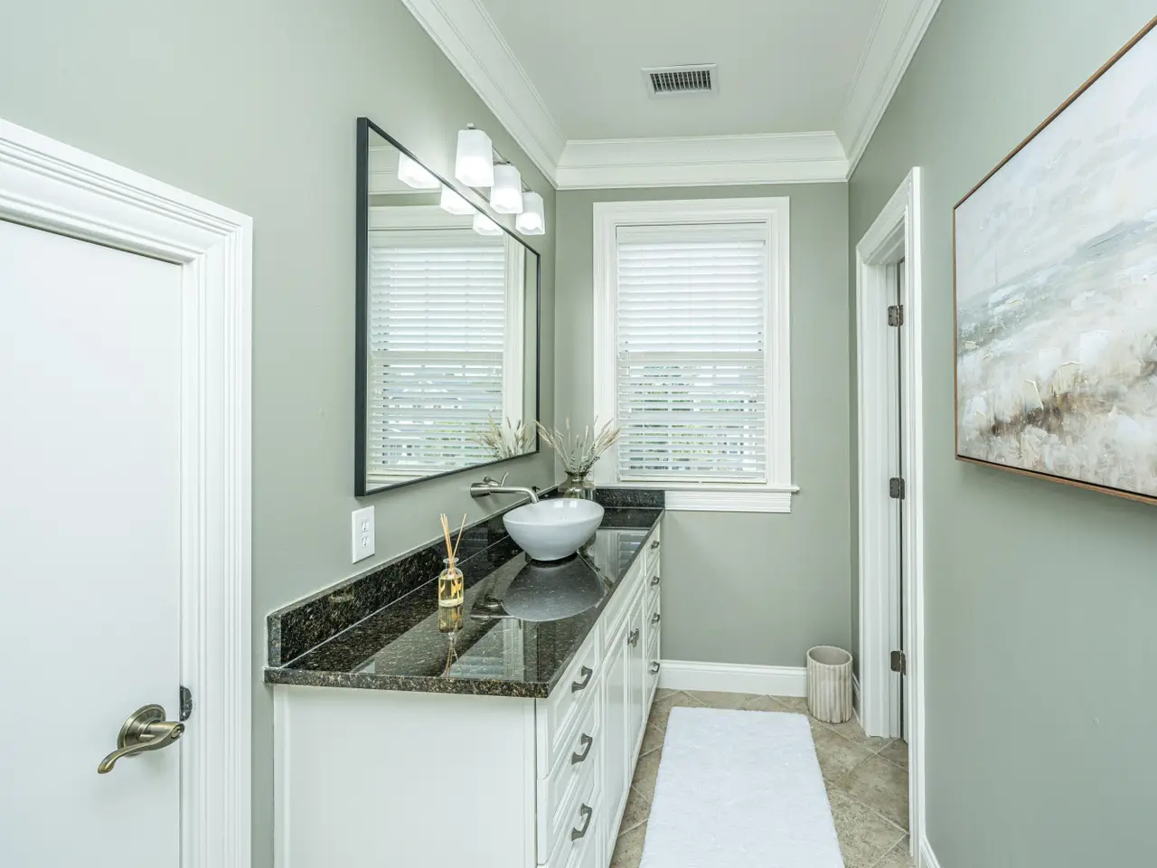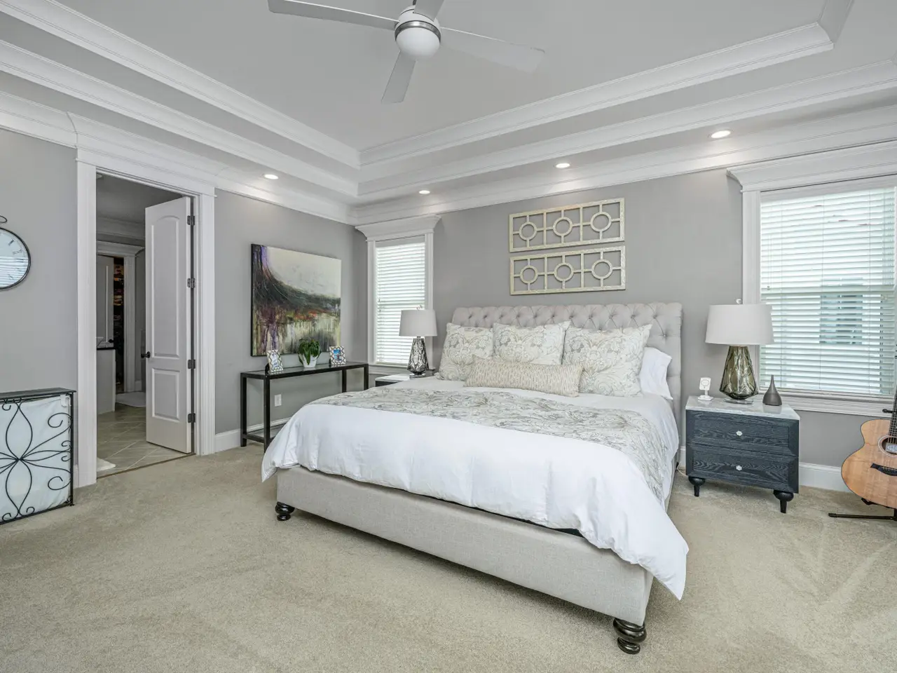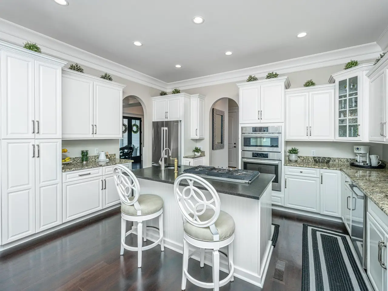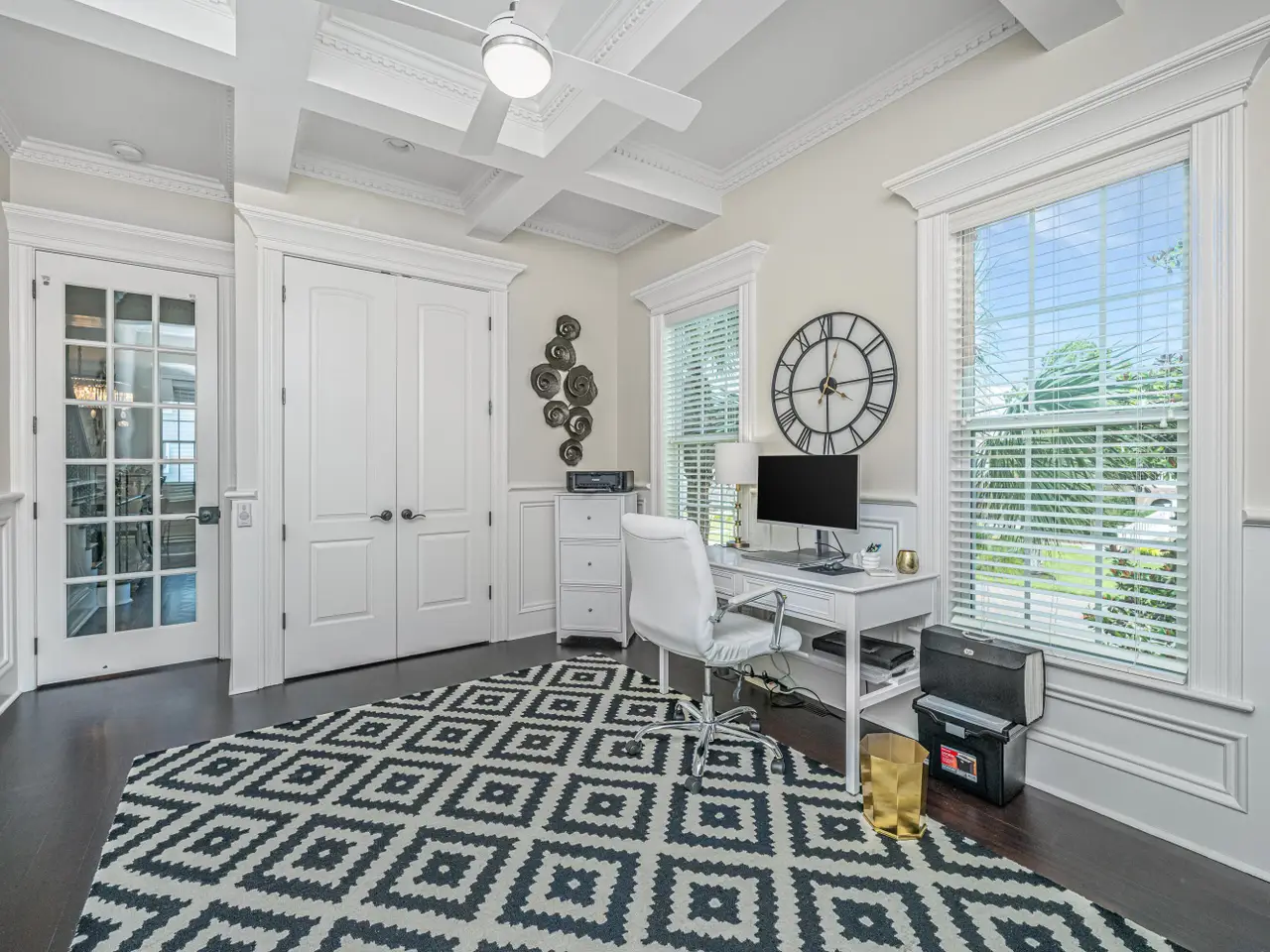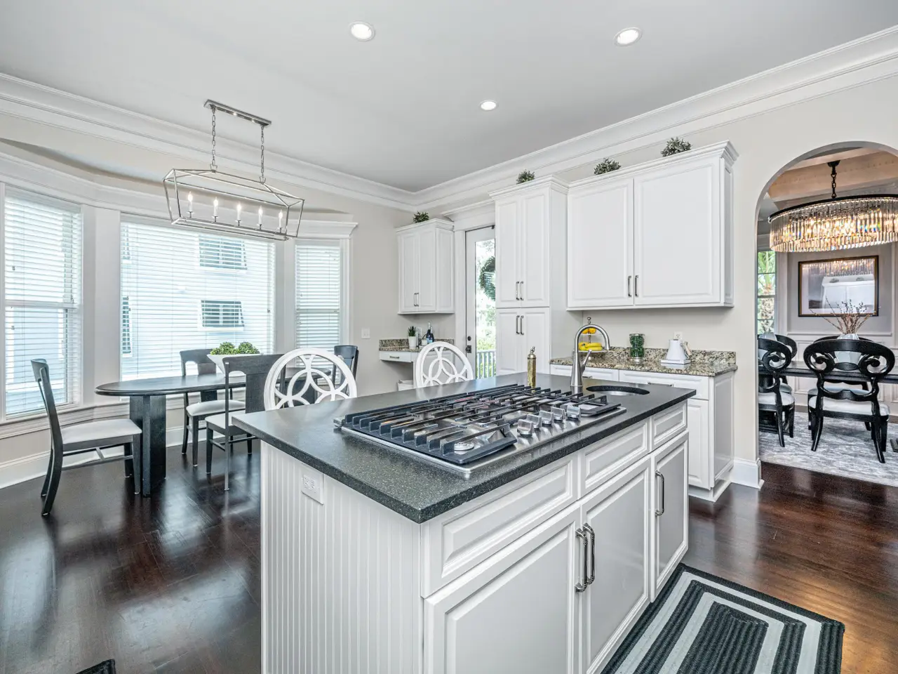 Welcome to this meticulously maintained elevated 5 Bedroom/4 Bath quintessential Charleston home located in Rivertowne Country Club with a center view of the large pond. This home offers timeless elegance and numerous modern upgrades throughout. From the moment you arrive you'll appreciate the inviting wrap around porch with gazebo great for rocking or having a leisurely breakfast. Then step into the bright spacious interior featuring coffered ceilings in the dining room and downstairs bedroom, wainscoting, 10' ceilings, 12'' moldings, 8'' baseboards, and 8' solid interior doors downstairs, 6' upstairs, iron stair railings, adding sophistication to every room. In addition, the home boasts all new light fixtures and ceiling fans, freshly painted neutral interior, new carpets andre-finished hardwood floors. The spacious large living room features a dramatic two-story ceiling, French Doors, completely trimmed first and second story windows, built-in bookshelves with large lower cabinets, gas fireplace with granite surround, and a large TV niche over the fireplace with surround sound system - perfect for game days or movie nights. Arched doorways lead you to the white cabinet eat in kitchen complete with center island with bar seating, all new Bosch/Kitchenaid appliances and an open layout to the spacious family room - perfect for everyday living and intimate gatherings. Retreat to the primary suite with tray ceilings, two walk in closets, luxury spa bath and shower and two separate sink areas with direct access to the covered screened porch. The second level offers 3 large spacious bedrooms - one with an ensuite and walk in closet and the others with jack and jill bathroom. An elevator shaft is already in place for all 3 floors offering current additional storage. The drive under 3-car garage offers enough room for 5 car spaces, workshop, man cave and work out area complete with Race Deck flooring. Thermal tint on all back windows to protect from heat. The exterior highlights include landscape lighting, French Drain, New Roof (2023), rock ribbon flower beds, 4 mature Palmetto palm trees, and tankless water heater. Move-in ready! Welcome Home! Rivertowne Country Club is an Arnold Palmer signature course and is rated 4.5 stars by golf digest.