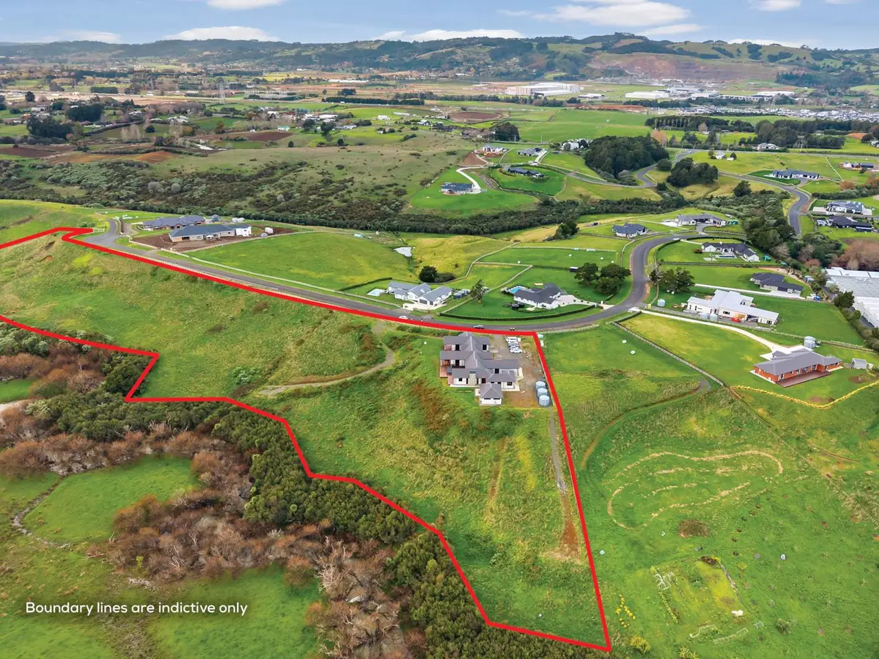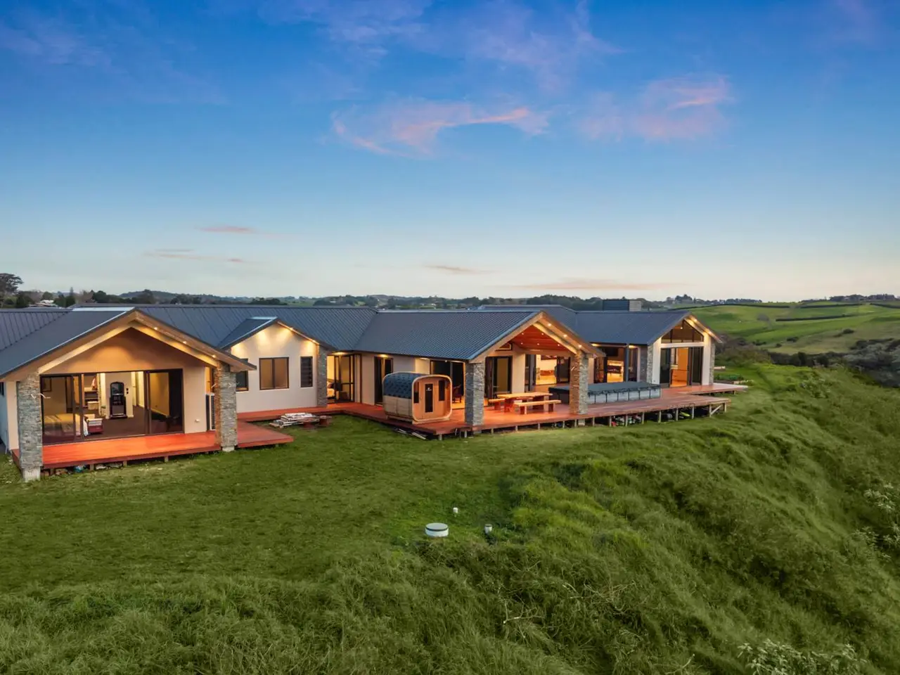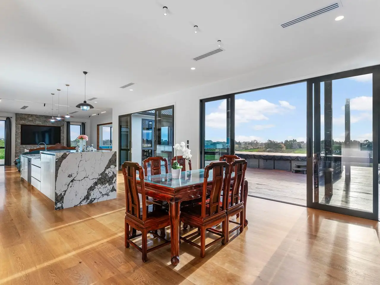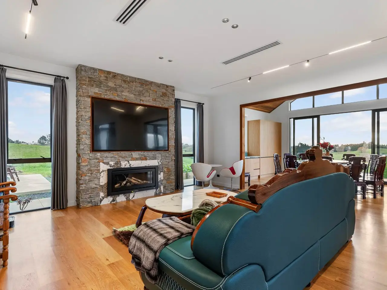 NORTHERLY DECKS - SCENIC CITY LIGHTS Completed in December 2024 (CCC issued April 2025), this elevated north facing home, built of EZ panel cladding (concrete panels) with colour steel roof and feature stone exterior accents, this superb 570 square metre home plus 64 square metre minor dwelling (635 m2 total approx) set on 3.13 hectares (7.83 acres) zoned Country Side Living boasts sweeping views over rolling countryside to the distant night lights of the city. Excellent design by LW Architecture Ltd is complemented by quality construction by Kea Building Ltd. Brand sparkling new, landscaping is yet to be done which will of course, reflect the new owners botanical preferences. Double door entry leads into a spacious foyer with a high pitched Cedar ceiling and stunning hand painted feature wall. Engineered Oak flooring, 3 metre ceilings and 2.4m high doors, cameras and alarms, wiring for wi-fi connectivity, fibre optic internet and ducted air conditioning throughout are just a few of the comfort inclusions in this ultra-spacious sophisticated residence. The foyer leads to expansive, light-filled open plan living anchored by a high-end kitchen featuring premium Miele appliances, including both steam and conventional ovens, as well as a warming drawer. It also boasts an AEG induction hob, Bosch dishwasher, granite waterfall edge island bench, and a Vintec wine fridge. The butler’s pantry is equally impressive with microwave oven, gas hob and blue glass splash-back. Abundant window walls open to covered and open Kwila decks which stretch across the full side of this home (totaling 55 square metres approx) providing scenic venues for stylish entertaining and lazy day leisure in the Alpine swim spa and the sauna. The kitchen spills into a sumptuous family room with feature stone-surround gas fireplace and adjoining formal dining. Off the casual dining double doors open into a luxurious media room with galaxy ceiling and feature lighting, built in speaker system, projector, built in bar and all media equipment – also the perfect karaoke venue. Adjoining this space is another living area with a high pitched Cedar ceiling that opens out to covered alfresco recreation. Also on this side of the home is a multi-use living room and two bedrooms with built-in wardrobes, one opens to the outdoors. You'll also find an office and a bathroom on this side. Additionally, there is a separate powder room and a well-equipped laundry. Hallway’s end gives access to a three car garage with marine carpet and extra-large insulated doors. Off the opposing side of the foyer, two bedrooms with walk-in robes and sliding doors flow out to the northern deck. These are separated by a bathroom with dual vanities. Off a small hall, the magnificent super-spacious master bedroom which opens out to a covered deck features two walk in robes, built in storage, make up station and an ensuite with double Englefield spa bath, electric mirror, double vanity and smart toilet. Yet another bedroom here, also with walk-in robe and ensuite, has an adjoining study area, making a total of six superbly appointed bedrooms in this expansive home of supreme comfort. Separate self-contained living, perfect for extended family or guests, is spacious and classy comprising open plan living, dining and kitchen, a powder room, bathroom with two vanities and two bedrooms with built-in wardrobes. Incredibly spacious, exceptionally designed, superbly appointed and scenic located, this admirable residence awaits inspection by the discerning buyer. • Elevated ultra-spacious 570 m2 (approx) main house + • 64 m2 minor dwelling (635 m2 total) north facing home on 3.13 ha. • Completed in December 2024 (CCC issued April 2025) • EZ panel cladding construction colour steel roof & stone accents • Sweeping rolling country views to the distant city night lights • Engineered Oak flooring, 3 metre ceilings & 2.4m high doors • Cameras & security alarms. Wiring for wi-fi connectivity • Fibre optic internet & ducted air conditioning throughout • Cedar pitched ceiling foyer. Luxe hand painted feature wall • Sundrenched open plan living. Window walls flowing outdoors • North facing Kwila covered & open decks (55 square metres approx) • Scenic, stylish al fresco entertaining. Alpine swim spa & sauna • Sleek dream kitchen + premium quality inclusions & appliances • Formal & casual dining. Deluxe media room & equipment • Separate lounge/dining room + window walls spilling outdoors • Lavish master suite & additions, 2 walk-in robes. Outdoor access • + 5 stylish bedrooms + walk-in or built in robes. Some + outdoor access • Sumptuous media room, feature ceiling, projector & equipment • Office or study room. Laundry plus storage & outdoor access • Multi-use living room. 2 bathrooms plus 2 ensuites. Powder room • 3 car garage with marine carpet & extra-large insulated doors • Free-standing 2 bedroom dwelling + open plan living & bathroom • 12kms to ACG Strathallan Early Learning School, Primary and College • 13kms to Pukekohe Township and just 3kms to Motorway • 32kms to Auckland Airport & 42kms to Auckland CBD