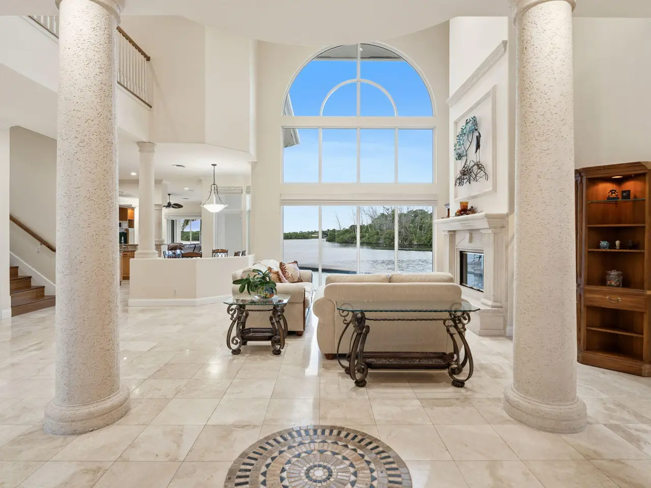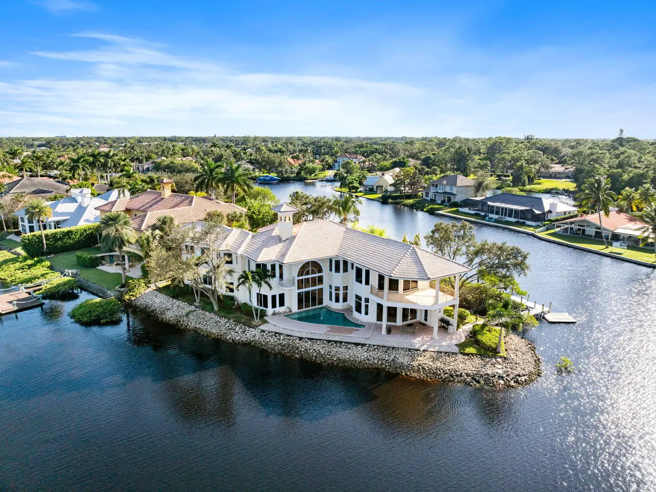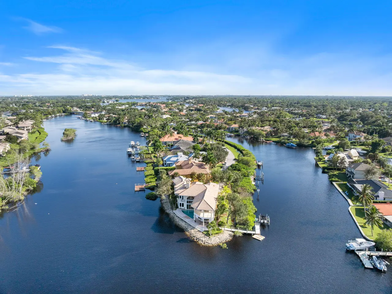 Experience the pinnacle of waterfront living in this extraordinary custom estate, gracefully positioned on a rare point lot at the tip of a private peninsula on the scenic Loxahatchee River. Set within a gated enclave w/ over 400 feet of water frontage, this home offers unmatched privacy & panoramic views of the river & surrounding nature preserve. Designed for those who value timeless architecture & the beauty of natural surroundings, the residence features soaring ceilings & expansive living spaces including 4 large bedrooms, private office w/ coffered ceilings, billiard room, workout room, sunken wet bar & a spacious gourmet kitchen.The primary suite provides a serene retreat w/ coffee bar, private waterfront balcony & sweeping river views. While this original residence invites your personal vision for modern updates, it offers an exceptional foundation of quality craftsmanshipcomplete with marble & bamboo flooring, impact windows, elegant crown molding & exquisite architectural details throughout. Outdoors, enjoy a waterfront pool, dock w/ 9, 000 lb lift & canoe launch & direct ocean accessjust 13 minutes to the inlet by boat. From the daily visits of a myriad of wildlife to the graceful flight of Ibis at sunrise & sunset, every moment here feels like living in your own private nature preserve. This is more than a homeit's a one-of-a-kind riverfront sanctuary, ready to be reimagined into your personal paradise.
