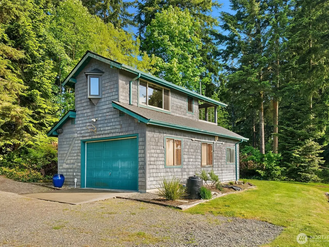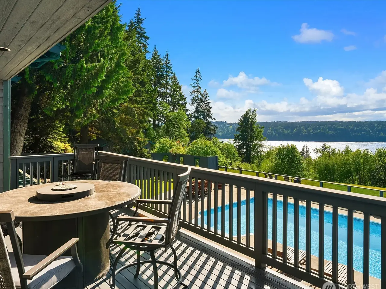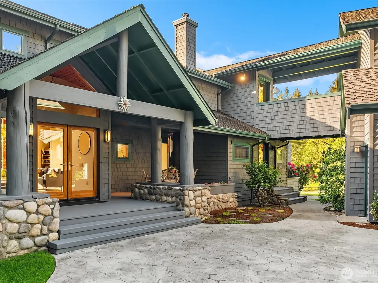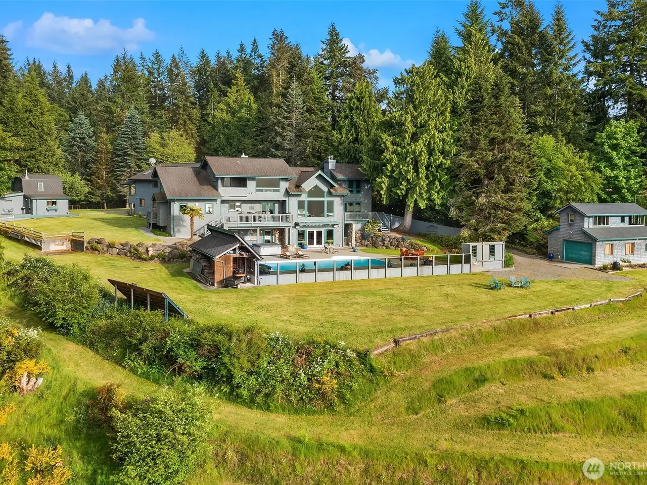 Experience the best of Pacific Northwest living in this stunning 4,000 + sq ft Mountain & Sound view retreat on nearly 5 private acres. This 3 bedroom, 5 bath custom home offers expansive living spaces, soaring ceilings, and breathtaking views from nearly every room. Clear Fir trim & custom cabinetry, stone fireplaces, lower level game/rec room with wet bar & wine cellar. Primary suite has its own access stair & balcony. Enjoy summer entertaining with a large in-ground pool and spacious patio. Two detached dwelling units provide flexible options for guests or rental income. Huge shop offers space for hobbies, storage, or business use. A rare opportunity to own a private oasis just minutes from town, with room to live, work, and play.