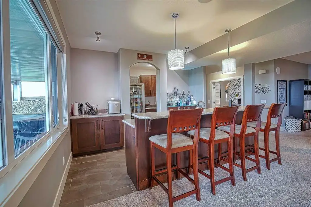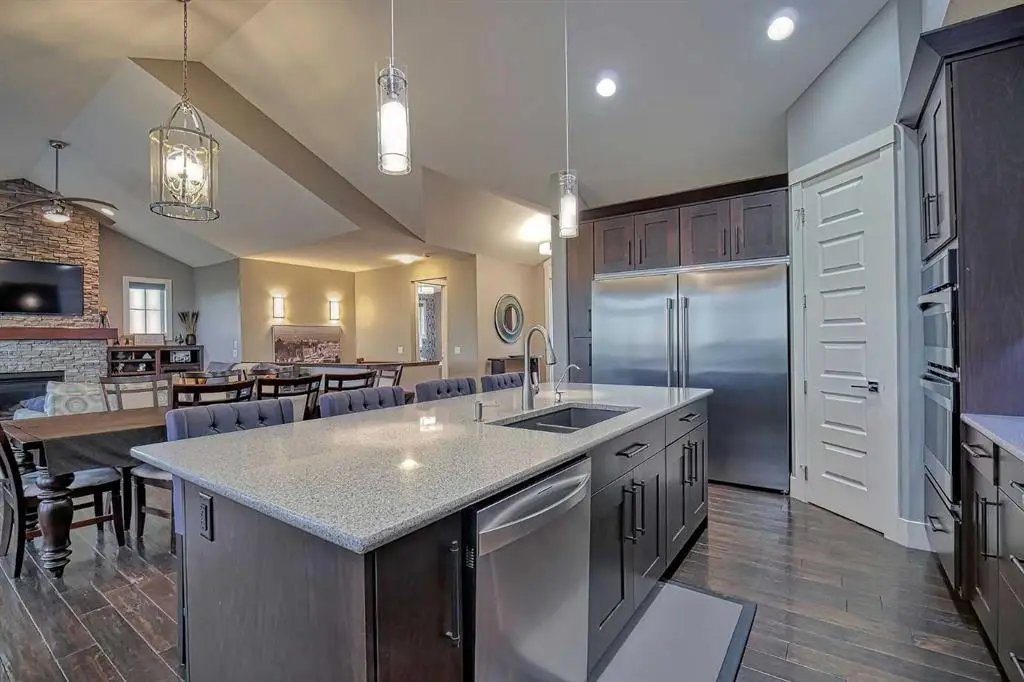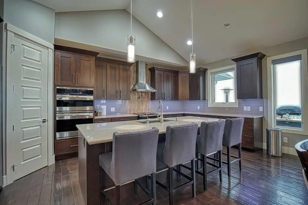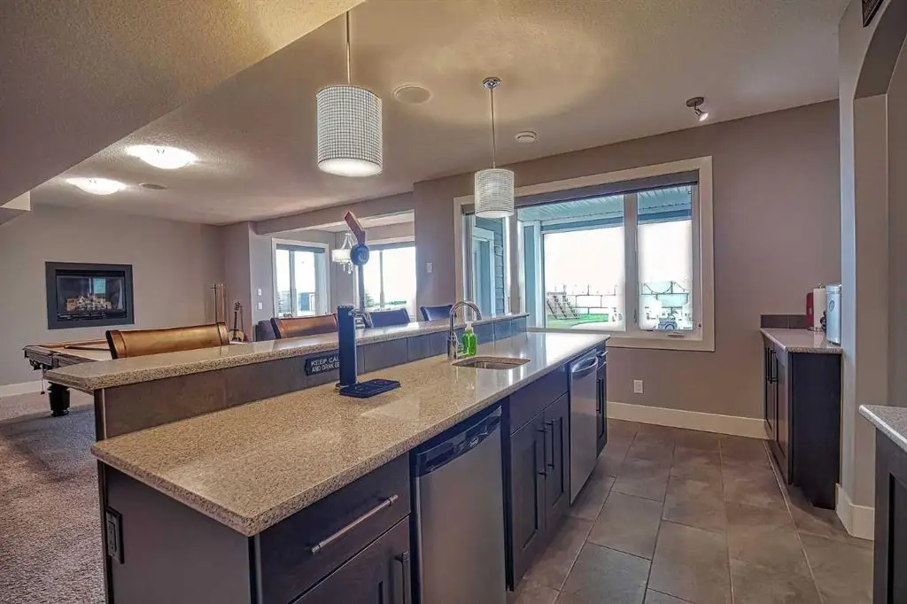 This stunning home was dreamed up and designed with no expense spared. From the moment you enter through the automated gates and follow the paved driveway, the quality is undeniable. Hardy Board siding, a triple garage, Gemstone lighting, and a warm, inviting front porch set the tone. Step into the spacious foyer, complete with its own walk-in closet, and prepare for a WOW moment as the home opens up with light, expansive windows, and breathtaking views. The kitchen, breakfast bar, dining area, and living room share an open-concept design, so no matter where you are, you’re part of the conversation. A floor-to-ceiling brick fireplace with built-ins on both sides anchors the living room beneath soaring 10’ ceilings. The dining area easily accommodates a large table, while the breakfast bar and all countertops gleam with high-quality quartz. The built-in fridge and freezer combo is a generous in size, complemented by two ovens including a built-in microwave, a gourmet gas range with another oven, and a convenient pasta faucet. Hand-scraped hardwood floors add sophistication while maintaining a cozy, farm-inspired feel.This thoughtfully designed kitchen offers expansive quartz counters, abundant cabinetry, and a hidden gem — a walk-through butler’s pantry, providing even more space for your culinary essentials. Double doors open to a spacious deck, perfect for lively gatherings or quiet evenings soaking in the peaceful farm views. In the primary suite, expansive windows frame the rolling landscape, making the view a part of the room itself. A gas fireplace flickers warmly on cooler nights, while a French door leads you directly to the patio for a breath of fresh country air. The luxurious 5-piece ensuite offers a spa-like retreat — a deep soaker tub set beside the fireplace invites indulgent baths, while double sinks, a generous walk-in shower with built-in seating, and a private water closet provide both comfort and function. The grand walk-in closet offers ample space to keep everything perfectly organized. The Main floor features a second bedroom that provides guests or family with their own retreat, complete with a walk-in closet and an elegant 4-piece ensuite. The hall area includes a 2-piece bath, organized laundry room, and mudroom. Downstairs, a media room with a 135” screen and 4K projector is perfect for movie nights. There’s also space for a pool table (negotiable), poker table area and a full wet bar with quartz counters, sink, dishwasher, beer keg with tap, wine storage, and a commercial beverage fridge. This level has two bedrooms with walk-in closets, a 4-piece bath, and a walkout to a covered patio with hot tub, heated above-ground pool, and fire pit. A massive retaining wall ensures privacy, and a shed provides garden storage. There are underground sprinklers. Included are 22 built-in speakers with Control 4 automation, five TVs with mounts, projector and screen & cameras. Come experience Executive Country Living.