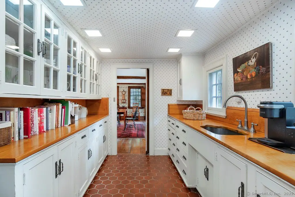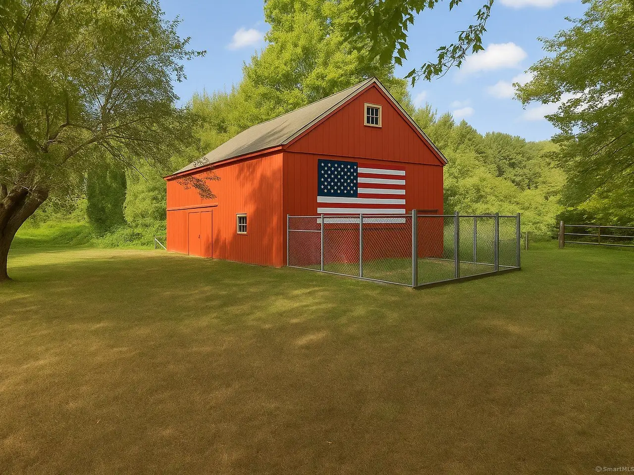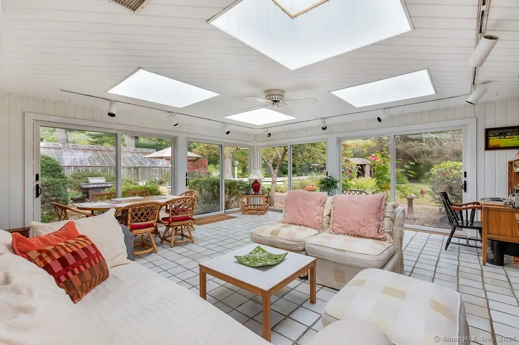 Charming five bedroom, three and a half bath antique Saltbox circa 1706. Originally owned by Nathaniel Parks in North Guilford, the home was lovingly relocated to Woodbridge in 1934. It retains nearly all of its original character, including wide plank floors, hand-hewn beams, and a striking double-leaf entry framed by fluted pillars and a pedimented gable. Thoughtful rear additions, including a gambrel wing with garage, were added during the move. Barn-style garage doors and a welcoming covered breezeway connect the main home to an additional wing. Inside, a fieldstone fireplace serves as the stunning focal point of the living area, complemented by exposed wooden beams that enhance the home's historic charm. The eat-in kitchen opens to a sunlit family room with soaring ceilings, four oversized skylights, and panoramic views overlooking the serene backyard. The primary suite features a full bath with a whirlpool jetted tub. Step outside to a brick patio overlooking 7.7 tranquil acres and a classic barn-perfect for storage. Mature trees, lush landscaping, and a private setting create a picturesque environment. Large windows and a spacious layout provide generous natural light, multiple gathering spaces, and flexible living options-ideal for entertaining or quiet enjoyment. Modern comforts such as central air, natural gas, and public water blend seamlessly with the home's antique appeal. A rare opportunity to own a historic Connecticut treasure full of character, warmth and elegance.