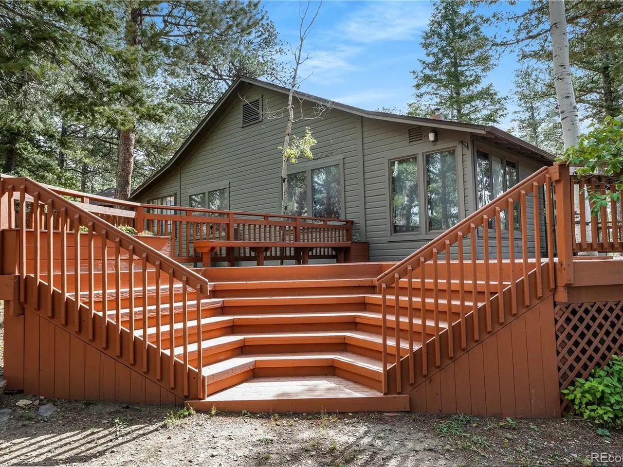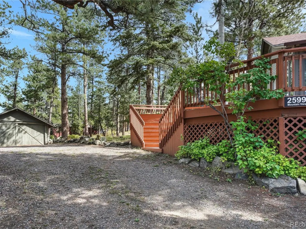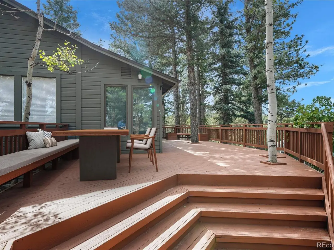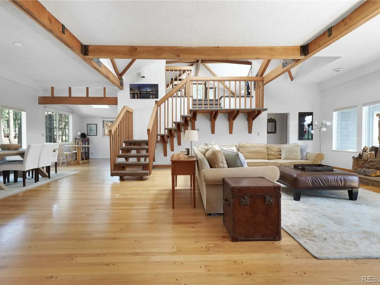 Mount Vernon Home with Mid-Century Flair! This distinctive Mount Vernon home blends mid-century modern architecture with timeless charm. The dramatic great room showcases soaring ceilings, massive wood beams with metal brackets, pegged hardwood floors, a striking stone wood-burning fireplace, and expansive windows and skylights that fill the space with natural light. The open dining area flows seamlessly into the kitchen, featuring vintage parquet flooring. The main-floor primary suite offers his-and-her closets and an en-suite bath, plus two additional main-floor bedrooms featuring large windows framing the treed setting. A vaulted flex/family room upstairs with an incredible vaulted beamed ceiling opens to a private rooftop deckideal for entertaining, working from home, or stargazing. Outdoor living is enhanced with a 1920s gazebo, a spacious front porch, patio and park like .7 acre lot. The lower level provides versatile space for hobbies, a workshop, or extra storage. A detached garage with sliding barn-style doors adds to the charm. Mount Vernon is more than just a place to liveits a way of life thats truly one-of-a-kind with vast open spaces, hiking trails, and abundant wildlife. What also sets Mount Vernon apart is its deep sense of community. As a homeowner, youre not just a resident you become part of the Metro District, a tight-knit group that works together to preserve this special place. The Mount Vernon Canyon Club is at the heart of it, where residents enjoy fine dining, a clubhouse, a pool, tennis courts, and horse facilities. Ralston Elementary is also conveniently located at the edge of the neighborhood. The HOA Fee of $496 includes a Social Membership. Additional membership packages, including aquatic, racquet, sports and community horse facilities, are available for an extra fee.