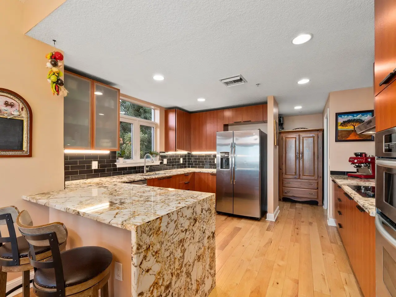• Gourmet kitchen with granite countertops and stainless steel appliances