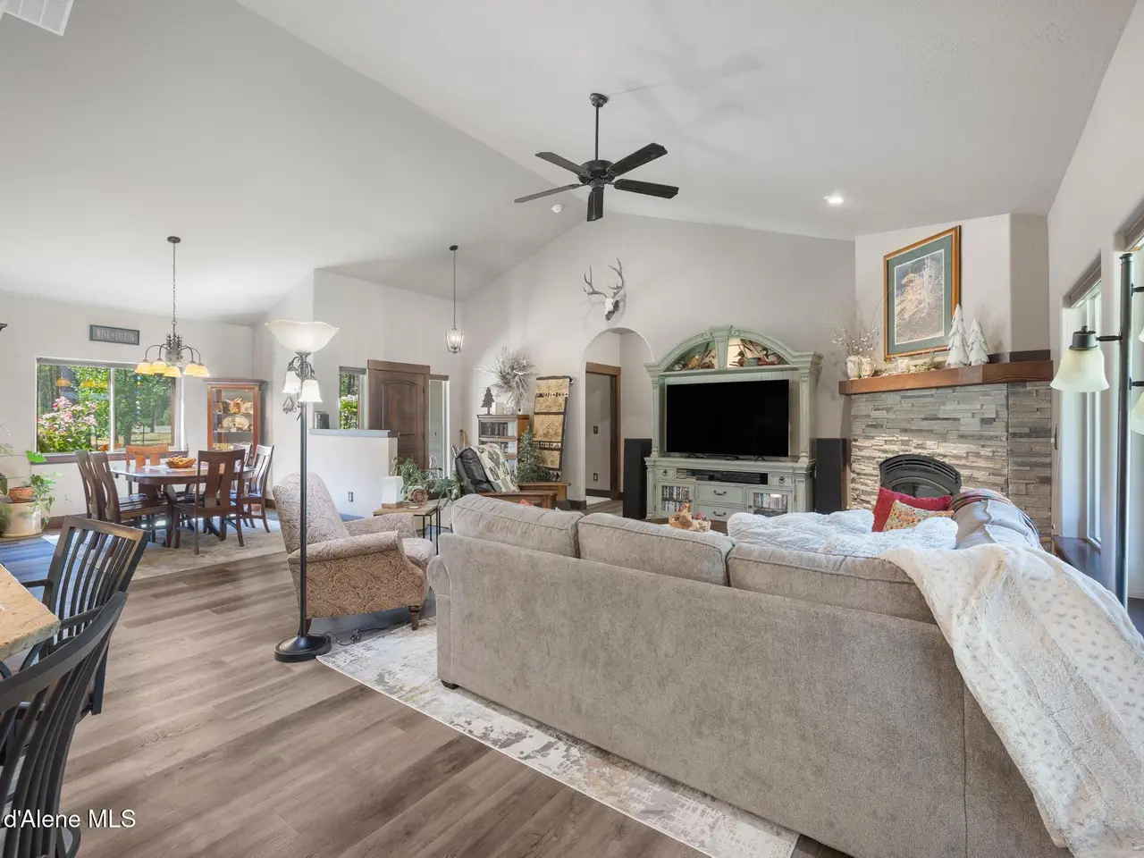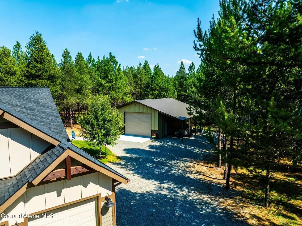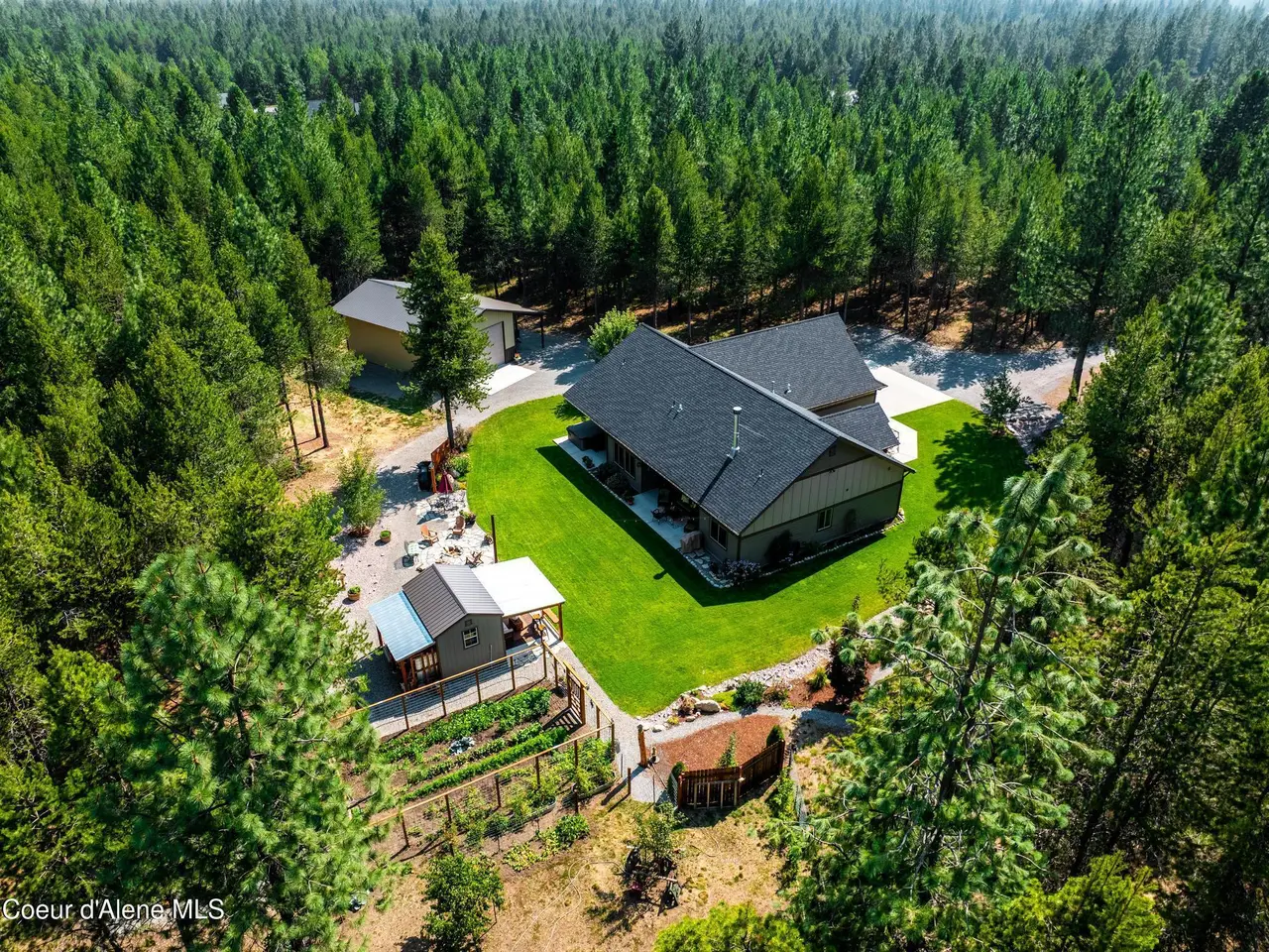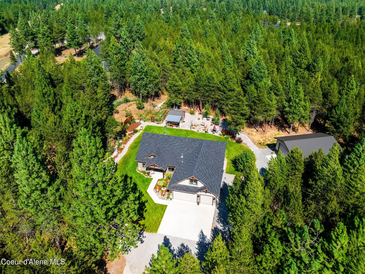 Welcome to Lone Mountain Estates, an exclusive community with five-acre lots, paved roads, and easy access to Coeur d'Alene, Rathdrum, and Spirit Lake. This 2,359 square foot single-level home with bonus room features an open concept, wood-burning fireplace, custom kitchen with stainless gas appliances, wine fridge, granite surfaces and a walk-in pantry. The luxurious master suite offers covered patio access to your hot tub, a spacious walk-in closet, separate vanities, soaking tub, and a beautiful walk-in shower. Additional highlights include vaulted ceilings, covered patio, a versatile bonus/media room and a mudroom/laundry room with sink. Finally, a large 24x40 shop with 12x40 leanto and 14' doors and RV parking complete this residence. The property grounds are manicured with outdoor living space, a luscious fenced in 20'x32' garden with irrigation, fire pit, storage shed and barbecue area, making it an entertainers dream. This exclusive location has a private drive offering solitude like no other in the neighborhood.