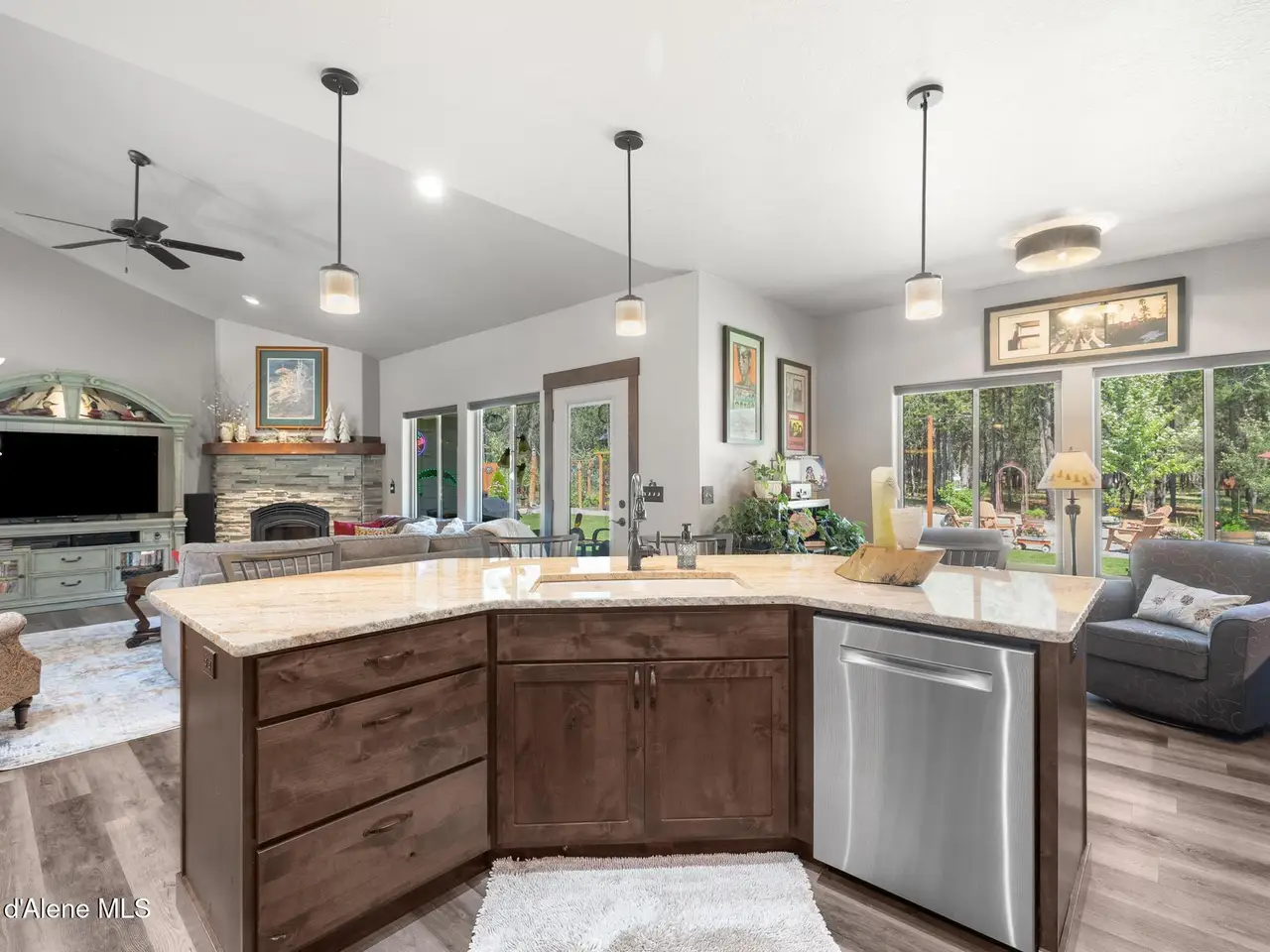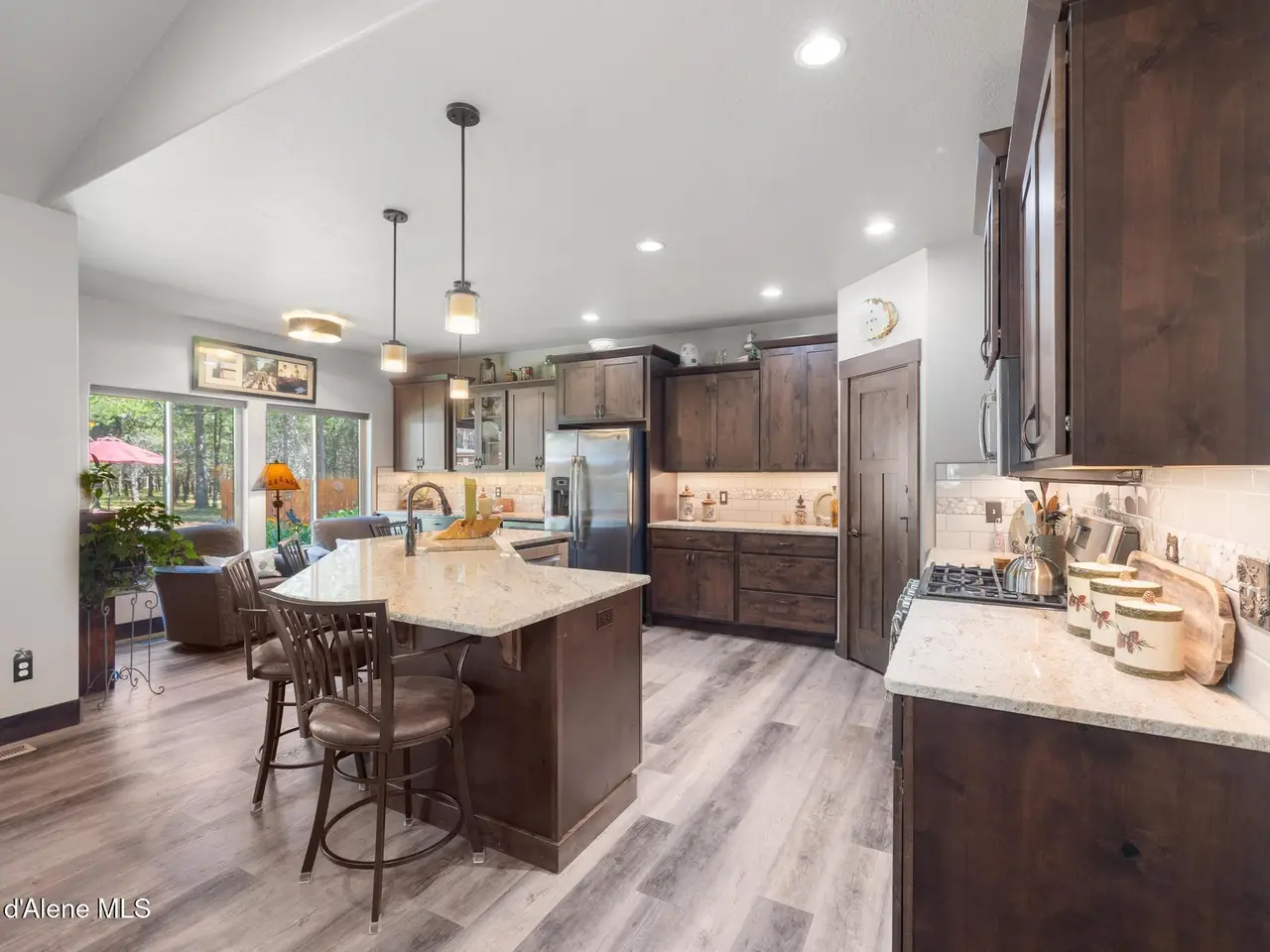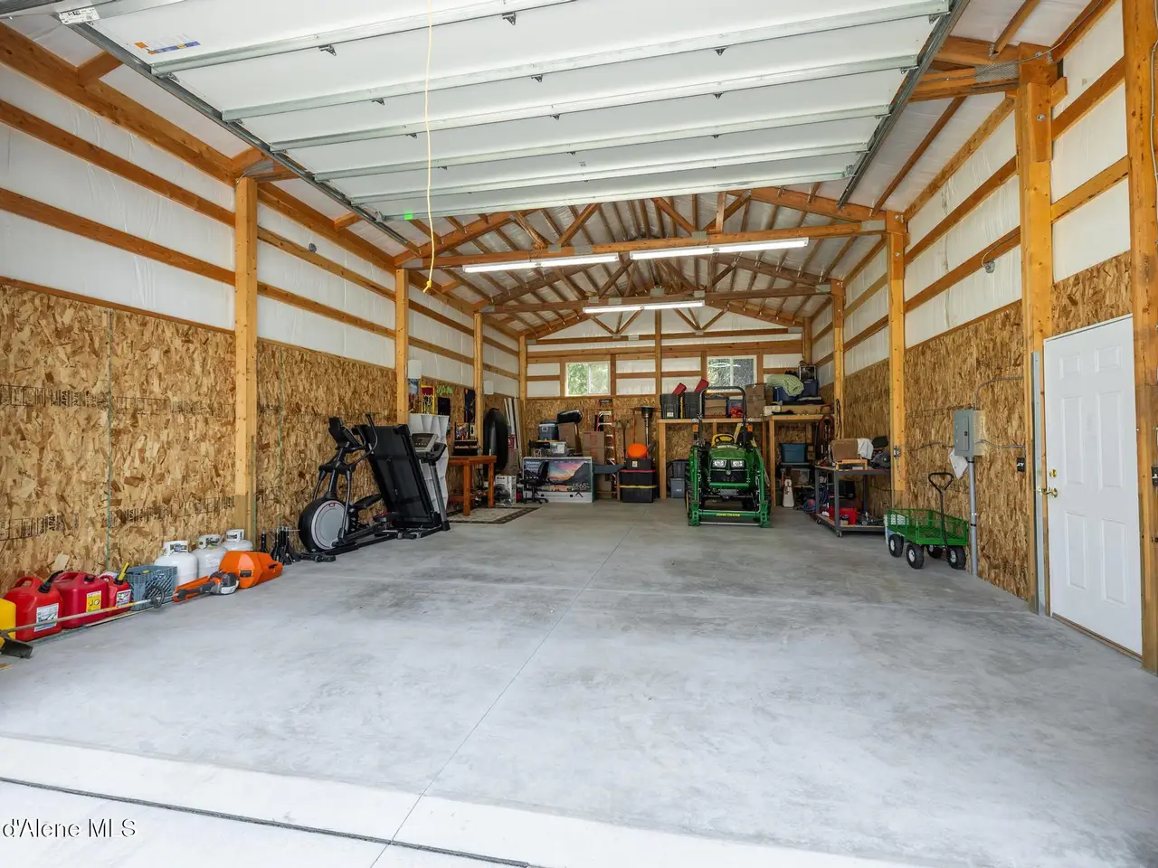 Welcome to Lone Mountain Estates, an exclusive community with five-acre lots, paved roads, and easy access to Coeur d'Alene, Rathdrum, and Spirit Lake. This 2,359 square foot single-level home with bonus room features an open concept, wood-burning fireplace, custom kitchen with stainless gas appliances, wine fridge, granite surfaces and a walk-in pantry. The luxurious master suite offers covered patio access to your hot tub, a spacious walk-in closet, separate vanities, soaking tub, and a beautiful walk-in shower. Additional highlights include vaulted ceilings, covered patio, a versatile bonus/media room and a mudroom/laundry room with sink. Finally, a large 24x40 shop with 12x40 leanto and 14' doors and RV parking complete this residence. The property grounds are manicured with outdoor living space, a luscious fenced in 20'x32' garden with irrigation, fire pit, storage shed and barbecue area, making it an entertainers dream. This exclusive location has a private drive offering solitude like no other in the neighborhood.