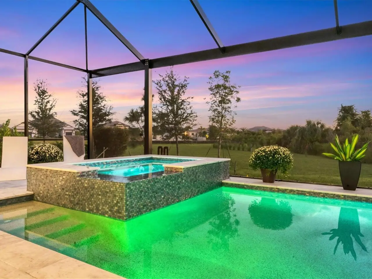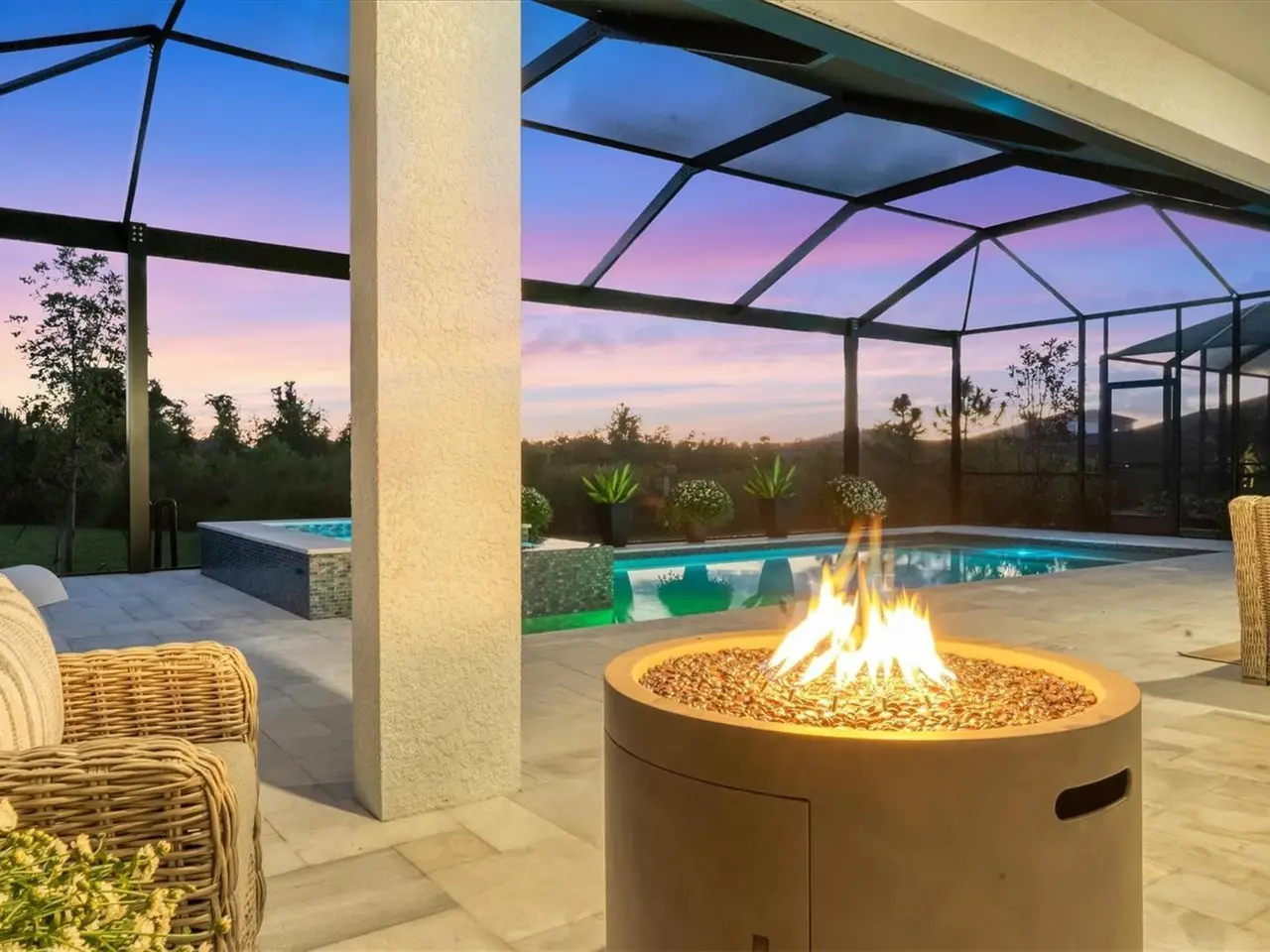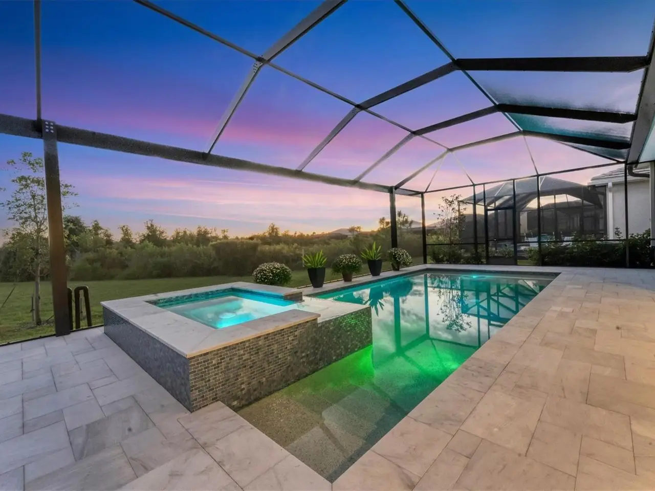 Travertine tile lanai with natural preserve backdrop