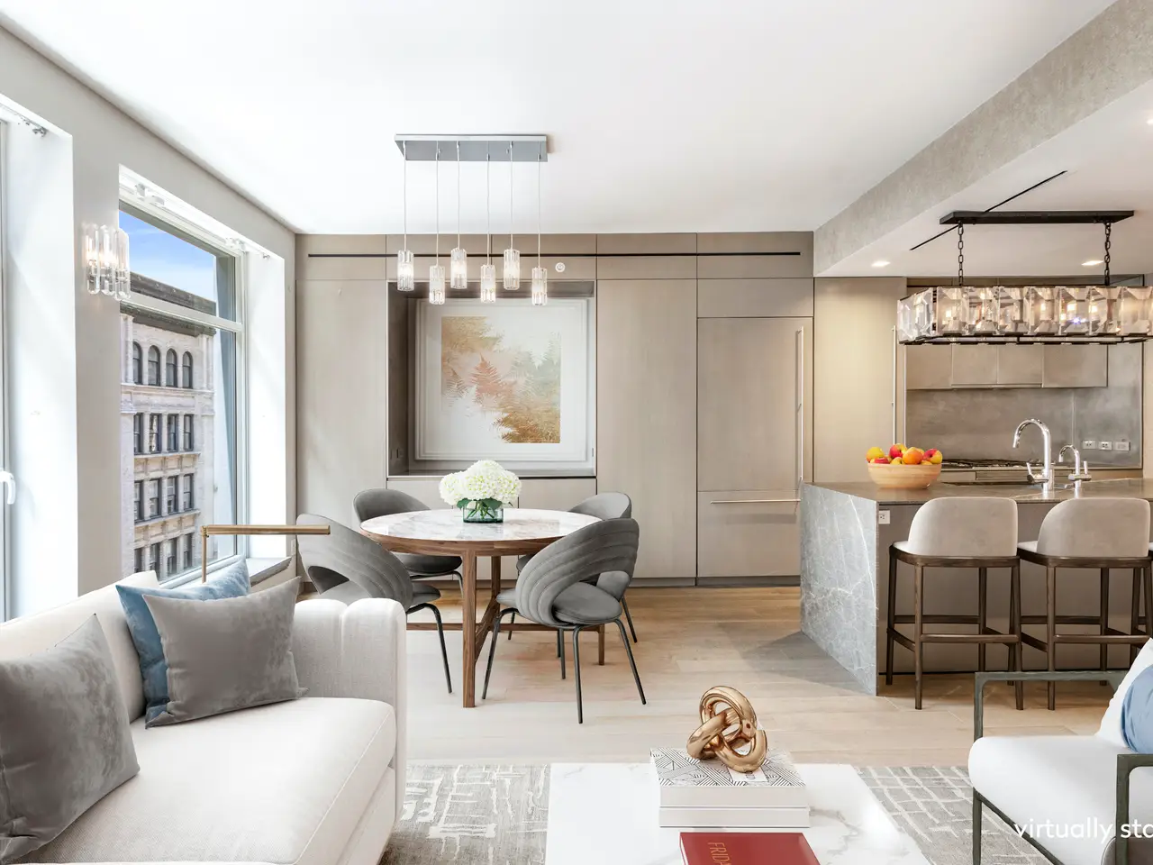This stunning, near-mint condition 2-bedroom 2-bathroom apartment occupies a full-floor in a boutique, designer doorman building in prime and coveted Flatiron area. Residence 5 at 21 West 20th Street is the pinnacle of luxury living with a vast array of high-end finishes, modern conveniences throughout, and low taxes thanks to a 421a abatement. Enter directly off of the elevator and be drawn toward the open living area with enormous floor-to-ceiling windows and picturesque vistas of West 20th Street and the gorgeous prewar architecture across the street. Light pours in from the South, bathing the room in sun. The living/dining area has been outfitted with an elaborate array of built-ins that provide an abundance of storage space as well as a murphy bed that has been thoughtfully concealed in the entertainment center. An immaculate chef's eat-in kitchen has seen minimal use and is clad in a beautiful mix of white oak and stainless steel custom cabinetry, olive marone marble countertops and a stainless steel backsplash. The top-of-the-line Miele appliance suite offers a 4-burner gas stove and oven that vents to the exterior, integrated 36" refrigerator with double freezer drawer and ice maker, dishwasher and concealed integrated microwave. Rounding out the kitchen is a Julien sink with Grohe fixtures including an instant hot/cold purified water faucet as well as garbage disposal. The adjacent dining area features an additional Marvel wine fridge and custom storage. The bedrooms are secluded and in the northern wing of this immaculate residence. The primary suite is well-proportioned with all custom closetry and en-suite full bath finished in Novelda Cream Limestone flooring and driftwood marble surround on the oversized vanity and glass-enclosed soaking tub. The second bedroom features a custom walk-in closet with sliding barn door and utilizes the second full bathroom located in the hallway. The second bathroom is beautifully appointed with glass tiles in the second glass-enclosed soaking tub, Caesarstone quartz vanity countertop and off-white porcelain tiled floor. Additional conveniences include central AC, in-unit washer/dryer by Bosch, in-unit refuse chute, a robust AV system by Cave Group and gorgeous rift-cut white oak floors that run throughout the apartment. Consisting of 13 full-floor residences, 21 West 20th Street is a sleek and handsome boutique luxury condominium designed by famed interior architect David Mann of MR Architecture Dcor and WELL and LEED certified. Residents enjoy the service of a 24-hour doorman, gorgeous resident lounge, and spacious outdoor garden with seating areas. There is refrigerated storage for grocery deliveries as well as central laundry, pet wash room, and bike storage. Perfectly situated between Fifth and Sixth Avenue, 21 West 20th Street is close to the finest in Flatiron shopping, entertainment and dining experiences, and minutes away from Union Square and a plethora of transportation options. Pets are welcome. 421a tax abatement in place until July 2023.