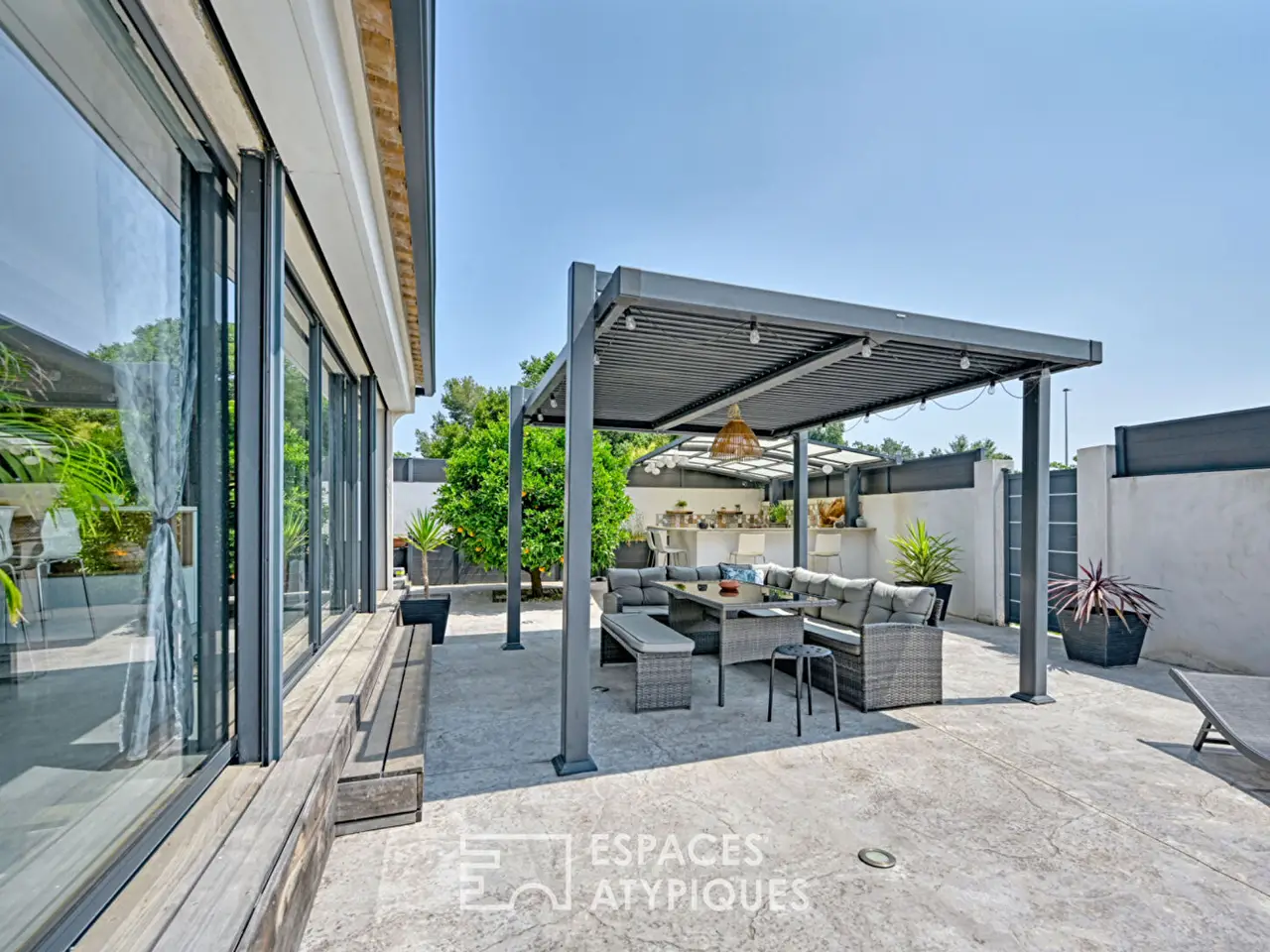 Located in Lattes, close to the center and just minutes from Montpellier, this 1970s detached house spans 170 sqm on two levels, nestled in a privileged natural environment. Built on a landscaped plot of 675 sqm with no overlooked views, it offers four bedrooms, two bathrooms, a 70 sqm living space, a 25 sqm closed garage, and several outdoor parking spaces. The entrance opens onto a living room bathed in light thanks to a 7-meter bay window, reinforcing the in & out feel. The living room with a wood-burning stove, the dining room, and the kitchen are arranged in a fluid volume. Accessible from this level, a relaxation area with its jacuzzi allows you to enjoy a completely intimate and quality space. A laundry area completes the ground floor, as well as a separate toilet and direct access to the garage. The first half-level houses two bedrooms and a bathroom with toilet. Upstairs, a 35 sqm master suite features a dressing room, a refined bathroom, and a private terrace overlooking the surrounding nature. A fourth bedroom completes this level. The entire property is air-conditioned thanks to a ducted system in the bedrooms. Outside, the fully enclosed garden reveals several ambiances conducive to relaxation: a high-quality saltwater swimming pool, a bioclimatic pergola, a summer kitchen, and carefully landscaped shaded areas. The entrance to the property, understated and elegant, announces the attention paid to every detail. The green surroundings, the proximity of the horses, and the absence of vis-a-vis reinforce the feeling of a special place. The property has many high-end features: solar panels, anthracite gray joinery, a home automation system, interior and exterior lighting to enjoy different atmospheres, a quality landscaped garden and many others: This contemporary house with discreet charm combines modern comfort, quality materials and a living environment. ENERGY CLASS: B - 77 / CLIMATE CLASS: A - 2 Estimated average amount of annual energy expenditure for standard use, established from energy prices for the years 2021, 2022, 2023: between EUR650/year and EUR879/year. Information on the risks to which this property is exposed is available on the Georisques website for the areas concerned. Additional information * 5 rooms * 4 bedrooms * 1 bathroom * 1 bathroom * Outdoor space : 700 SQM * Property tax : 2 950 € Energy Performance Certificate Primary energy consumption b : 77 kWh/m2.year High performance housing