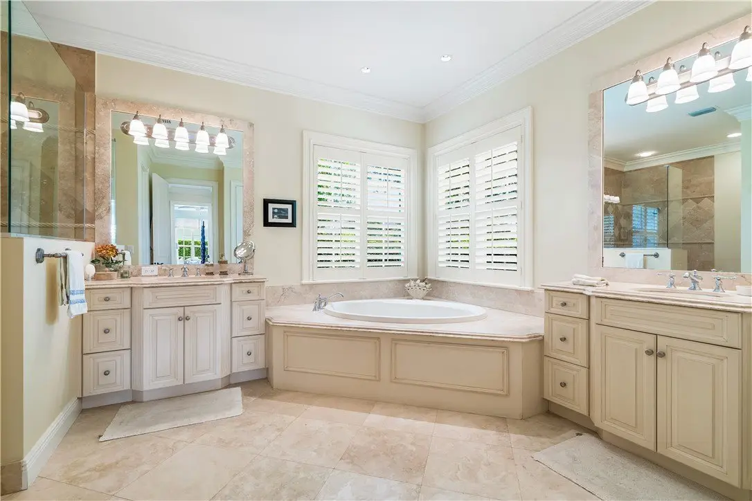 Meticulously maintained Hamilton plan traditional 3 bedroom+study on generous .38 acre super private cul-de-sac lot. Delightful SE exposure outdoor living space. Lush yard, lg heated pool/spa, covered lanais. First floor primary suite. Downstairs study with pool access bath. Updated kitchen opens to family rm. Dining rm overlooks courtyard. Living rm w/ wet bar and fireplace. Upstairs 2 en suite guest rooms open to gracious balcony. Rich detailing. Impact glass + shutters. Big laundry rm, 2 car garage. Fabulous Palm Island amenities- beach club, pier, pools, fitness. Dimensions approximate.