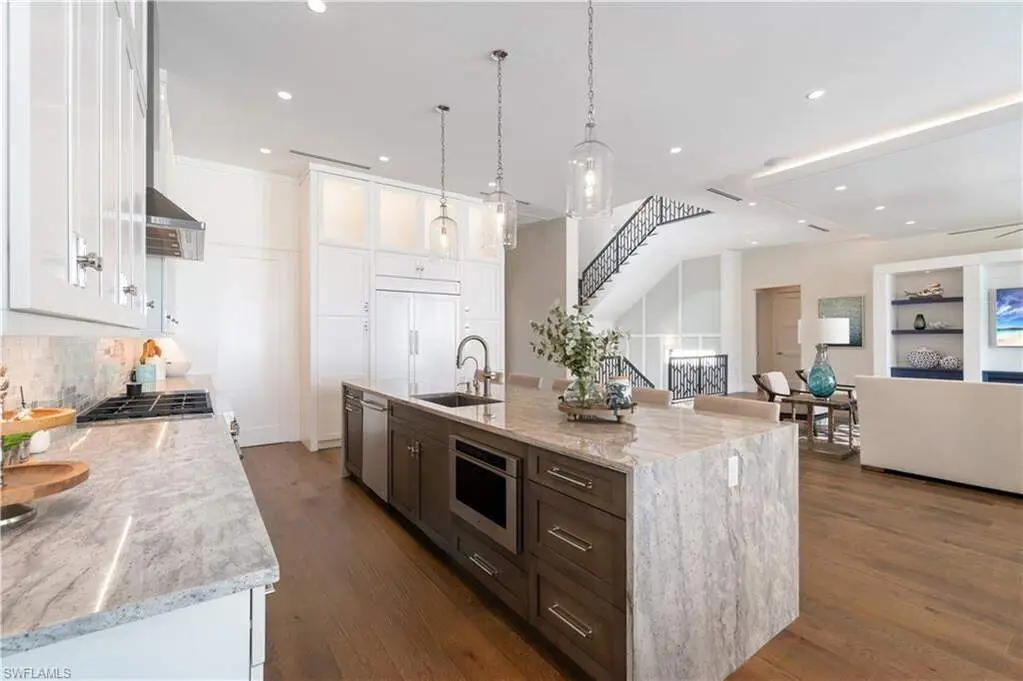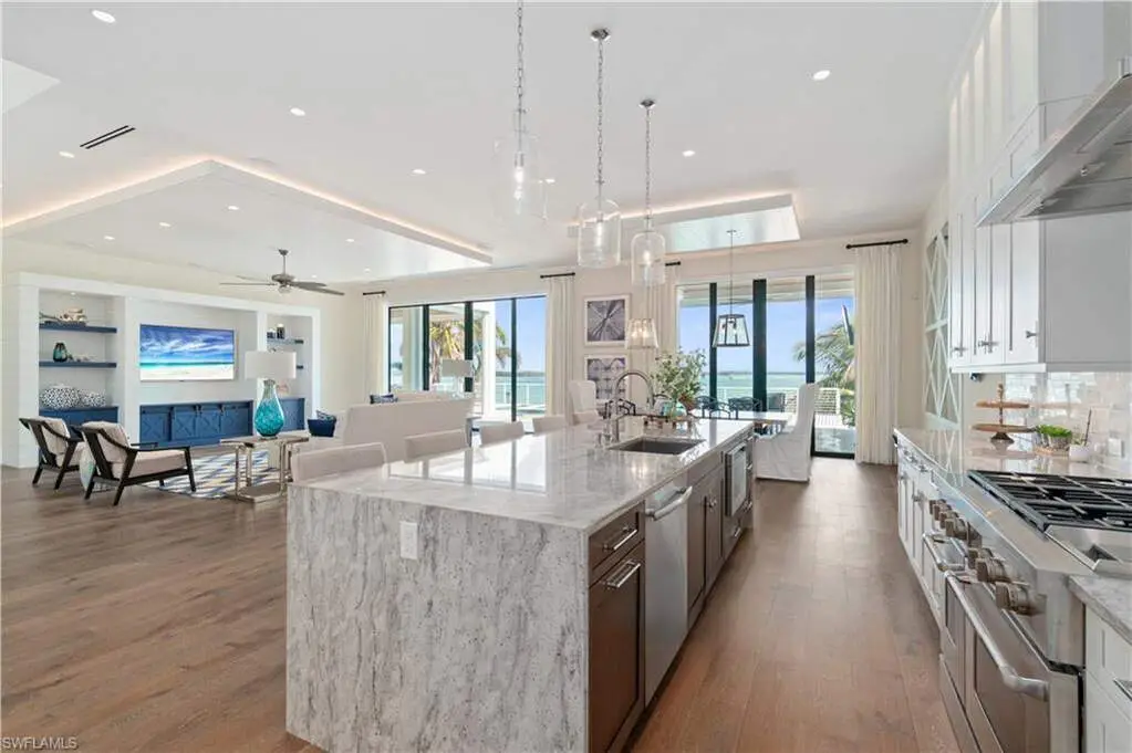 Exceptional 2019-built masterpiece on the coveted South end of Estero Island. Offering some of the most expansive and breathtaking bay views the island has to offer, this residence is the epitome of coastal luxury living. A haven for boating enthusiasts, it boasts direct access to the Gulf with just a two-minute boat ride. The property features a private dock, a 12,000 lb boat lift that previously accommodated a 40-foot boat, and a jet ski lift. Located just a 7-minute (0.3-mile) stroll from deeded beach access exclusive to a limited number of South end bayside residents, this home is perfectly positioned for both beach and boat lovers. No details were overlooked while meticulously crafting this architectural marvel, from beautiful oak flooring to inverted tray ceilings with custom lighting. Inside, the expansive open layout includes 4 spacious bedrooms, 4 full bathrooms, 2 half-baths, dual laundries, and a garage that has ample space for 6+ cars. Step outside to your own backyard oasis, where an expansive pool deck awaits, featuring an elevated pool with a sun shelf, spa, a fireplace, a summer kitchen, a pool bath, and a bar area with swinging chairs and seating - perfect for entertaining or relaxing. The gourmet chef's kitchen is equipped with high-end granite waterfall countertops, sleek white cabinetry, premium Jenn-Air appliances, and a butler's pantry. The luxurious primary suite offers sweeping Bay views, a private lanai, dual walk-in closets, and a spa-like bathroom with dual vanities, a freestanding tub, and a shower with multiple shower heads for ultimate relaxation. Additional features include a whole-house filtration system, a 500 lb buried propane tank, a private elevator, hurricane impact windows and sliders, electric storm shutters, interior electric screens, a Lutron lighting system, and a surround sound system. Prime location on a peaceful stretch of South Estero Island close to many fantastic restaurants and easy access to Lovers Key/Bonita Beach. This is the pinnacle of waterfront living.